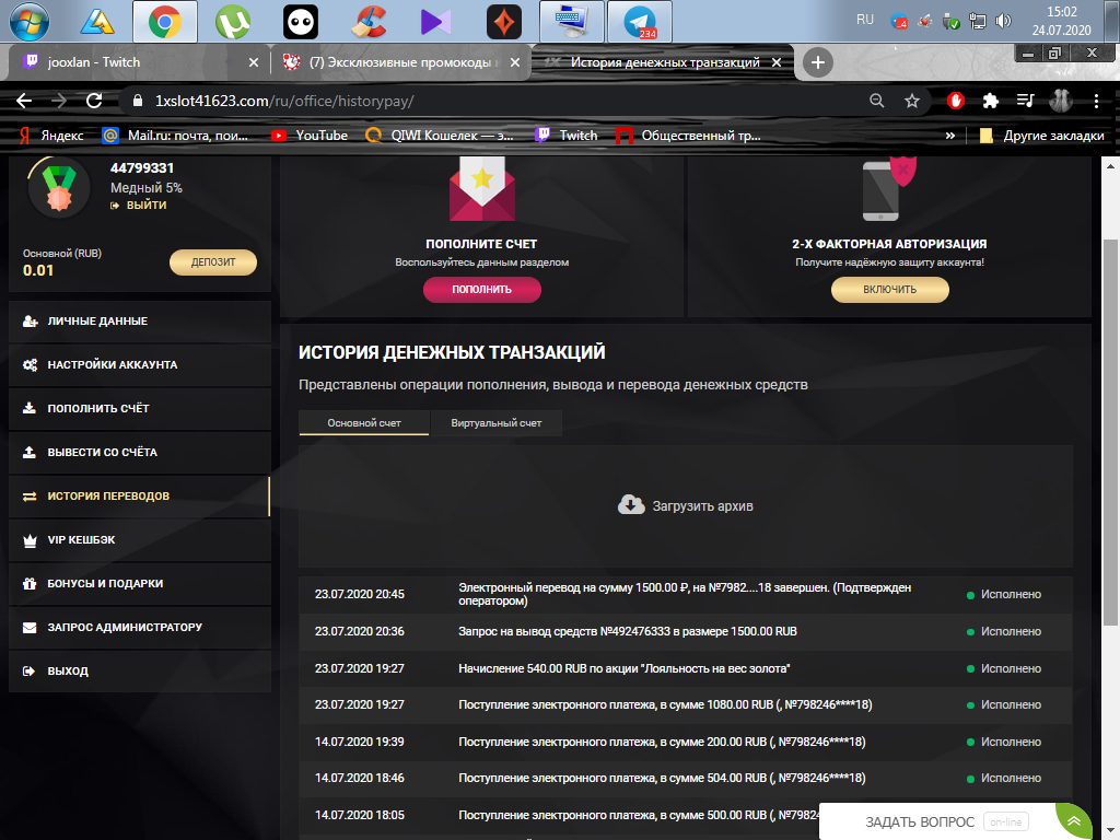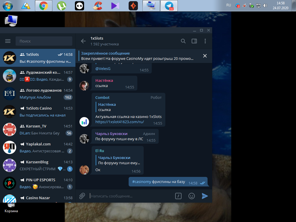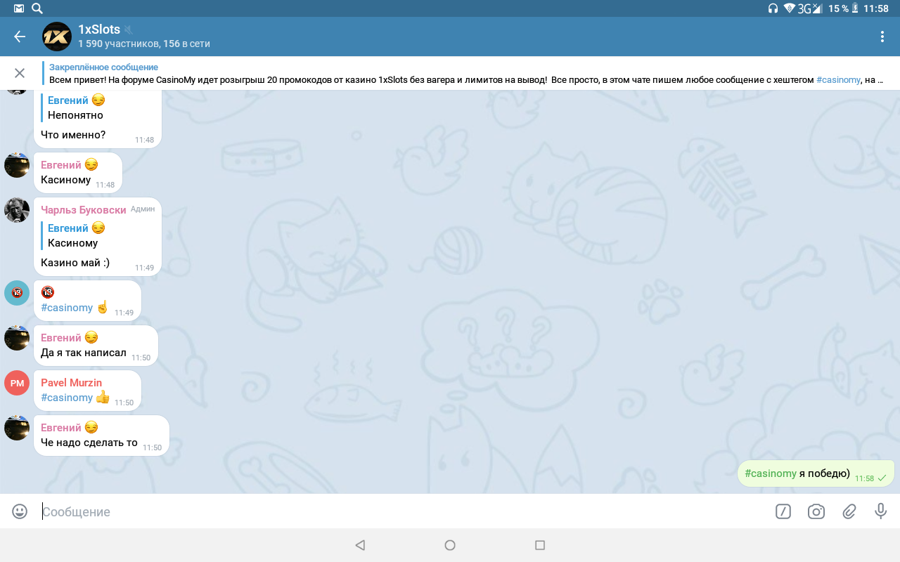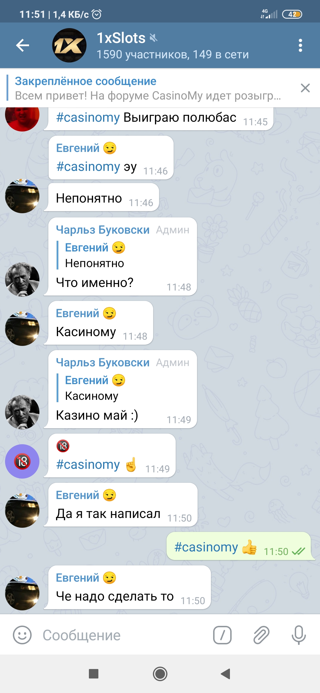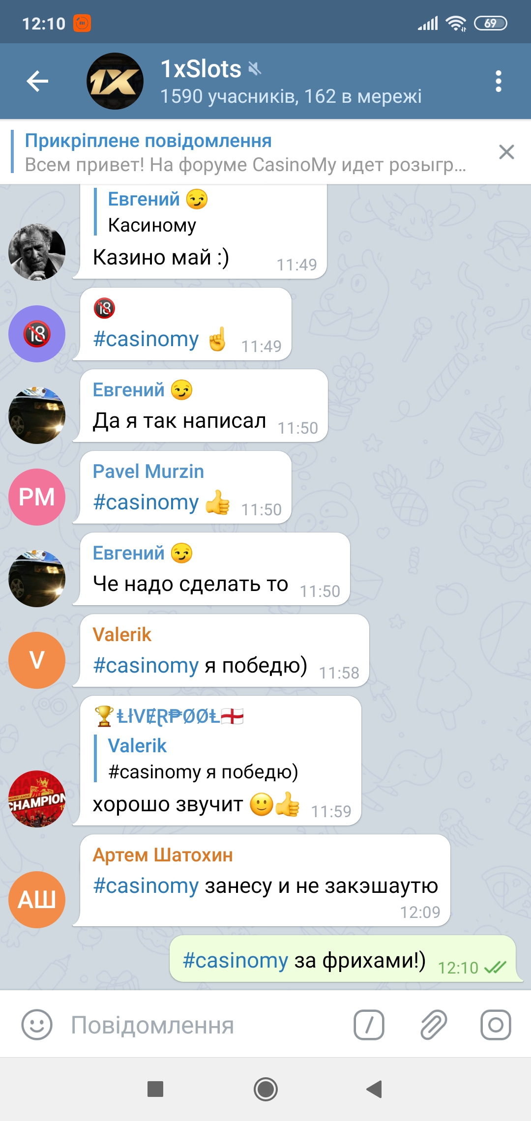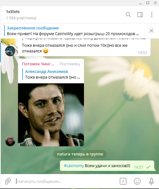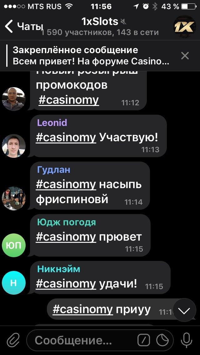 2) Быть подписанным на телеграмм канал казино 1xSlots https://t.me/onexslots и чат https://t.me/xslotschat, в телеграмм чате https://t.me/xslotschat написать любое сообщение с тегом #casinomy и разместить текст этого сообщения в этой теме вместе со скрином депозита.