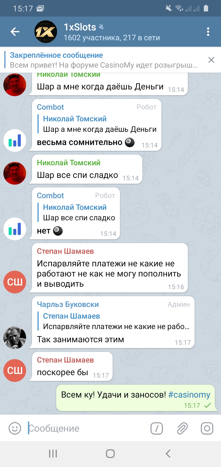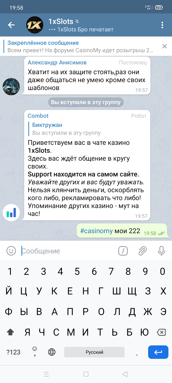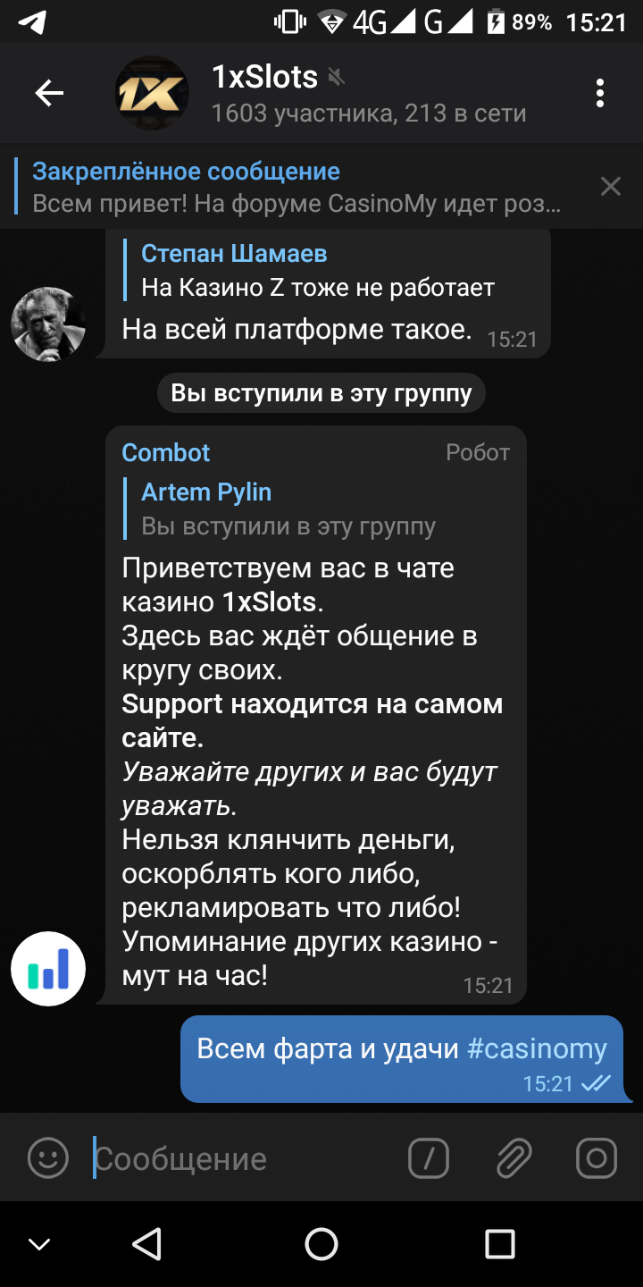 2) Быть подписанным на телеграмм канал казино 1xSlots https://t.me/onexslots и чат https://t.me/xslotschat, в телеграмм чате https://t.me/xslotschat написать любое сообщение с тегом #casinomy и разместить текст этого сообщения в этой теме вместе со скрином депозита.