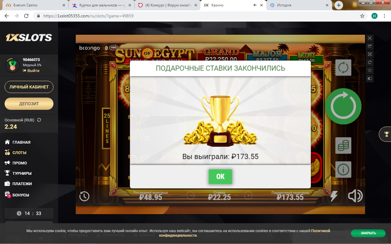 50 FS - Суммарное количество активаций промокода - 450, вагер х25, отмыв в течение недели за свои монетки. Ставки в слотах от Microgaming и Kalamba не учитываются при отыгрыше. Перед отыгрышем советуем проверять список запрещенных игр.