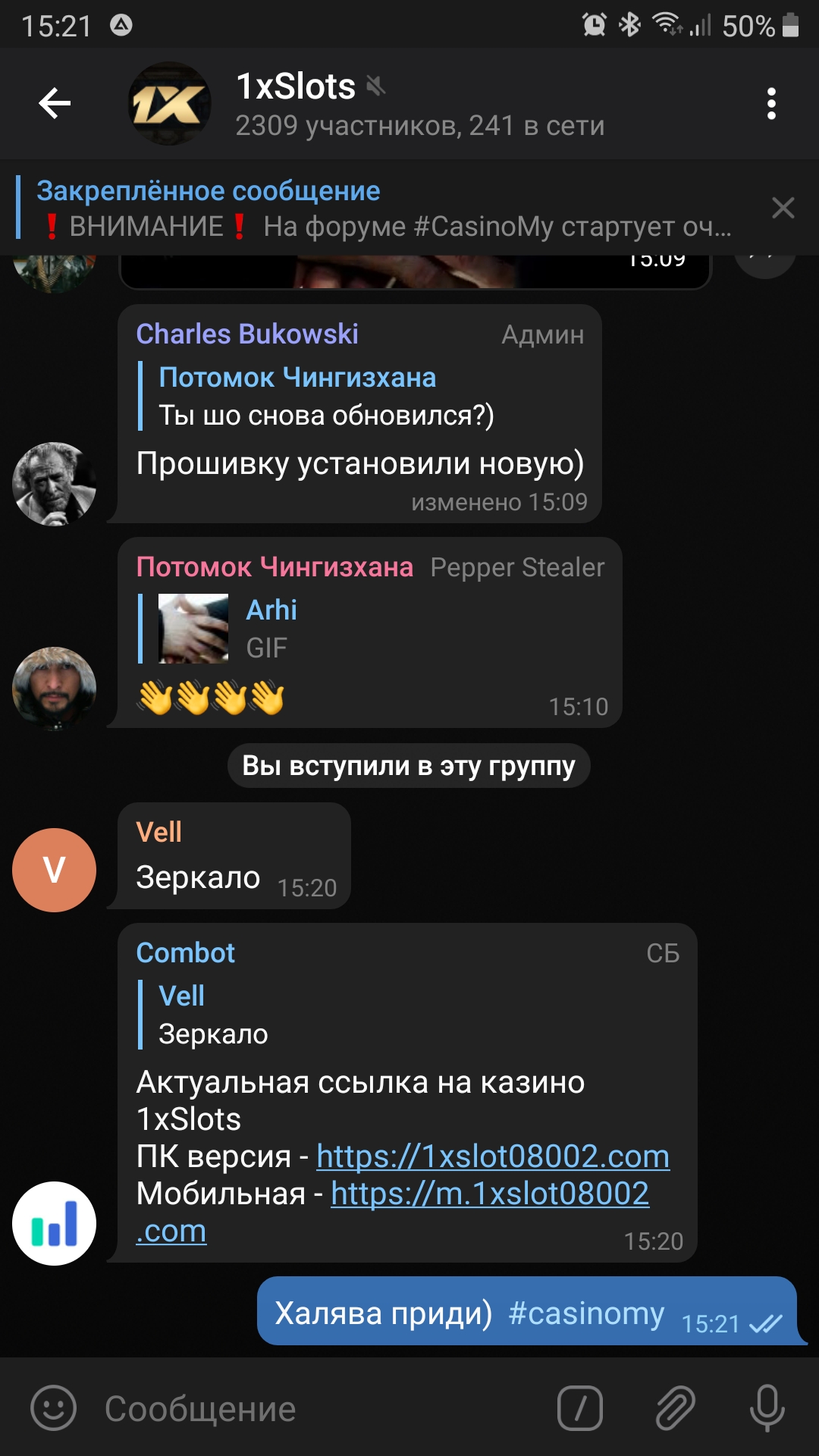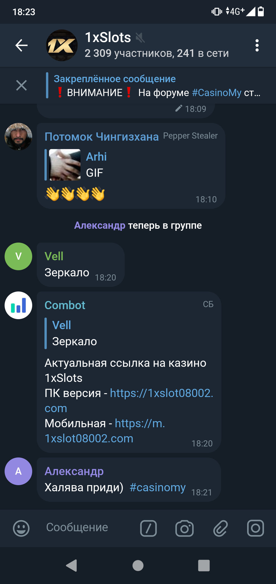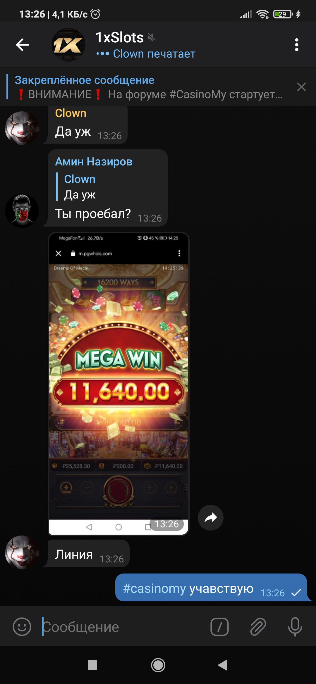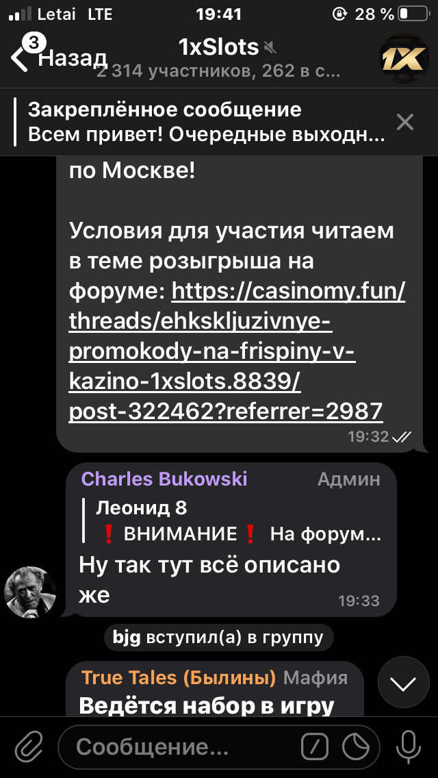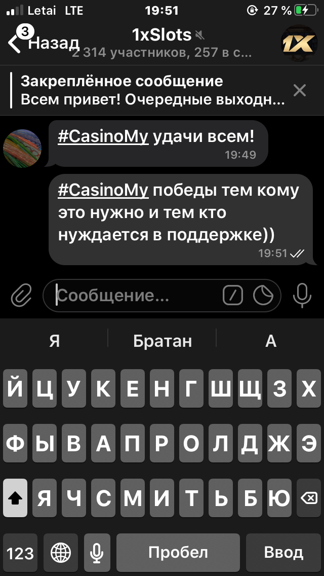 2) Быть подписанным на телеграмм канал казино 1xSlots https://t.me/onexslots и чат https://t.me/xslotschat, в телеграмм чате https://t.me/xslotschat написать любое сообщение с тегом #casinomy и разместить текст этого сообщения в этой теме вместе со скрином депозита.
