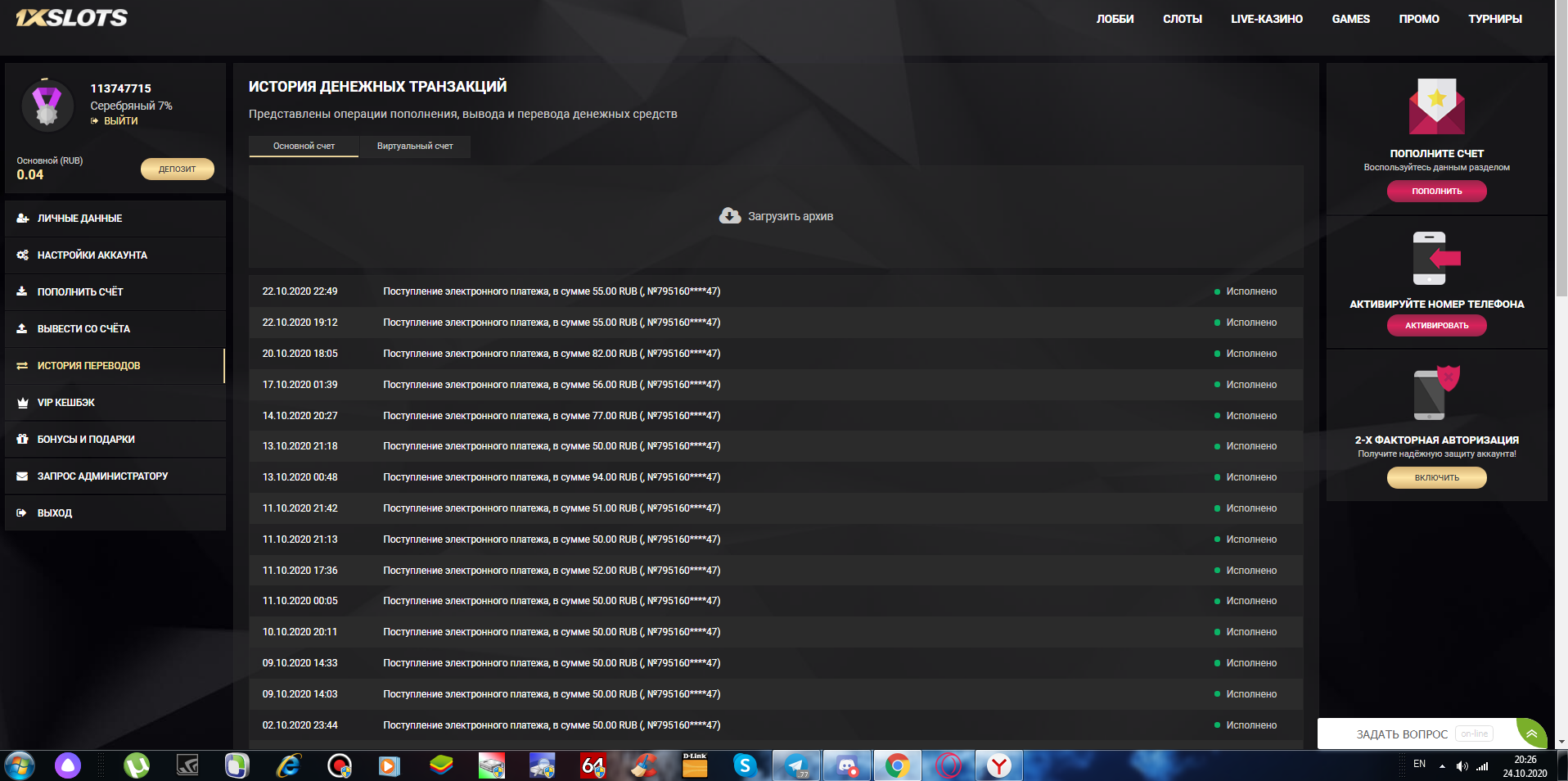 N NikName Свидетель Заноса 26 Июн 2020 11 3 43 Credits ¢0 24 Окт 2020 #3,712 Id: 112086951 #casinomy пусть повезёт Вложения Screenshot_2020-10-24-16-22-12-647_org.telegram.messenger.jpg 446.5 KB Просмотры: 208 Screenshot_2020-10-24-16-22-40-657_com.android.chrome.jpg 464 KB Просмотры: 205