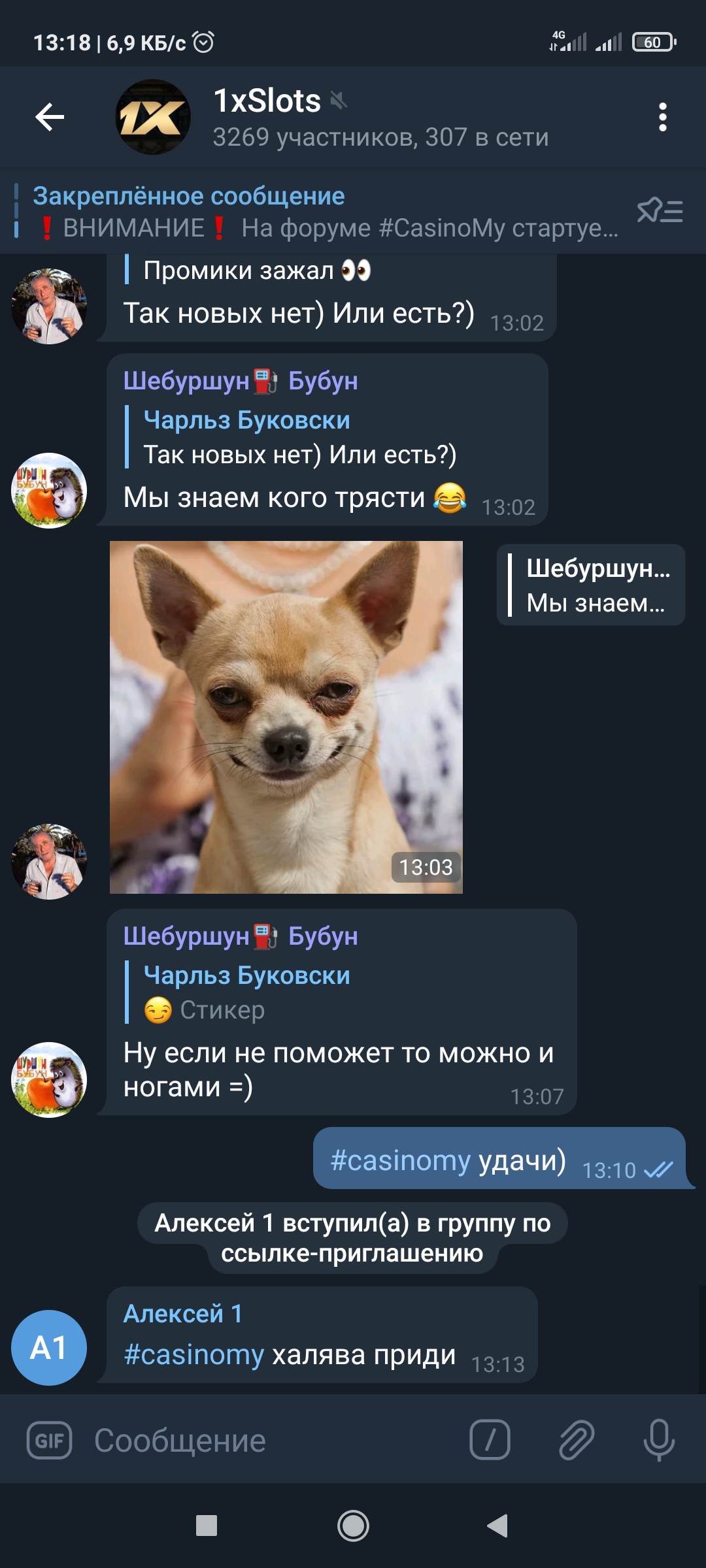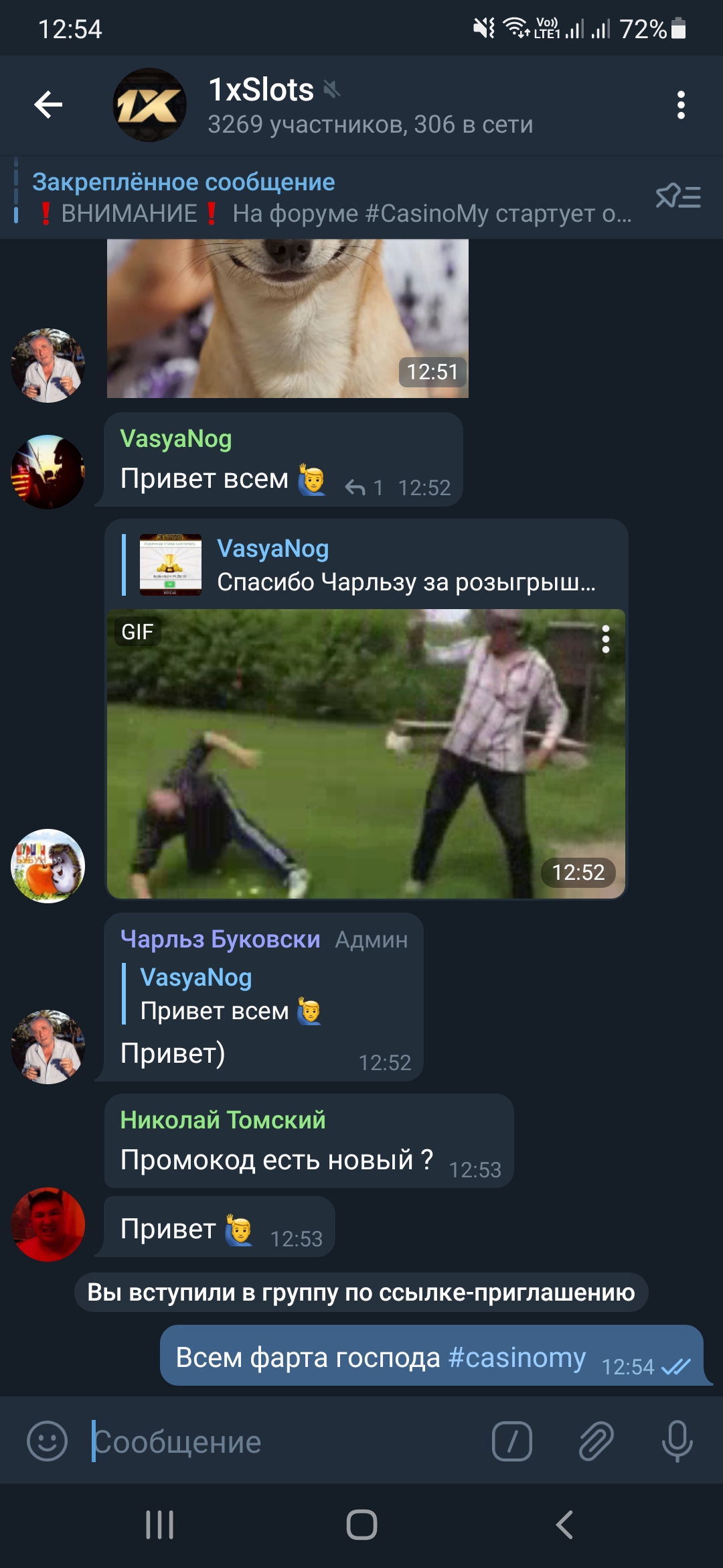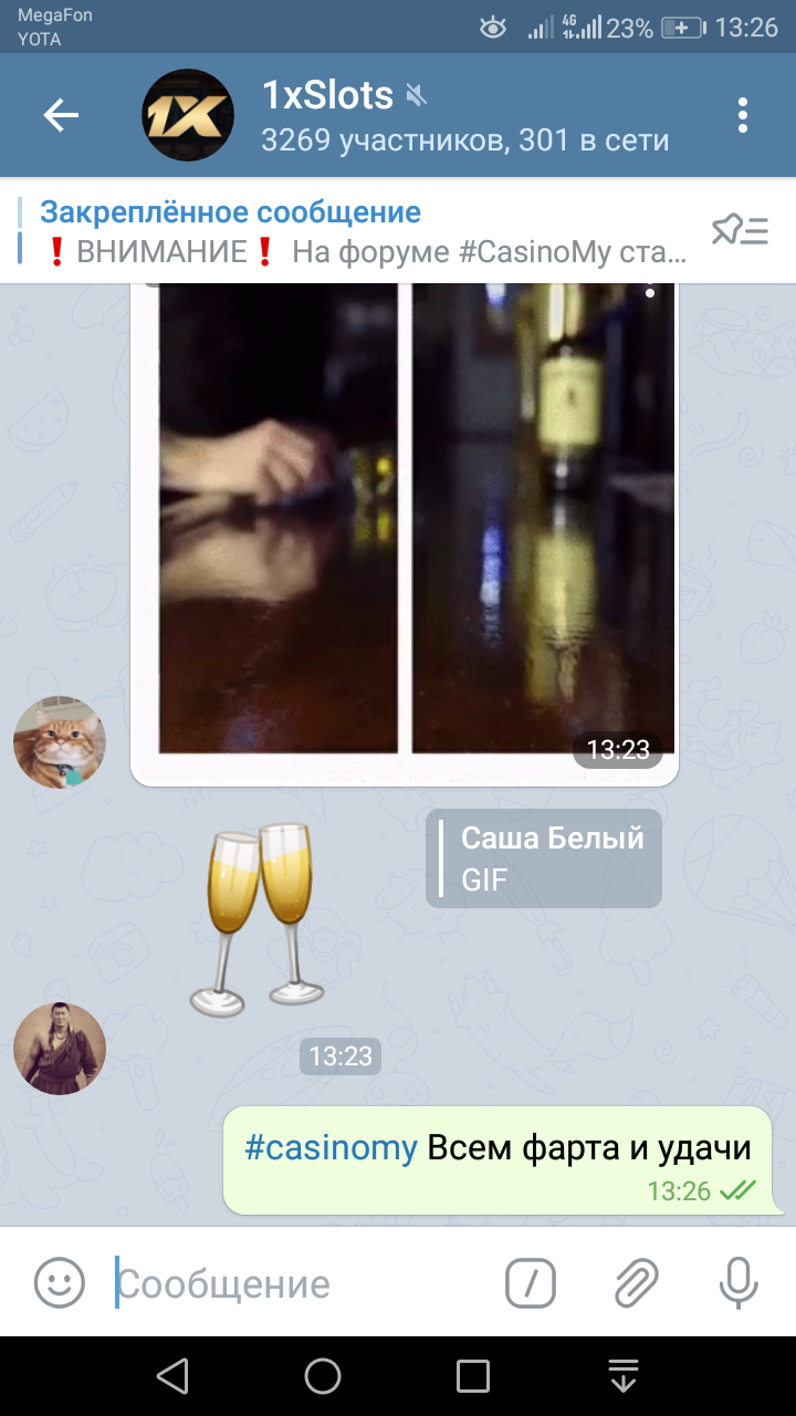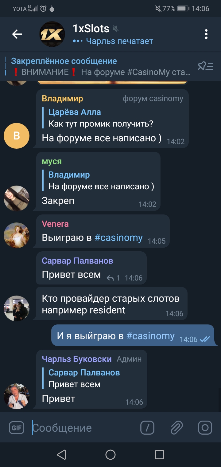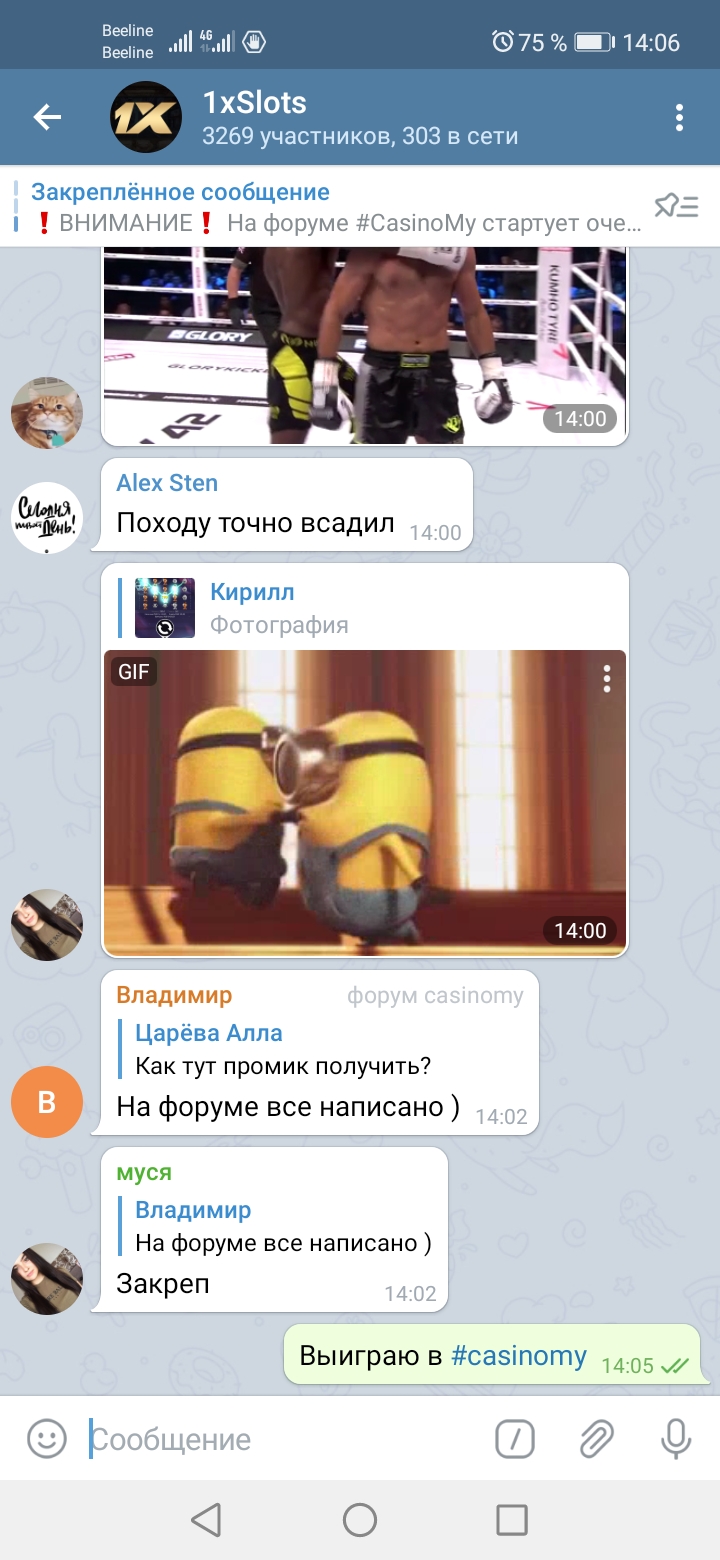2) Быть подписанным на телеграмм канал казино 1xSlots https://t.me/onexslots и чат https://t.me/joinchat/TCG5aNJ_qCpI6SdO, в телеграмм чате https://t.me/joinchat/TCG5aNJ_qCpI6SdO написать любое сообщение с тегом #casinomy и разместить текст этого сообщения в этой теме вместе со скрином депозита.