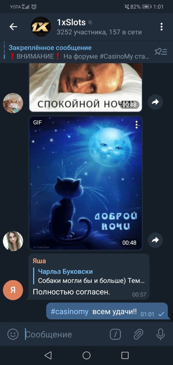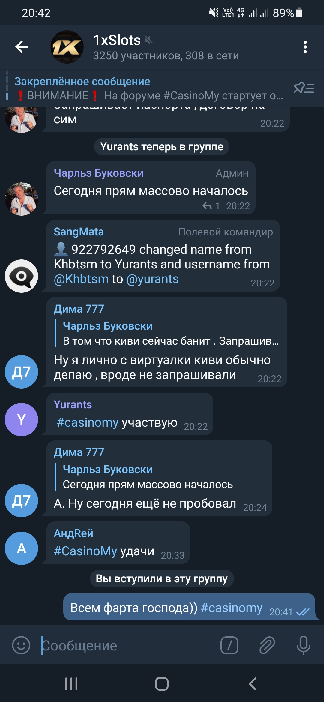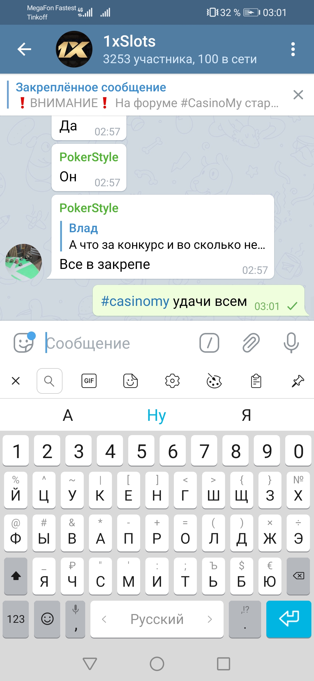 2) Быть подписанным на телеграмм канал казино 1xSlots https://t.me/onexslots и чат https://t.me/joinchat/TCG5aNJ_qCpI6SdO, в телеграмм чате https://t.me/joinchat/TCG5aNJ_qCpI6SdO написать любое сообщение с тегом #casinomy и разместить текст этого сообщения в этой теме вместе со скрином депозита.