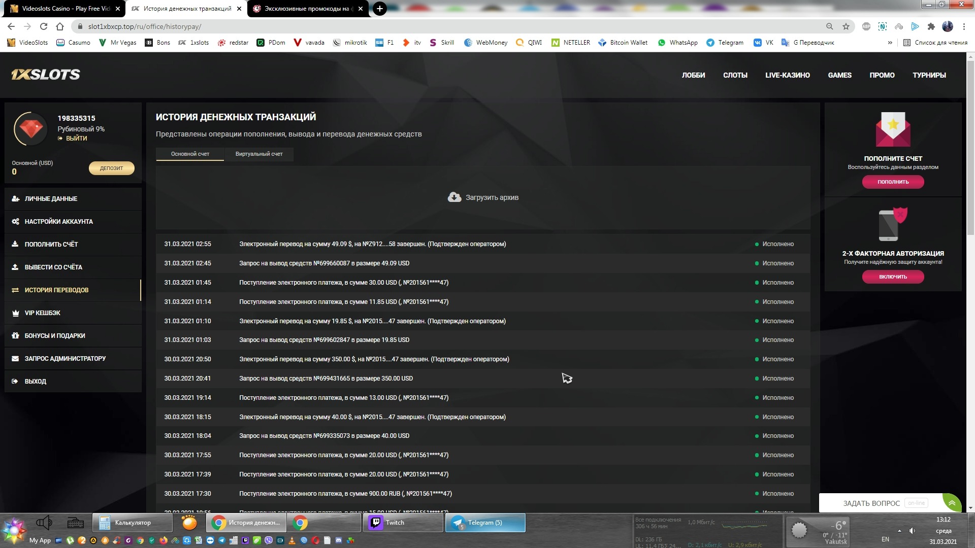 V Vitalik666 Свидетель Заноса 25 Дек 2020 23 3 39 Credits ¢0 31 Мар 2021 #4,390 #casinoMy Вложения Screenshot_20210331-092731_Telegram.jpg 530.6 KB Просмотры: 197 Screenshot_20210331-092819_1xSlots.jpg 409 KB Просмотры: 207