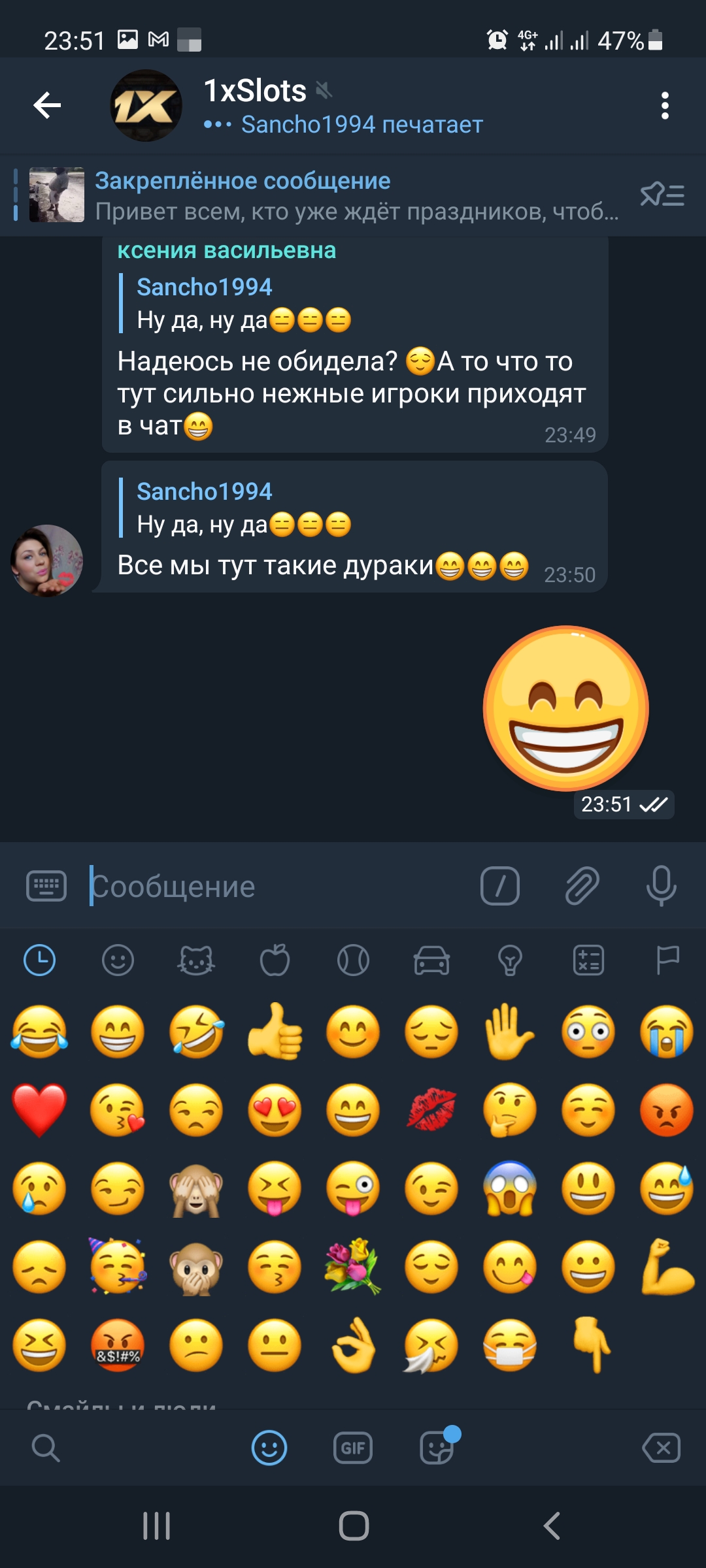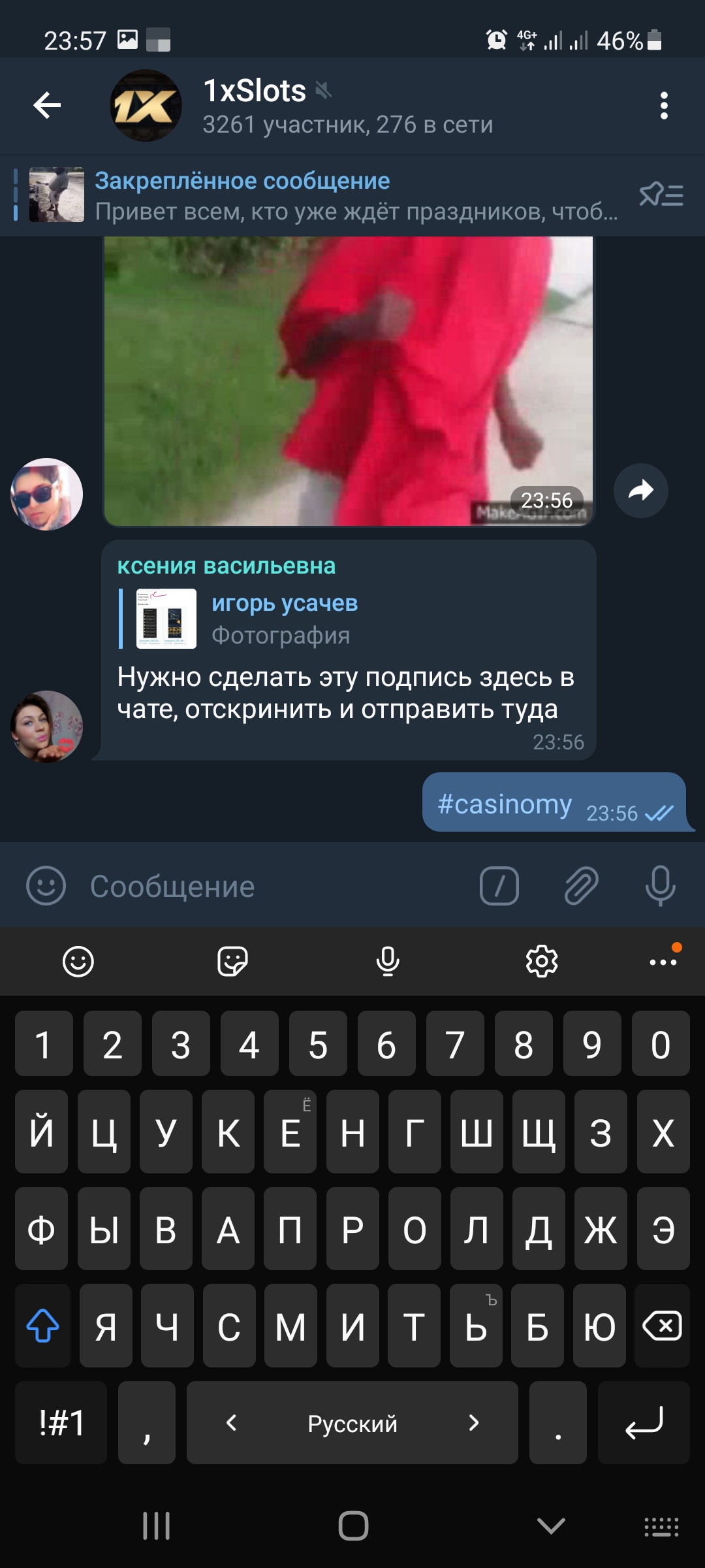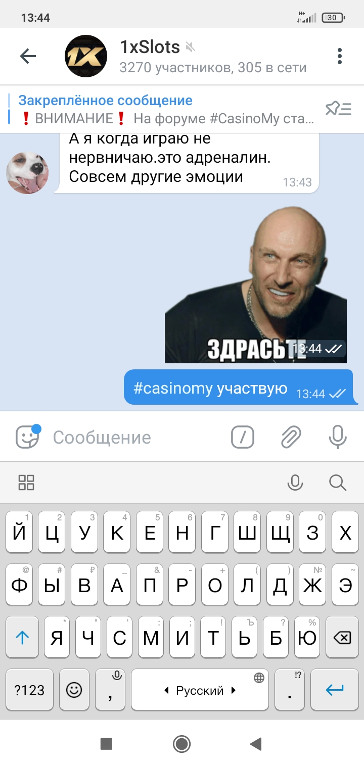 2) Быть подписанным на телеграмм канал казино 1xSlots https://t.me/onexslots и чат https://t.me/joinchat/TCG5aNJ_qCpI6SdO, в телеграмм чате https://t.me/joinchat/TCG5aNJ_qCpI6SdO написать любое сообщение с тегом #casinomy и разместить текст этого сообщения в этой теме вместе со скрином депозита.