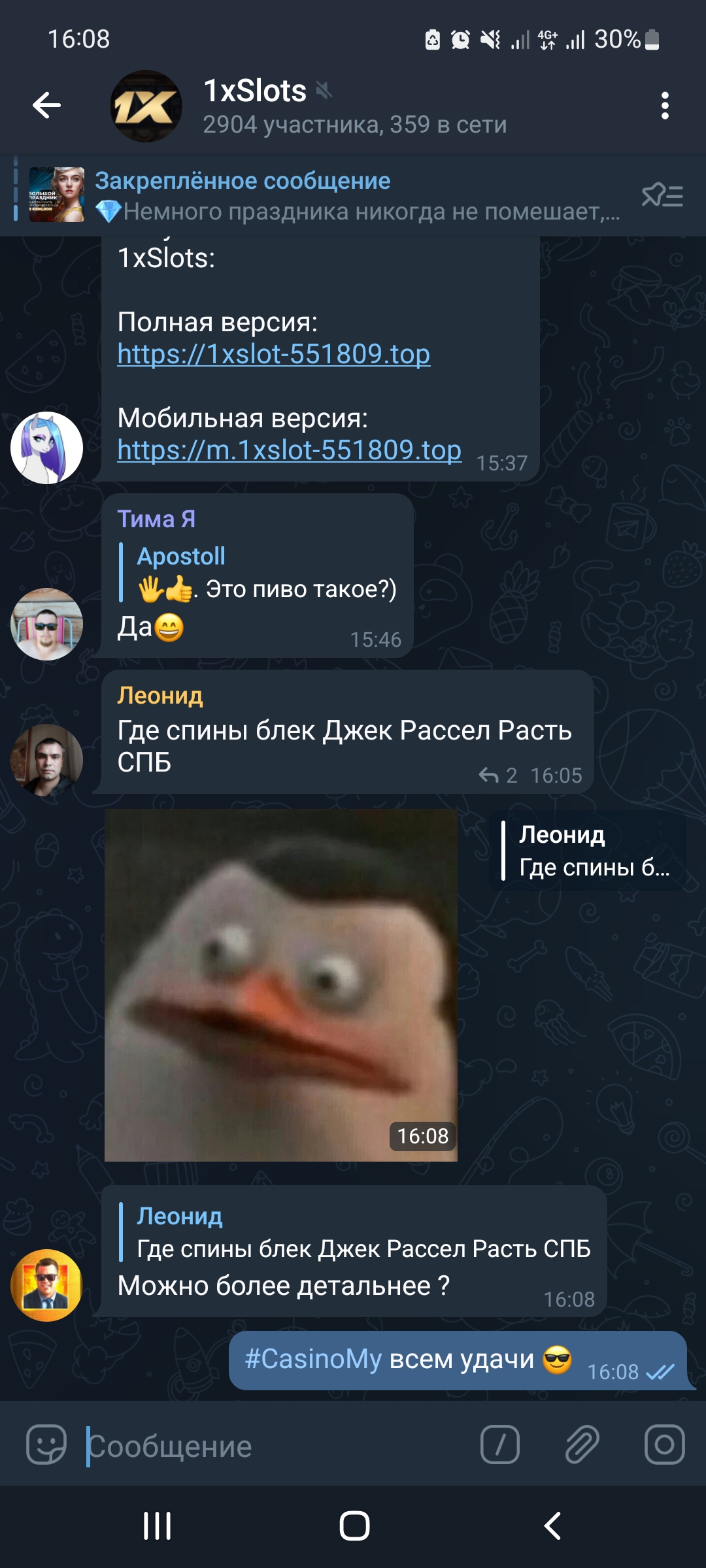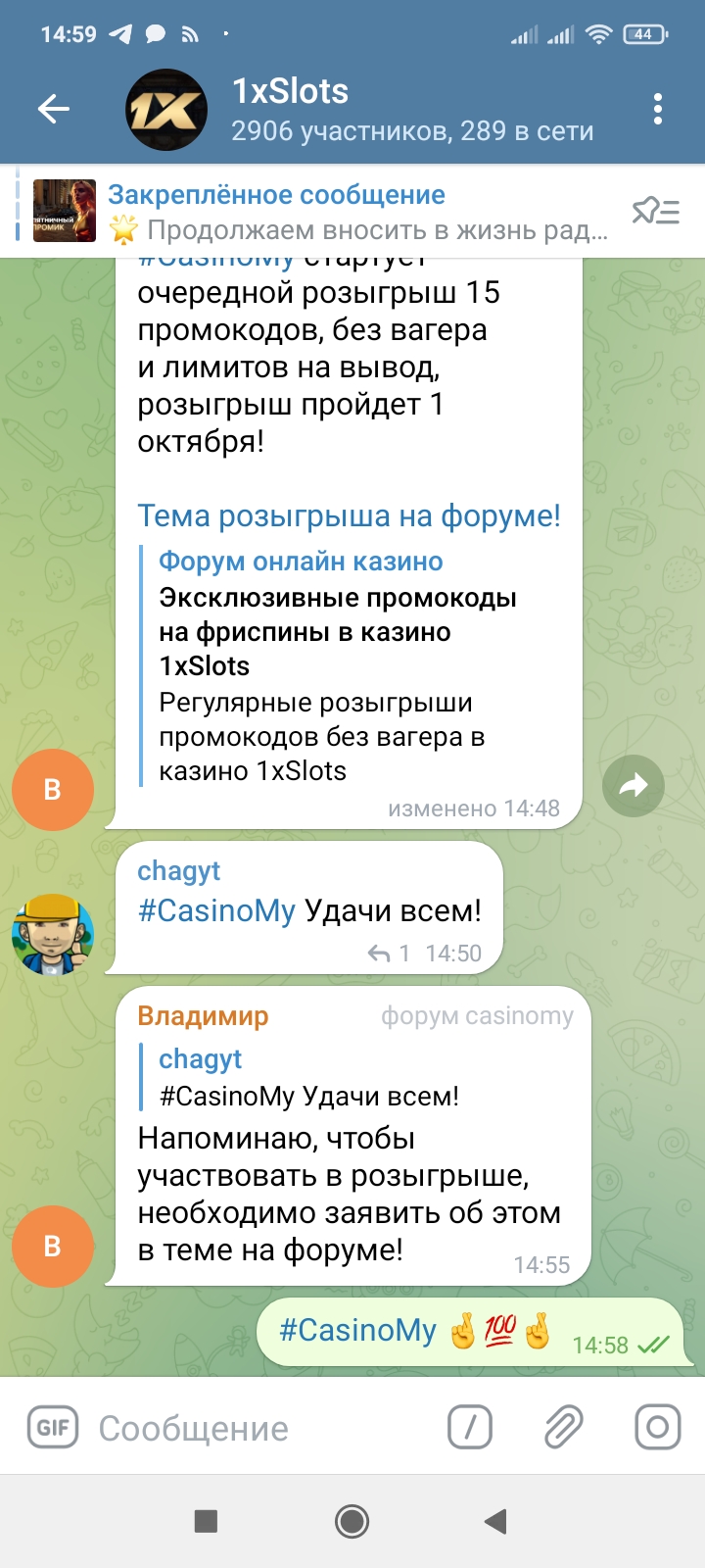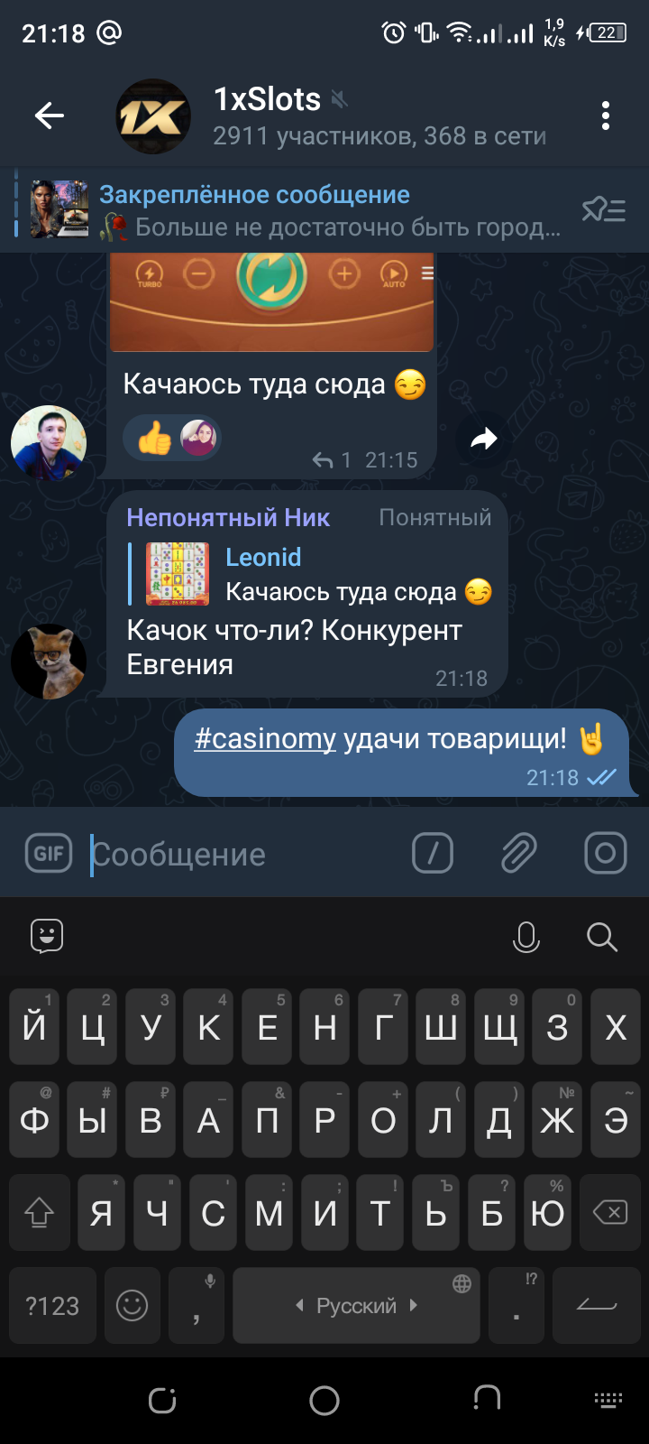 2) Быть подписанным на телеграмм канал казино 1xSlots https://t.me/onexslots и чат https://t.me/joinchat/TCG5aNJ_qCpI6SdO, в телеграмм чате https://t.me/joinchat/TCG5aNJ_qCpI6SdO написать любое сообщение с тегом #casinomy и разместить текст этого сообщения в этой теме вместе со скрином депозита.