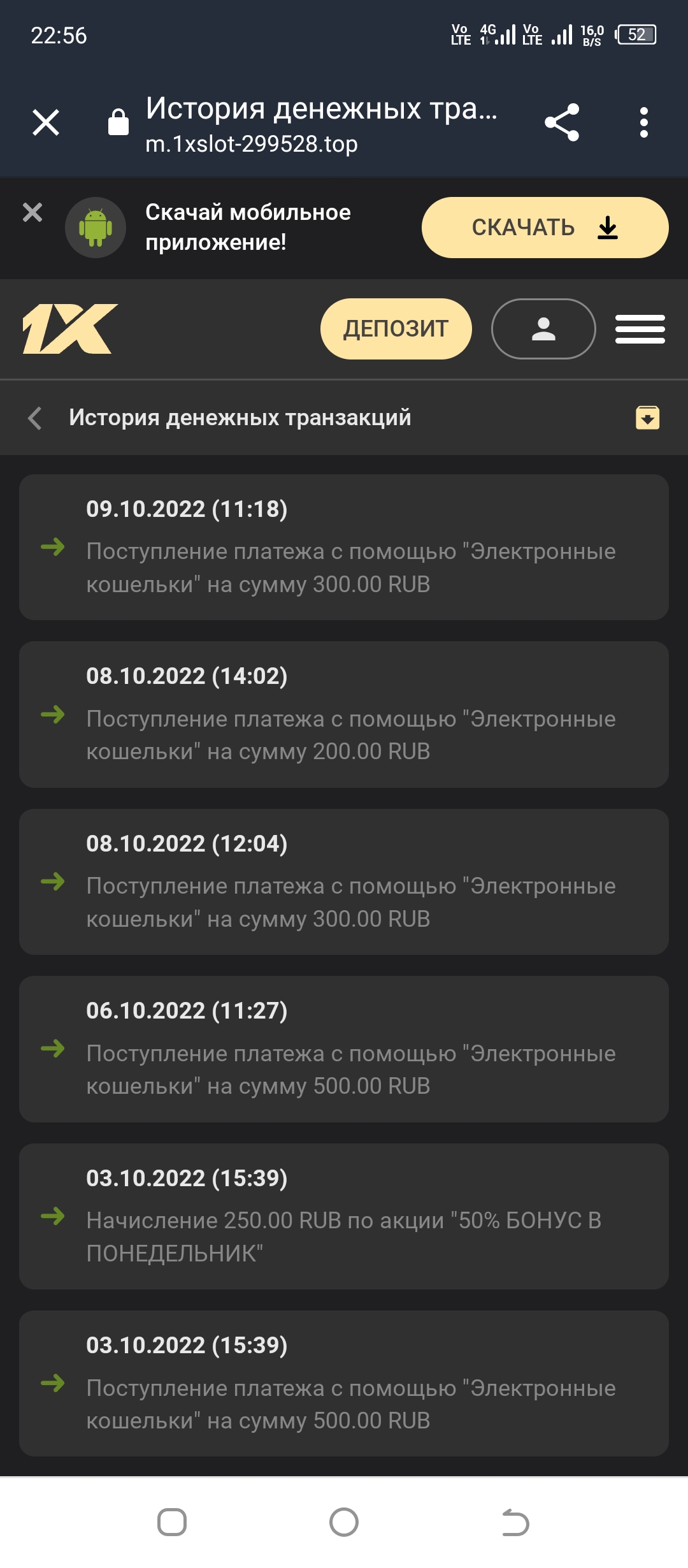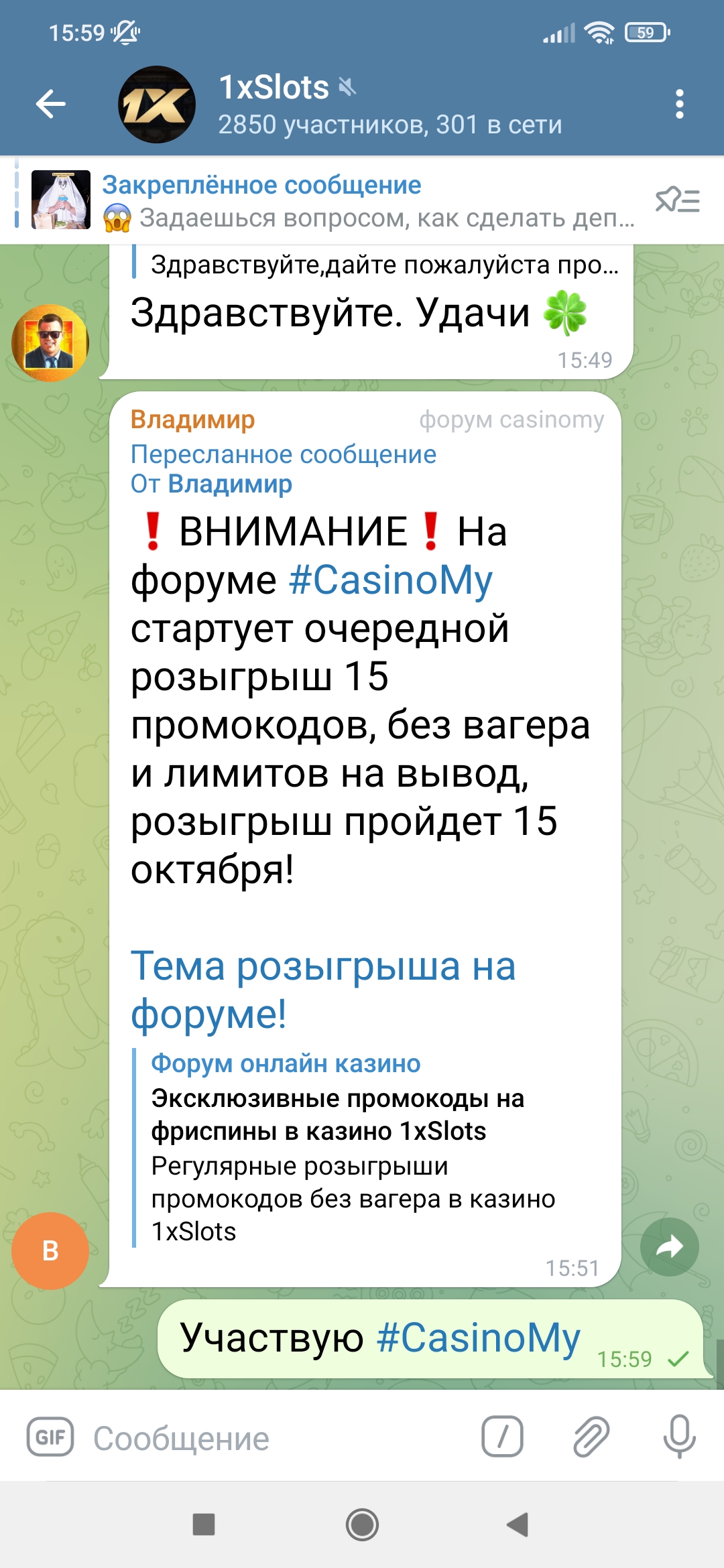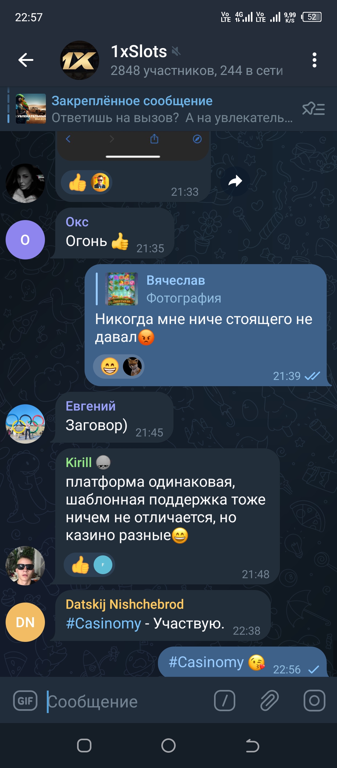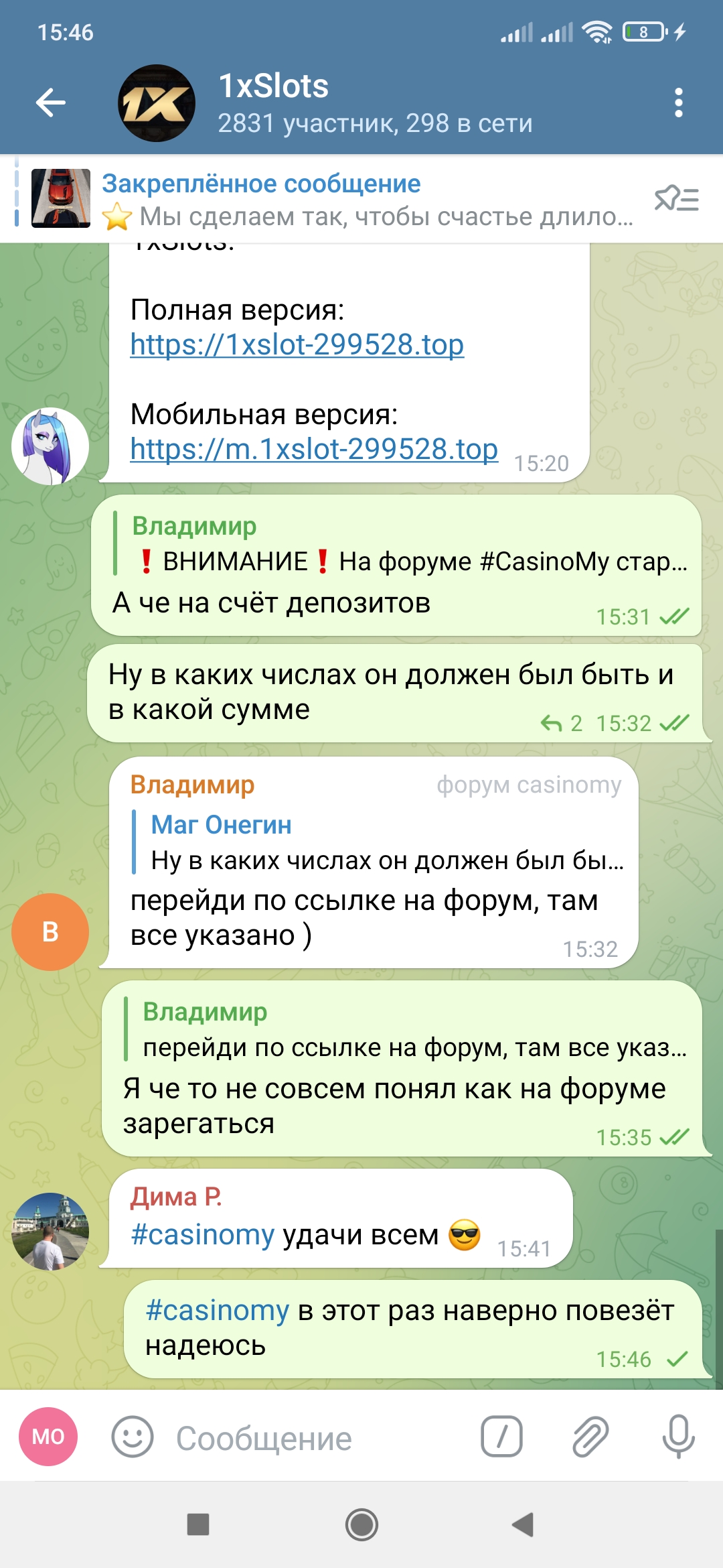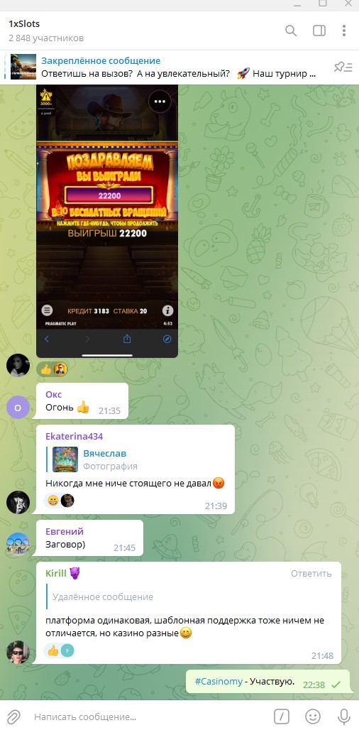 2) Быть подписанным на телеграмм канал казино 1xSlots https://t.me/onexslots и чат https://t.me/joinchat/TCG5aNJ_qCpI6SdO, в телеграмм чате https://t.me/joinchat/TCG5aNJ_qCpI6SdO написать любое сообщение с тегом #casinomy и разместить текст этого сообщения в этой теме вместе со скрином депозита.