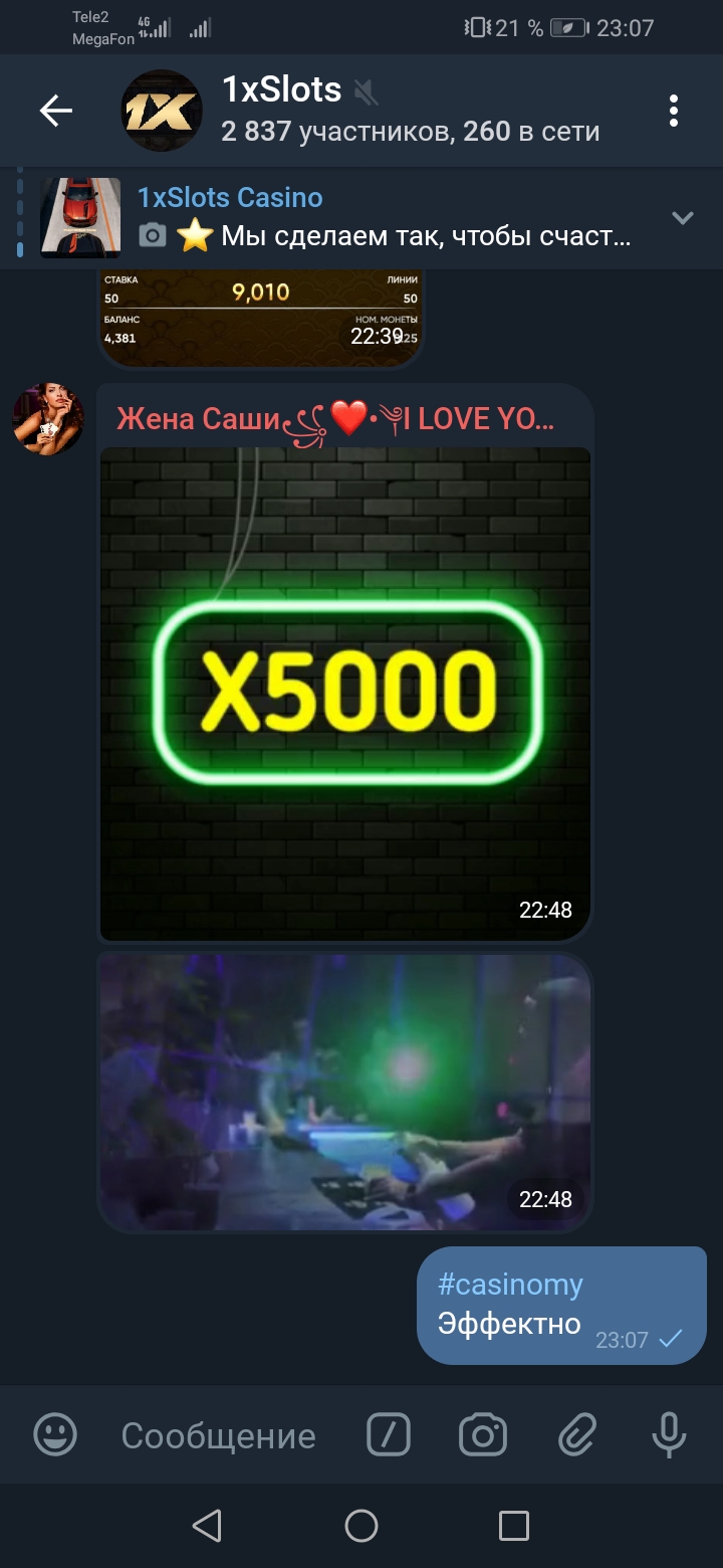 2) Бути підписаним на телеграм канал казино 1xSlots https://t.me/onexslots і чат https://t.me/joinchat/TCG5aNJ_qCpI6SdO тегом #casinomy і розмістити текст цього повідомлення на цю тему разом зі скрином депозиту.