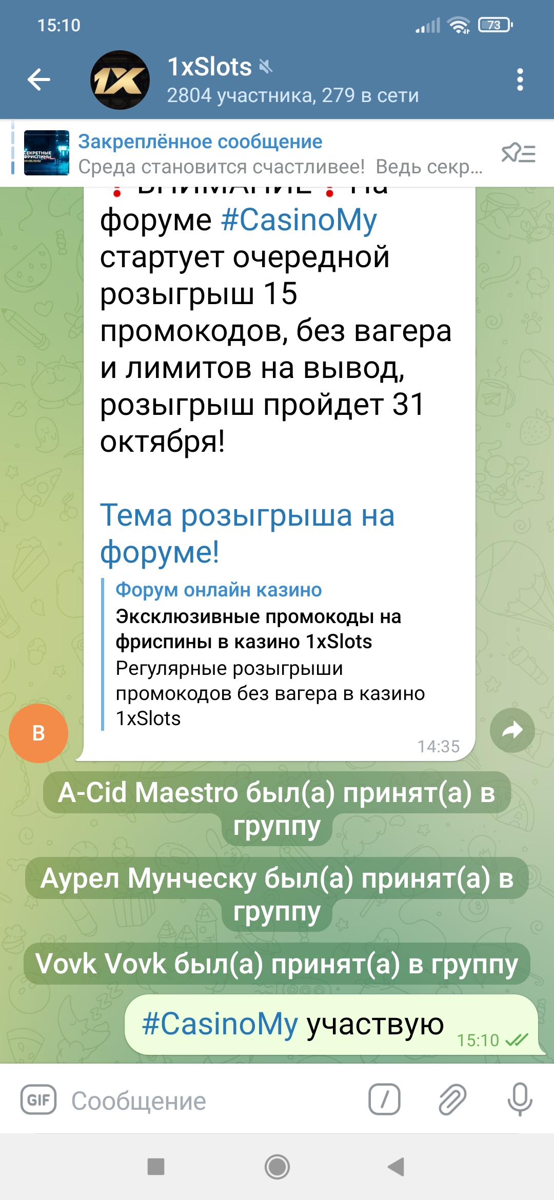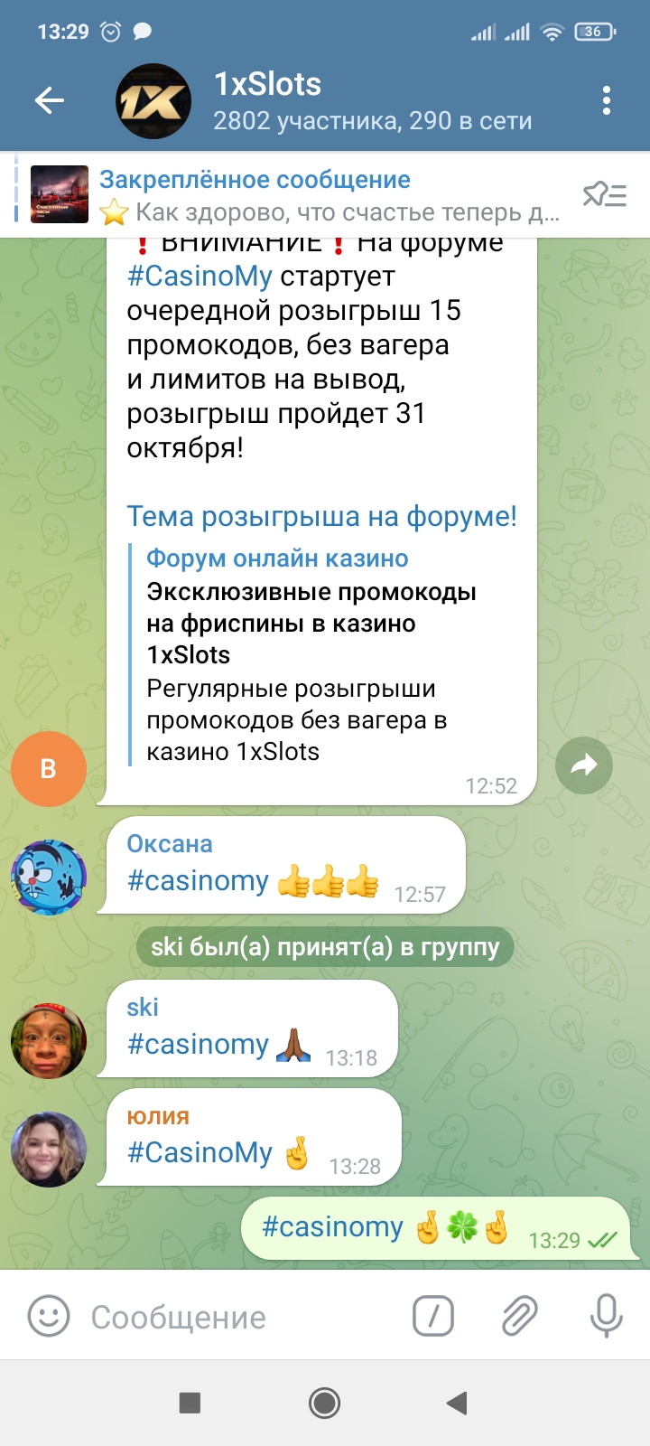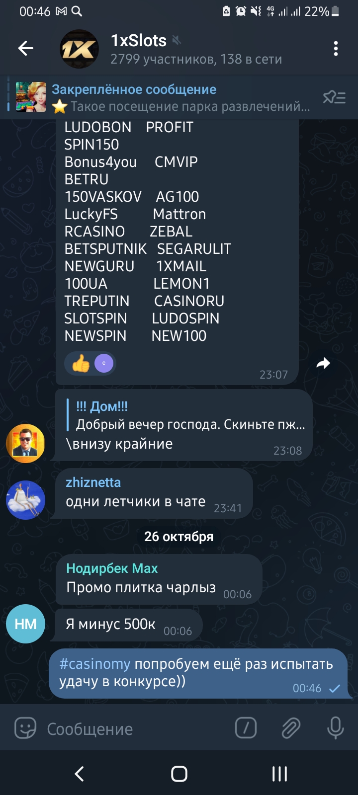 2) Быть подписанным на телеграмм канал казино 1xSlots https://t.me/onexslots и чат https://t.me/joinchat/TCG5aNJ_qCpI6SdO, в телеграмм чате https://t.me/joinchat/TCG5aNJ_qCpI6SdO написать любое сообщение с тегом #casinomy и разместить текст этого сообщения в этой теме вместе со скрином депозита.