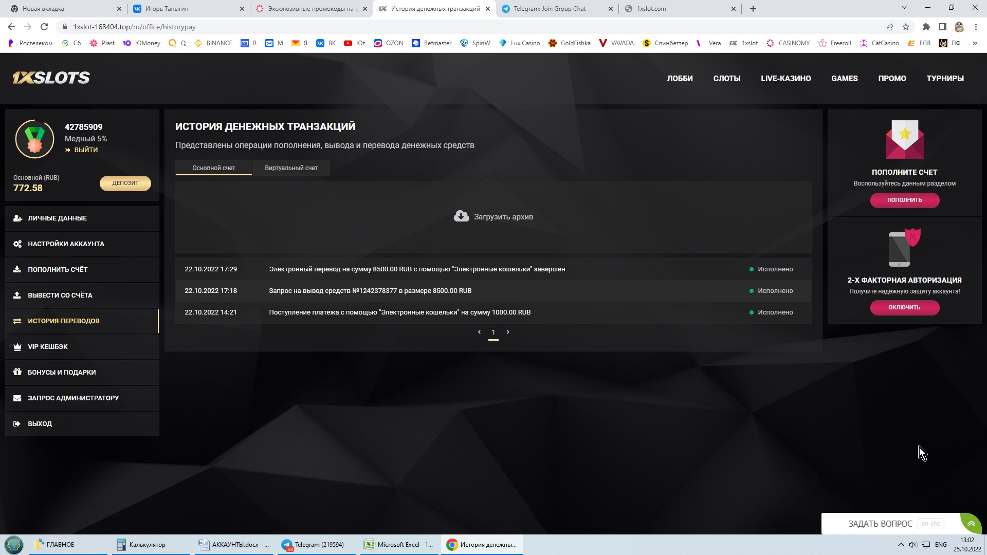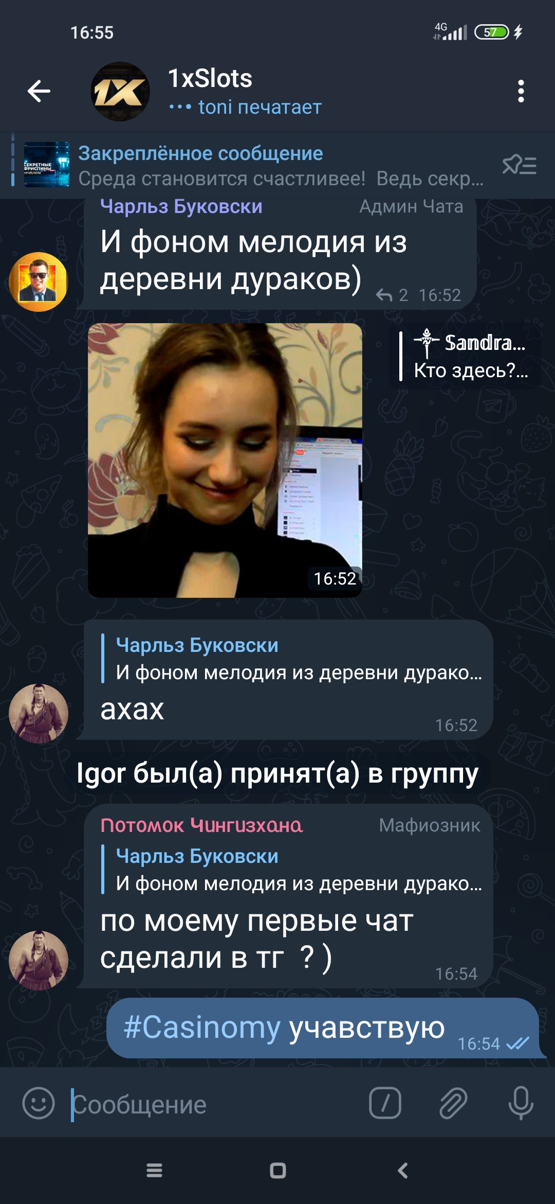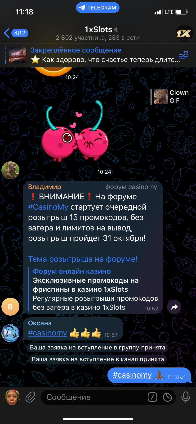 2) Быть подписанным на телеграмм канал казино 1xSlots https://t.me/onexslots и чат https://t.me/joinchat/TCG5aNJ_qCpI6SdO, в телеграмм чате https://t.me/joinchat/TCG5aNJ_qCpI6SdO написать любое сообщение с тегом #casinomy и разместить текст этого сообщения в этой теме вместе со скрином депозита.