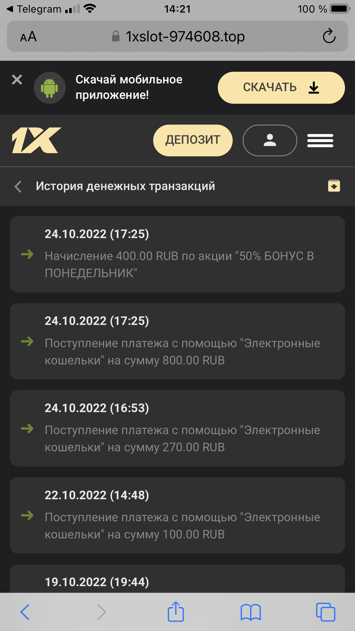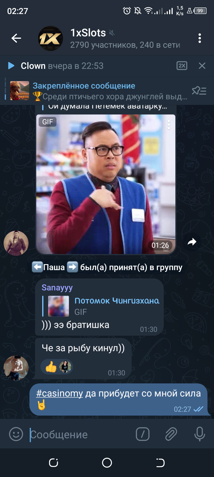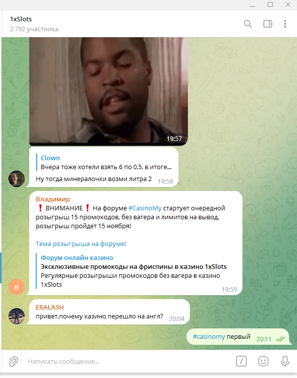 2) Быть подписанным на телеграмм канал казино 1xSlots https://t.me/onexslots и чат https://t.me/joinchat/TCG5aNJ_qCpI6SdO, в телеграмм чате https://t.me/joinchat/TCG5aNJ_qCpI6SdO написать любое сообщение с тегом #casinomy и разместить текст этого сообщения в этой теме вместе со скрином депозита.