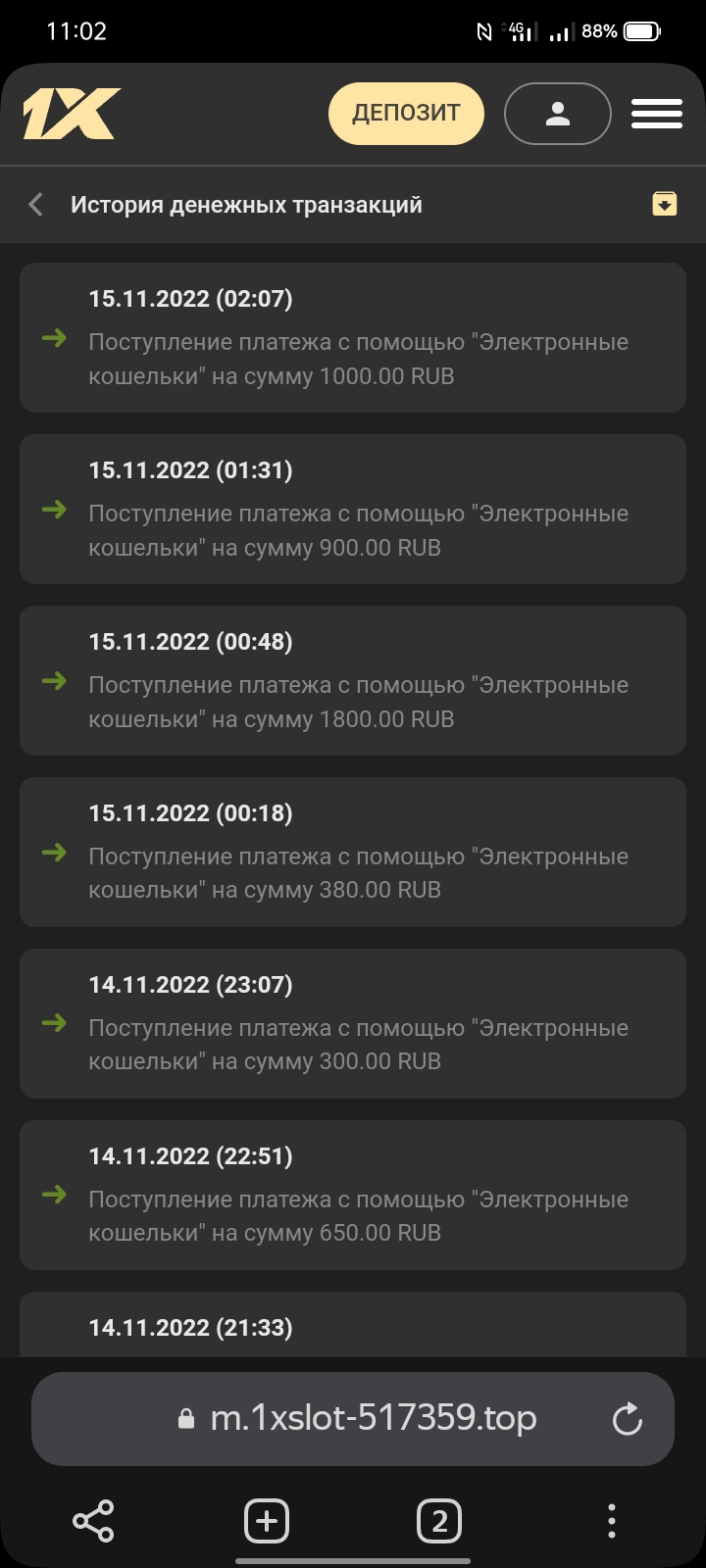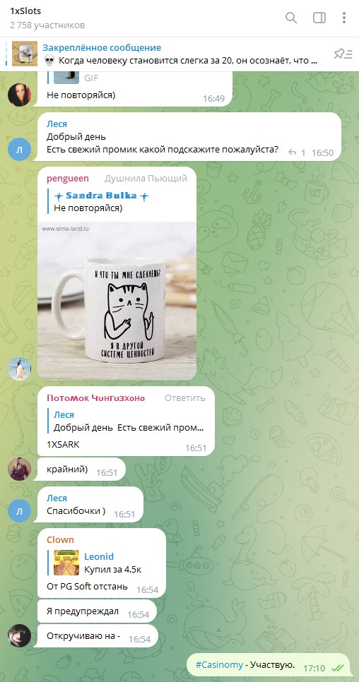 2) Быть подписанным на телеграмм канал казино 1xSlots https://t.me/onexslots и чат https://t.me/joinchat/TCG5aNJ_qCpI6SdO, в телеграмм чате https://t.me/joinchat/TCG5aNJ_qCpI6SdO написать любое сообщение с тегом #casinomy и разместить текст этого сообщения в этой теме вместе со скрином депозита.