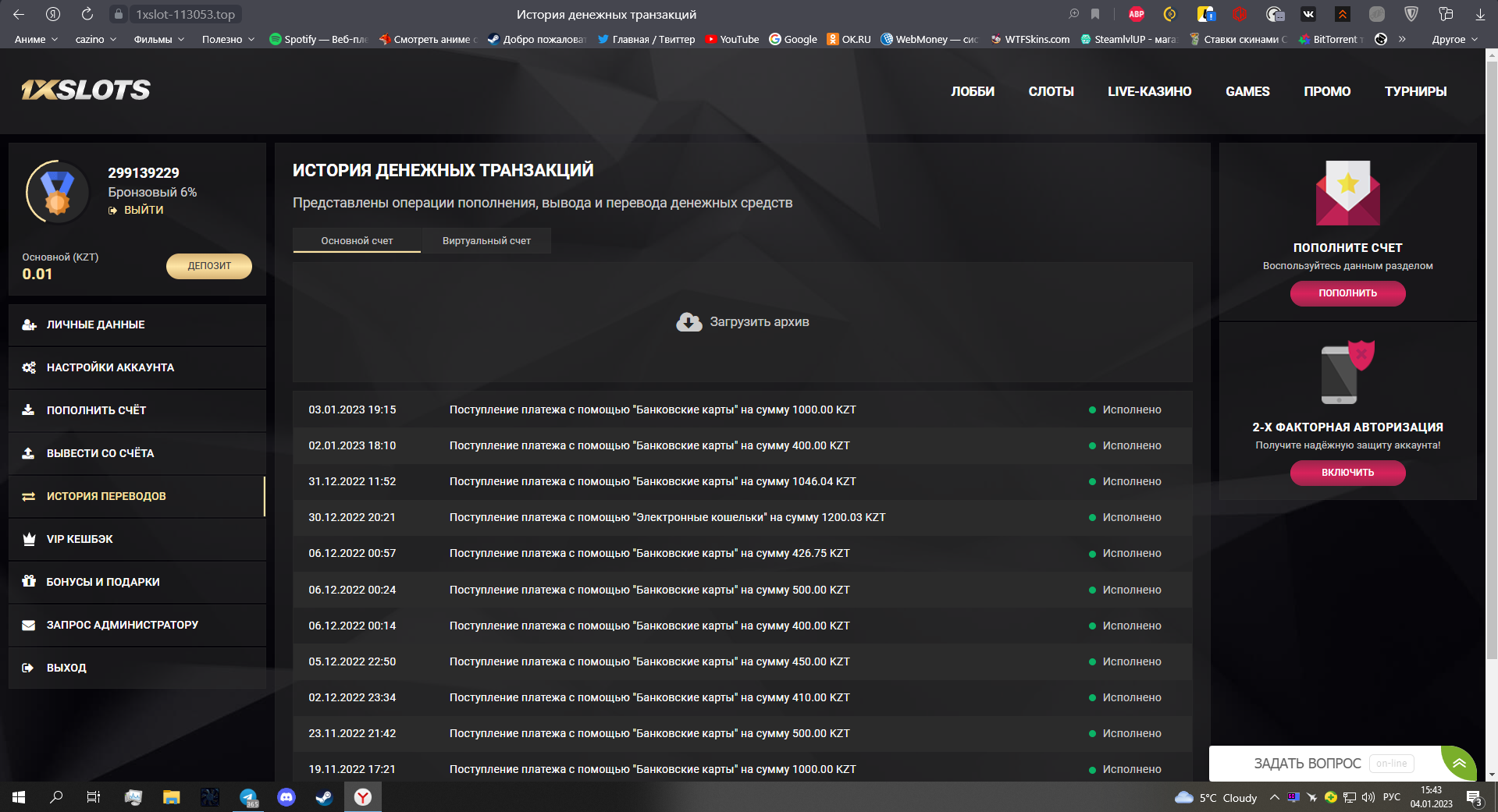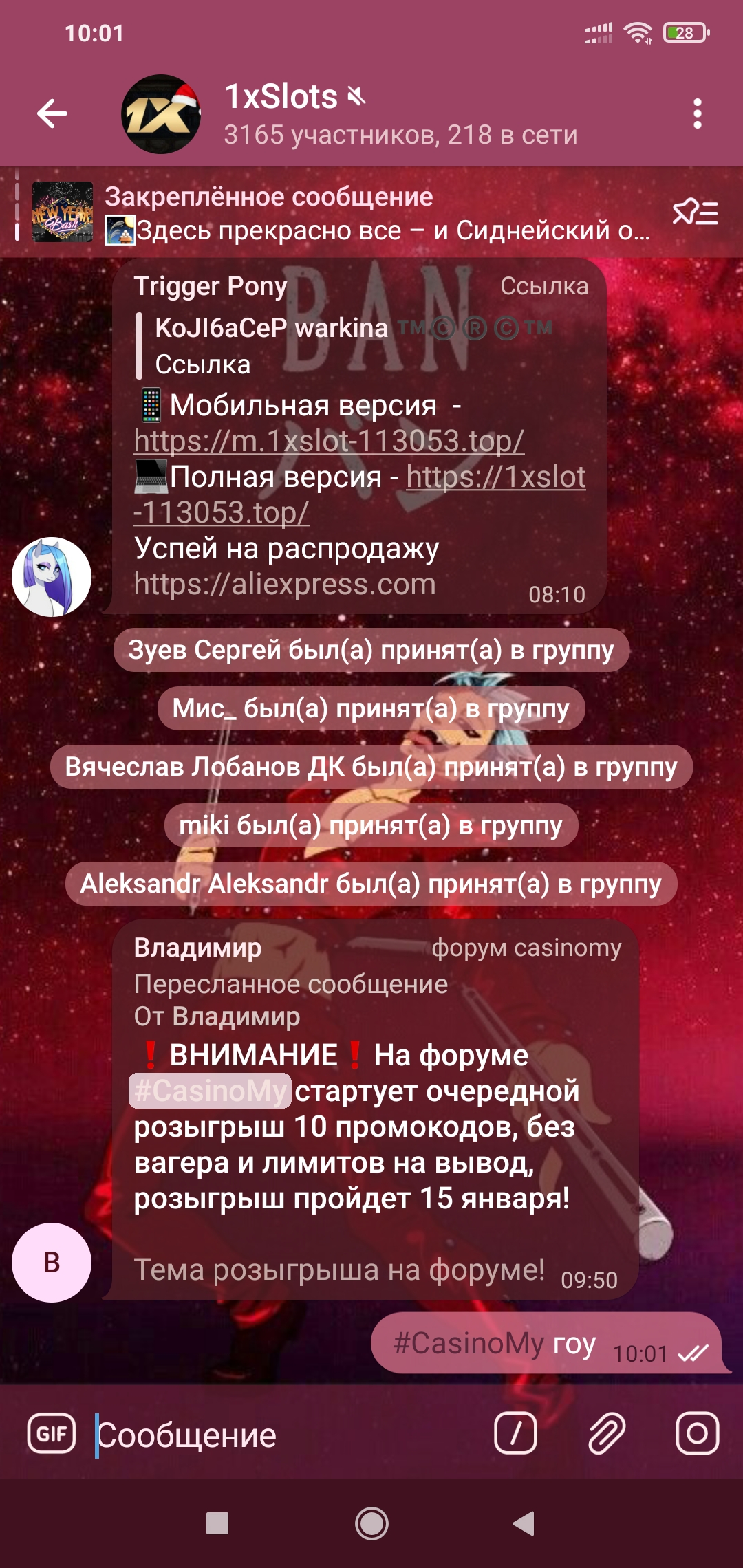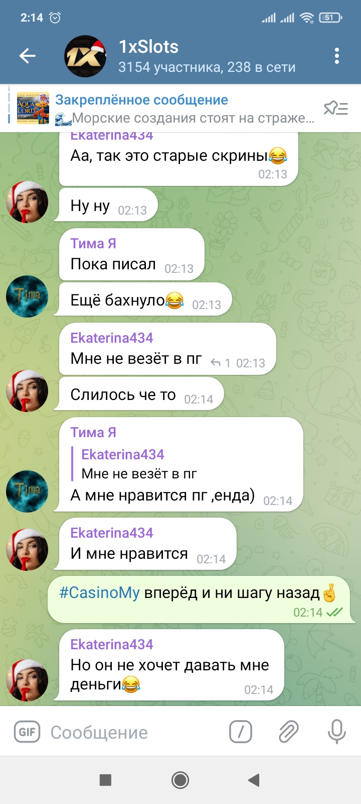 2) Быть подписанным на телеграмм канал казино 1xSlots https://t.me/onexslots и чат https://t.me/joinchat/TCG5aNJ_qCpI6SdO, в телеграмм чате https://t.me/joinchat/TCG5aNJ_qCpI6SdO написать любое сообщение с тегом #casinomy и разместить текст этого сообщения в этой теме вместе со скрином депозита.