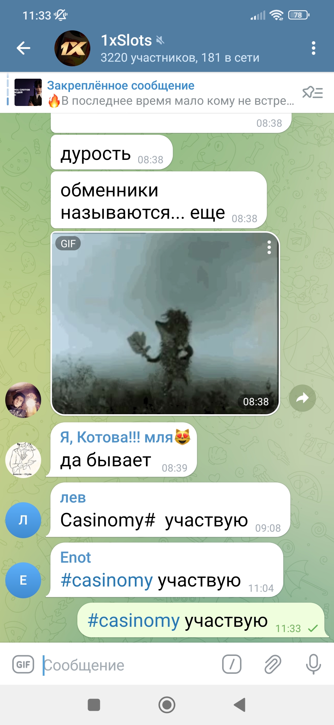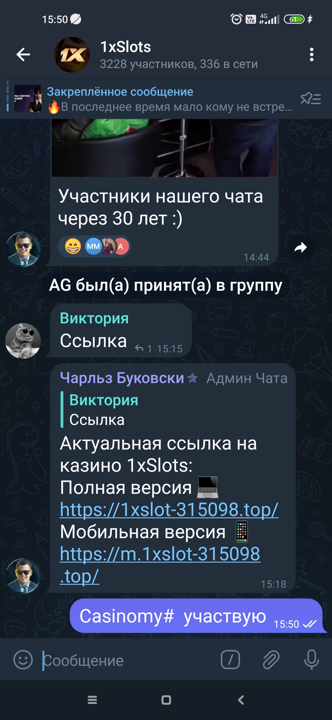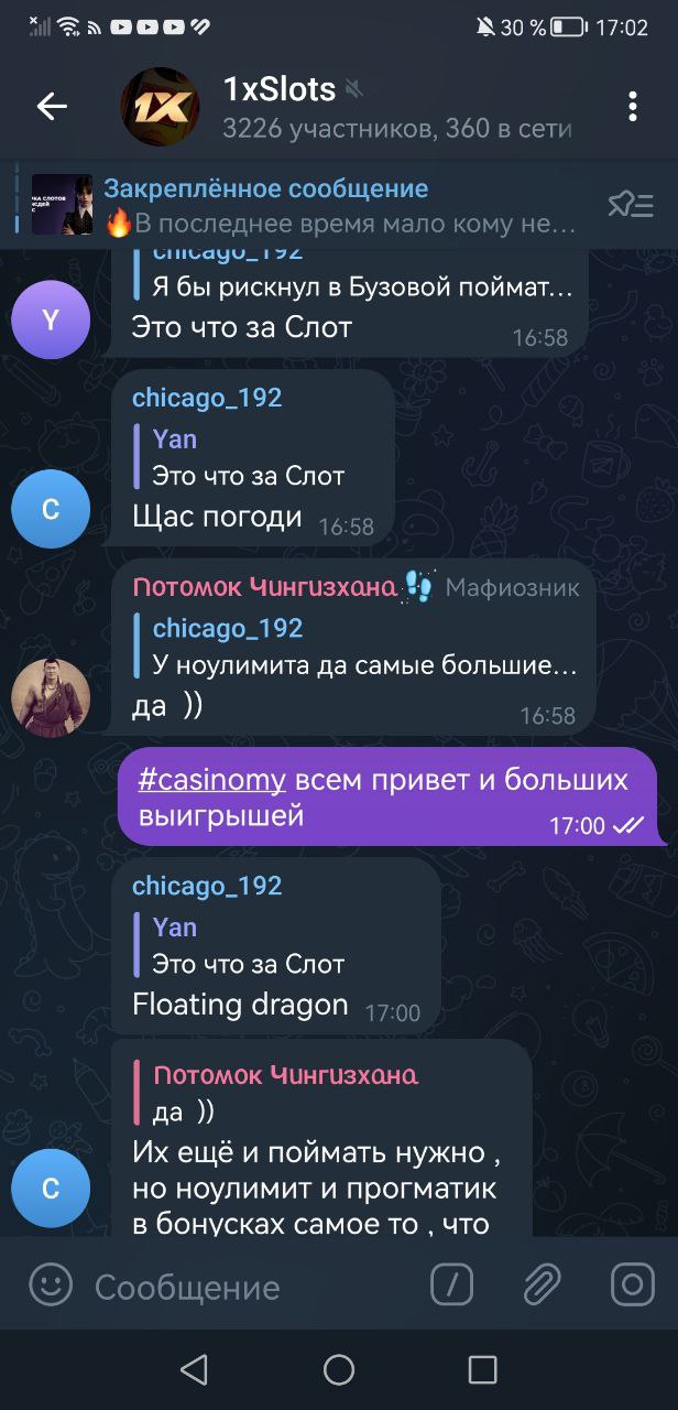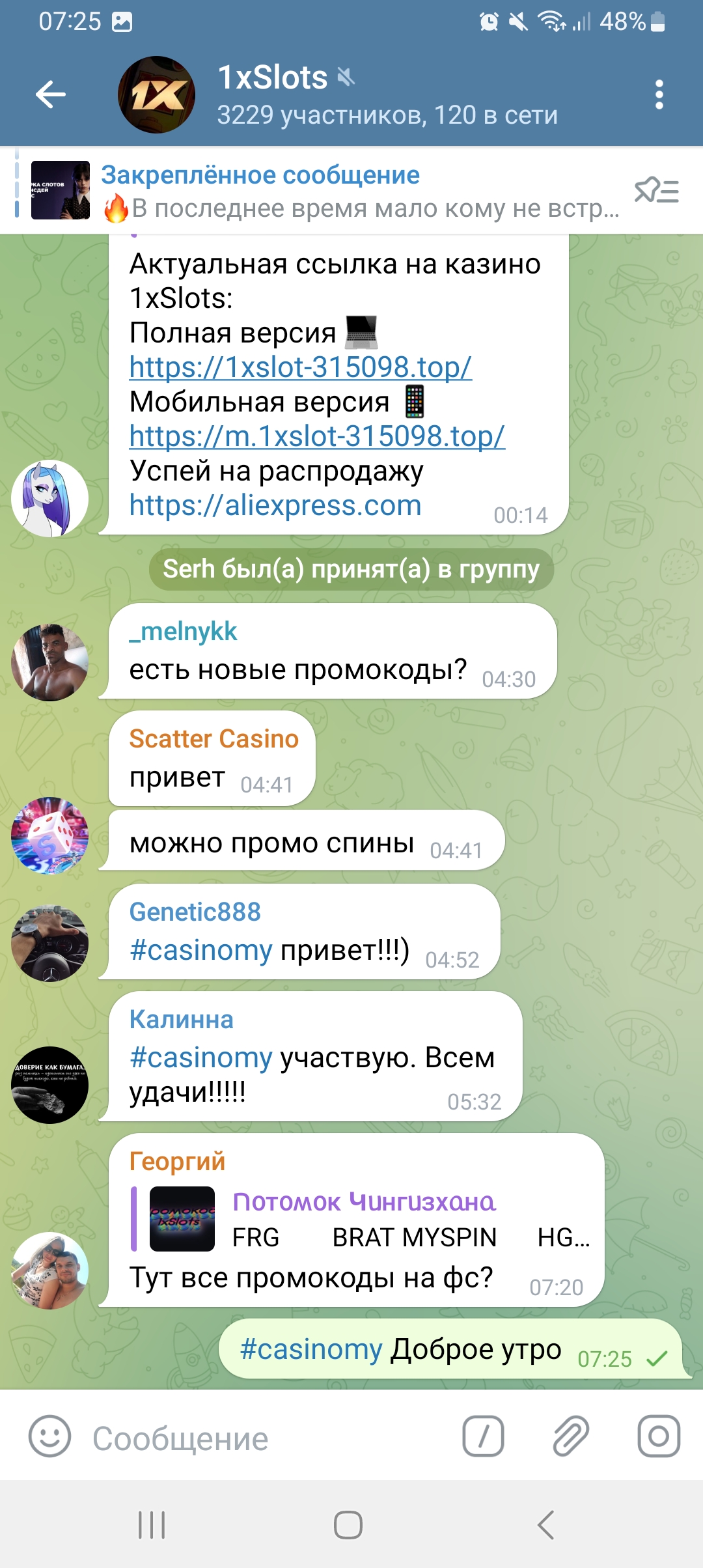 2) Быть подписанным на наш телеграмм канал https://t.me/casinomyforum и чат казино 1xSlots https://t.me/joinchat/TCG5aNJ_qCpI6SdO, в телеграмм чате 1xSlots https://t.me/joinchat/TCG5aNJ_qCpI6SdO написать любое сообщение с тегом #casinomy и разместить текст этого сообщения в этой теме вместе со скрином депозита.