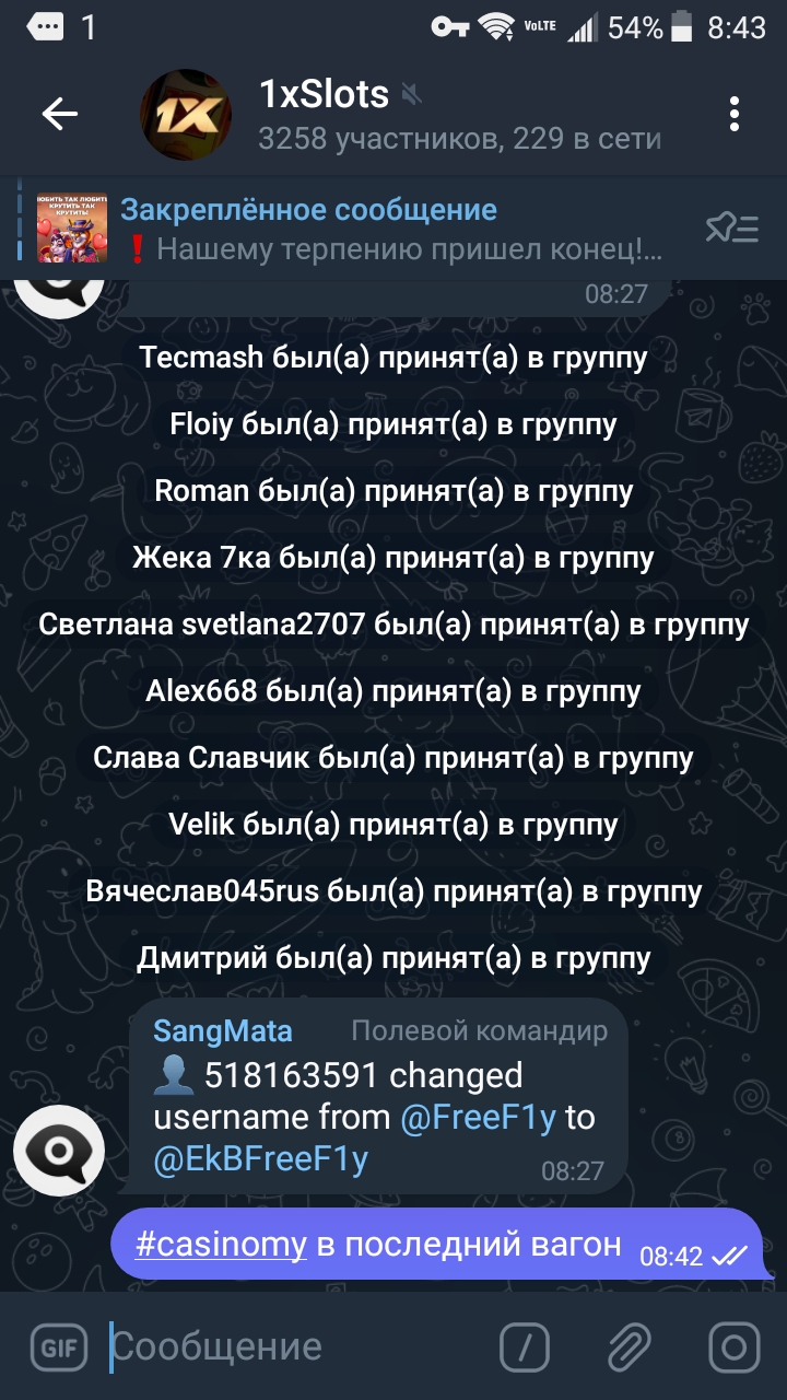 2) Быть подписанным на наш телеграмм канал https://t.me/casinomyforum и чат казино 1xSlots https://t.me/joinchat/TCG5aNJ_qCpI6SdO, в телеграмм чате 1xSlots https://t.me/joinchat/TCG5aNJ_qCpI6SdO написать любое сообщение с тегом #casinomy и разместить текст этого сообщения в этой теме вместе со скрином депозита.
