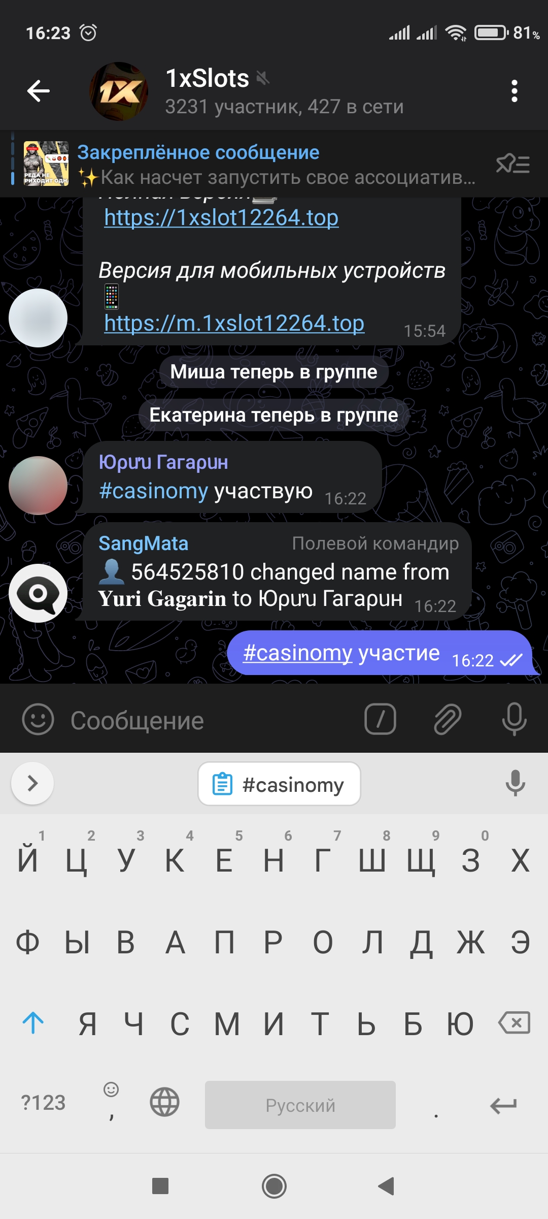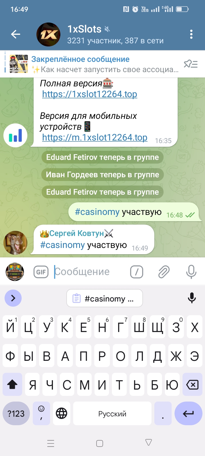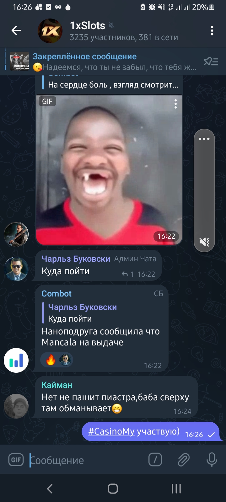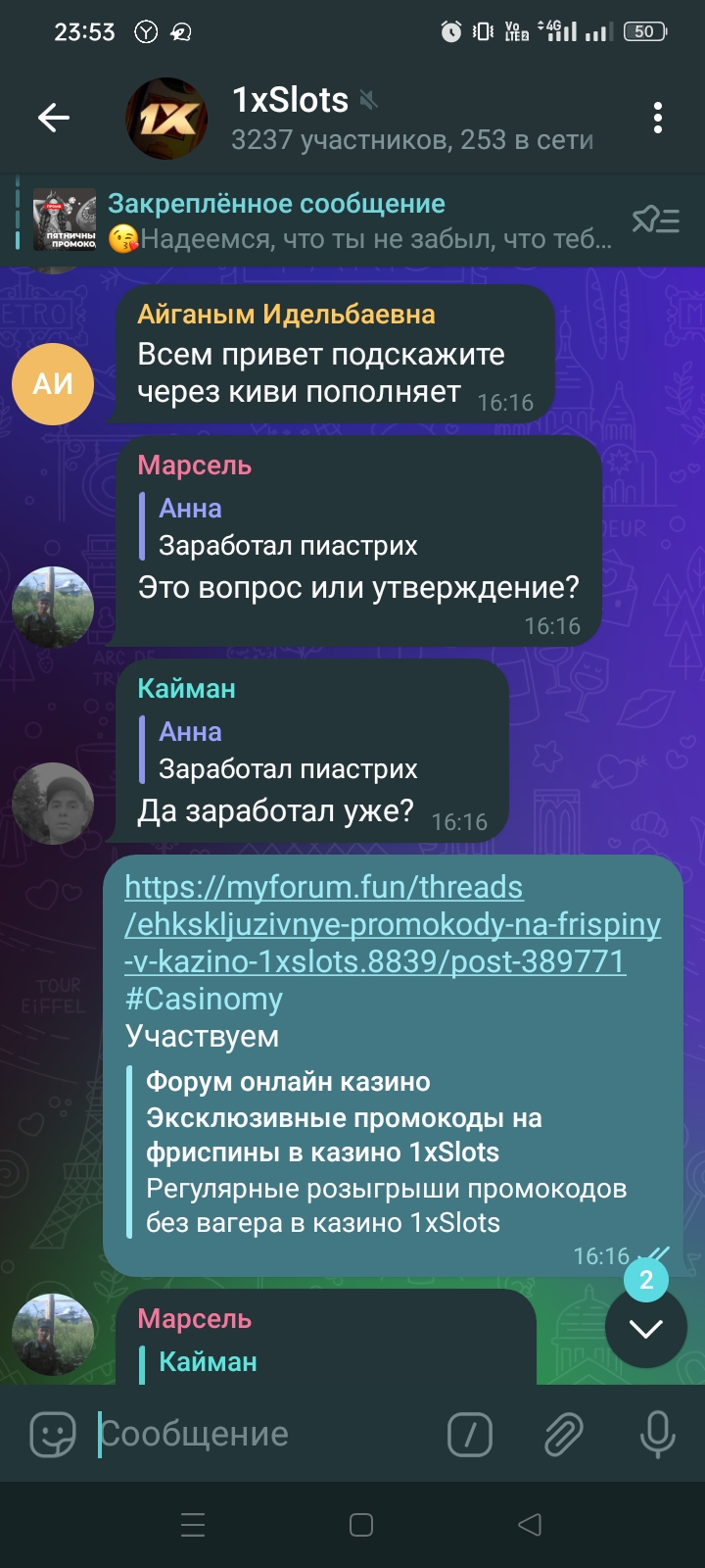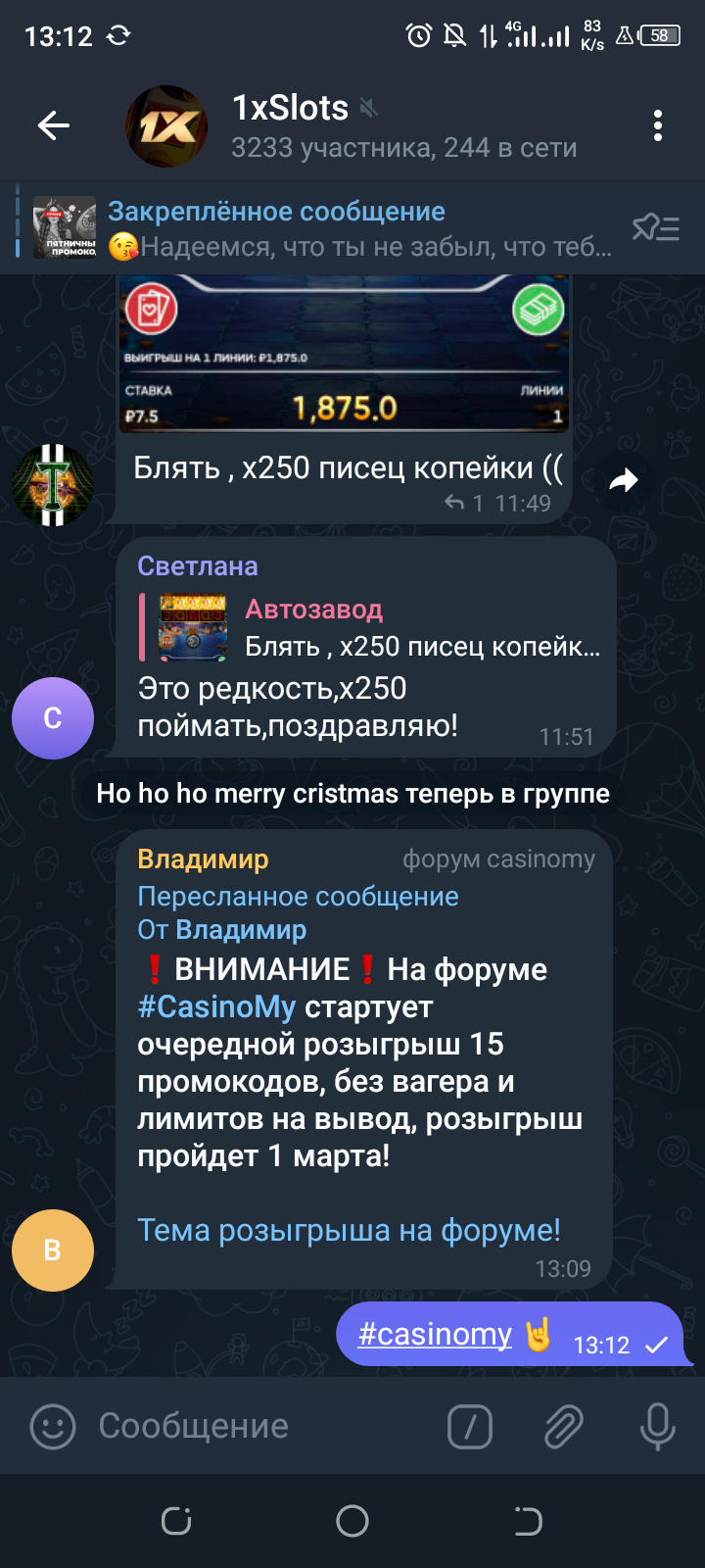 2) Быть подписанным на наш телеграмм канал https://t.me/casinomyforum и чат казино 1xSlots https://t.me/joinchat/TCG5aNJ_qCpI6SdO, в телеграмм чате 1xSlots https://t.me/joinchat/TCG5aNJ_qCpI6SdO написать любое сообщение с тегом #casinomy и разместить текст этого сообщения в этой теме вместе со скрином депозита.