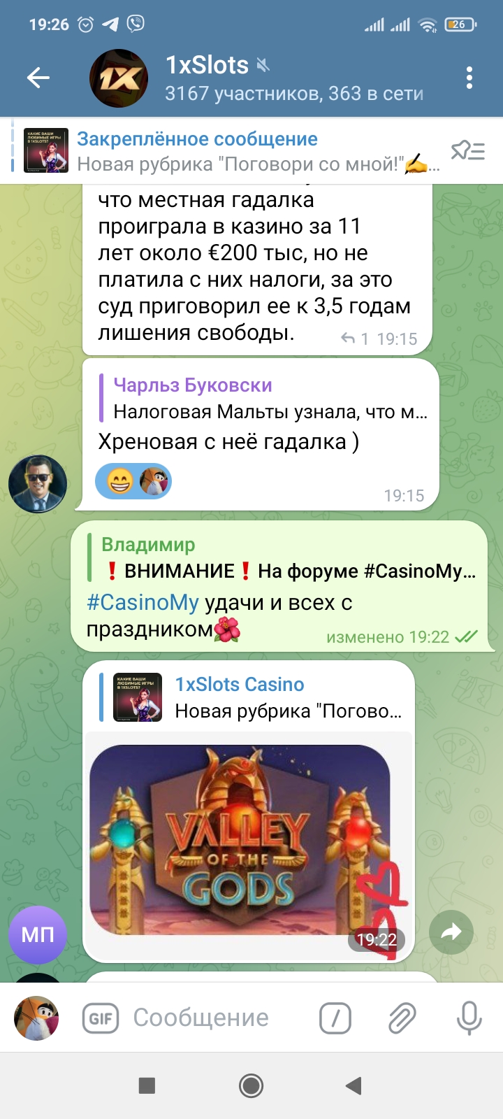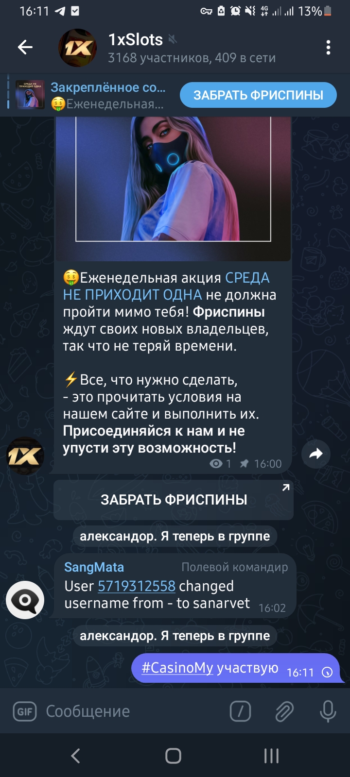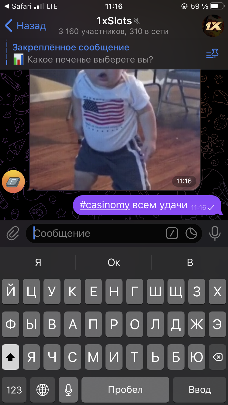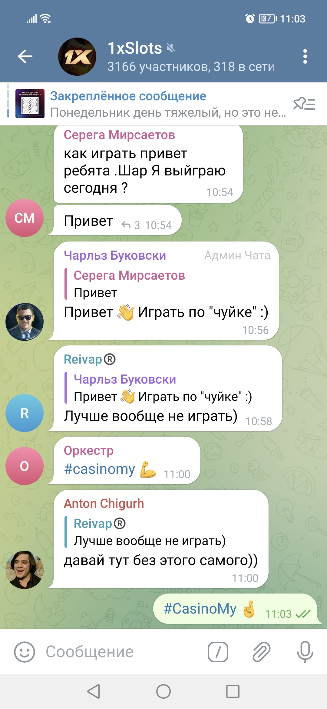 2) Быть подписанным на наш телеграмм канал https://t.me/casinomyforum и чат казино 1xSlots https://t.me/joinchat/TCG5aNJ_qCpI6SdO, в телеграмм чате 1xSlots https://t.me/joinchat/TCG5aNJ_qCpI6SdO написать любое сообщение с тегом #casinomy и разместить текст этого сообщения в этой теме вместе со скрином депозита.