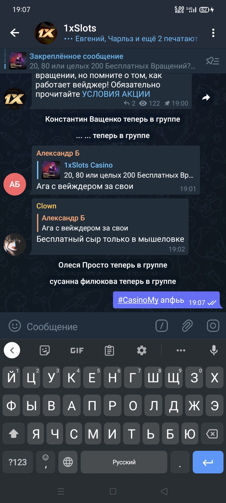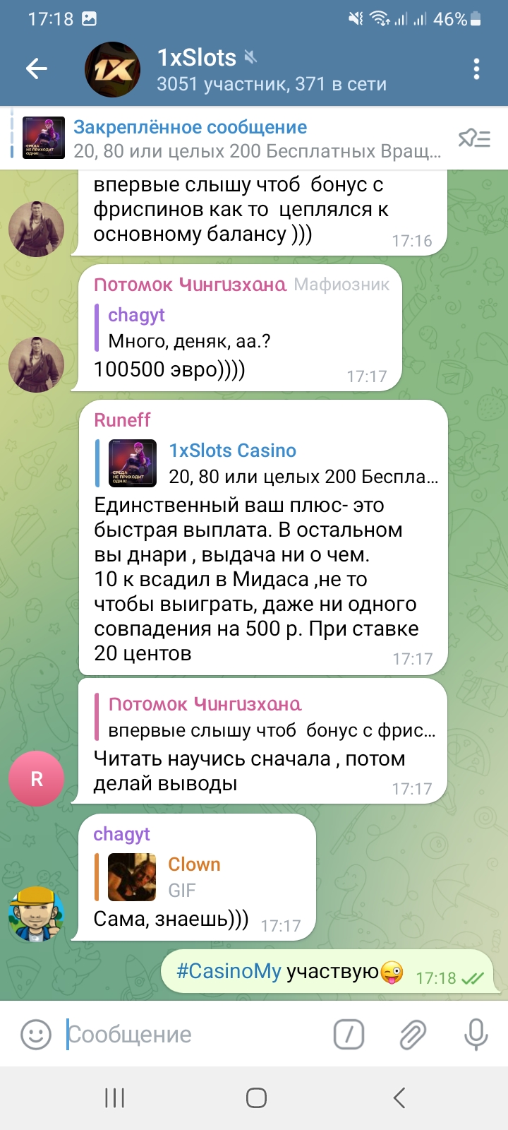 2) Быть подписанным на наш телеграмм канал https://t.me/casinomyforum и чат казино 1xSlots https://t.me/joinchat/TCG5aNJ_qCpI6SdO, в телеграмм чате 1xSlots https://t.me/joinchat/TCG5aNJ_qCpI6SdO написать любое сообщение с тегом #casinomy и разместить текст этого сообщения в этой теме вместе со скрином депозита.