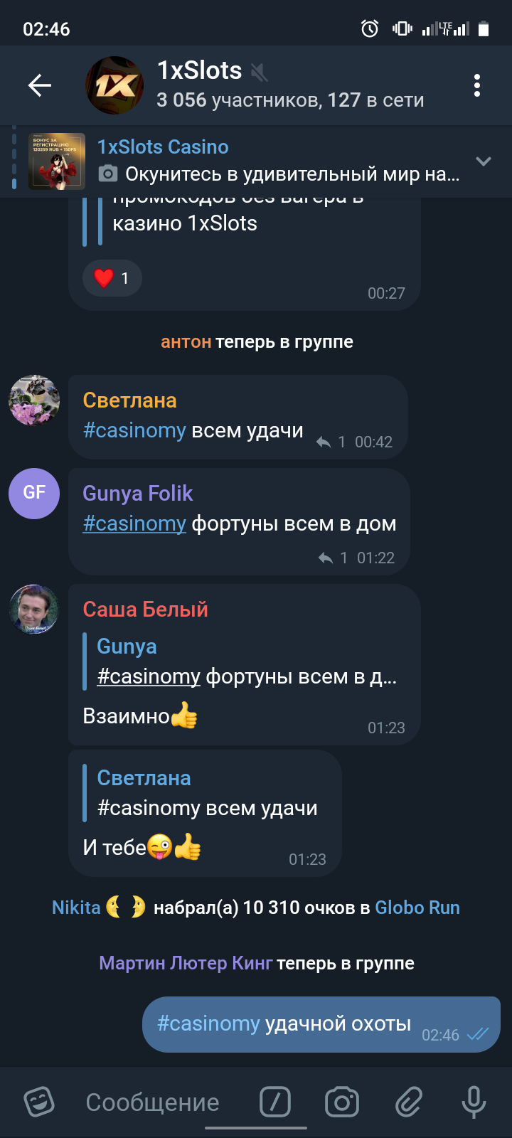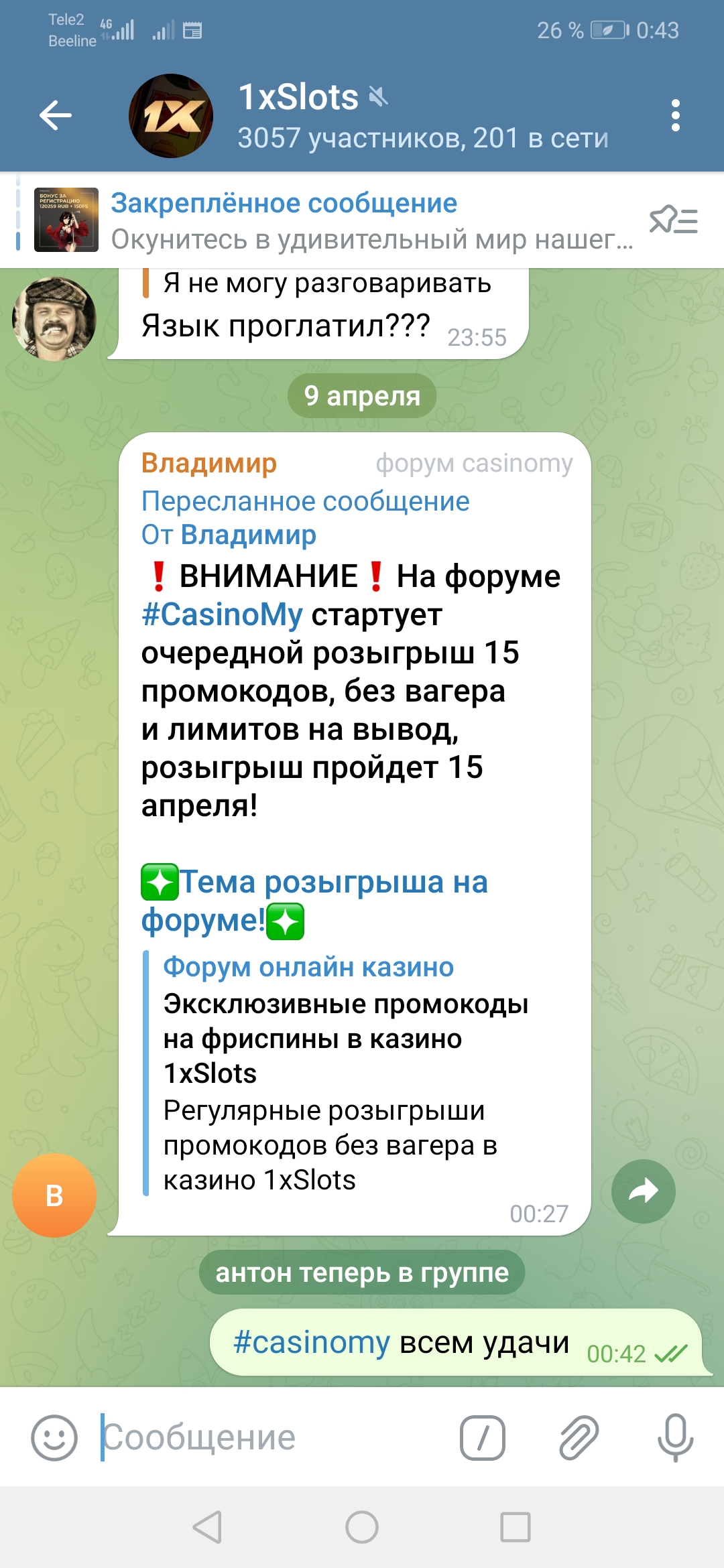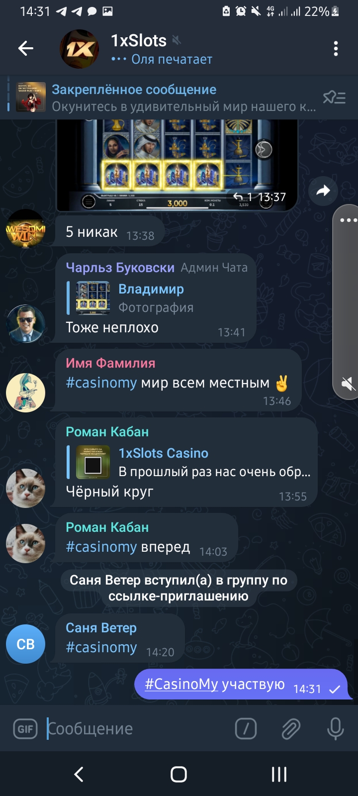 2) Быть подписанным на наш телеграмм канал https://t.me/casinomyforum и чат казино 1xSlots https://t.me/joinchat/TCG5aNJ_qCpI6SdO, в телеграмм чате 1xSlots https://t.me/joinchat/TCG5aNJ_qCpI6SdO написать любое сообщение с тегом #casinomy и разместить текст этого сообщения в этой теме вместе со скрином депозита.