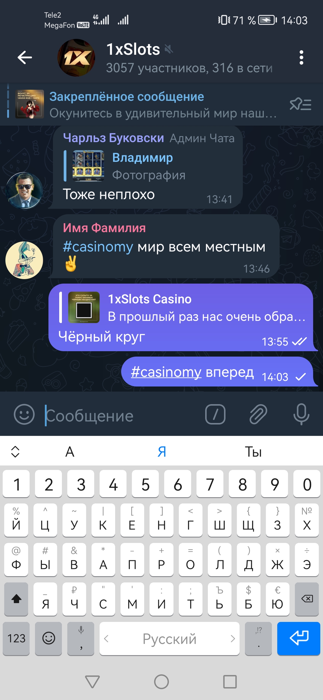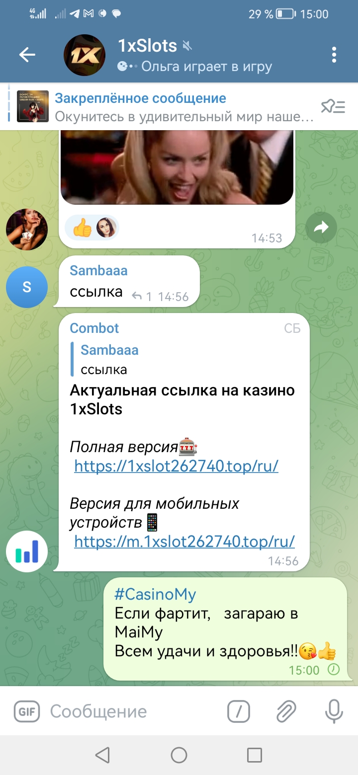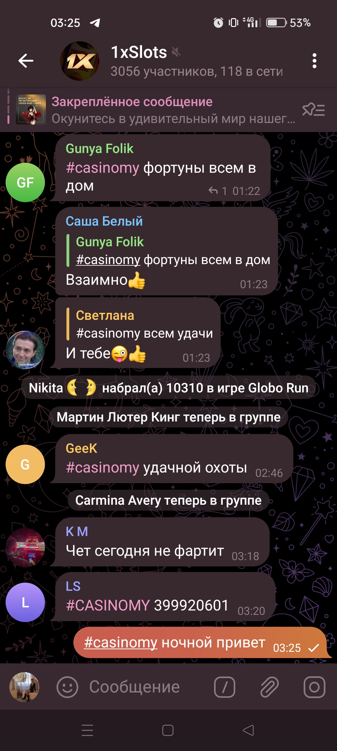 2) Быть подписанным на наш телеграмм канал https://t.me/casinomyforum и чат казино 1xSlots https://t.me/joinchat/TCG5aNJ_qCpI6SdO, в телеграмм чате 1xSlots https://t.me/joinchat/TCG5aNJ_qCpI6SdO написать любое сообщение с тегом #casinomy и разместить текст этого сообщения в этой теме вместе со скрином депозита.