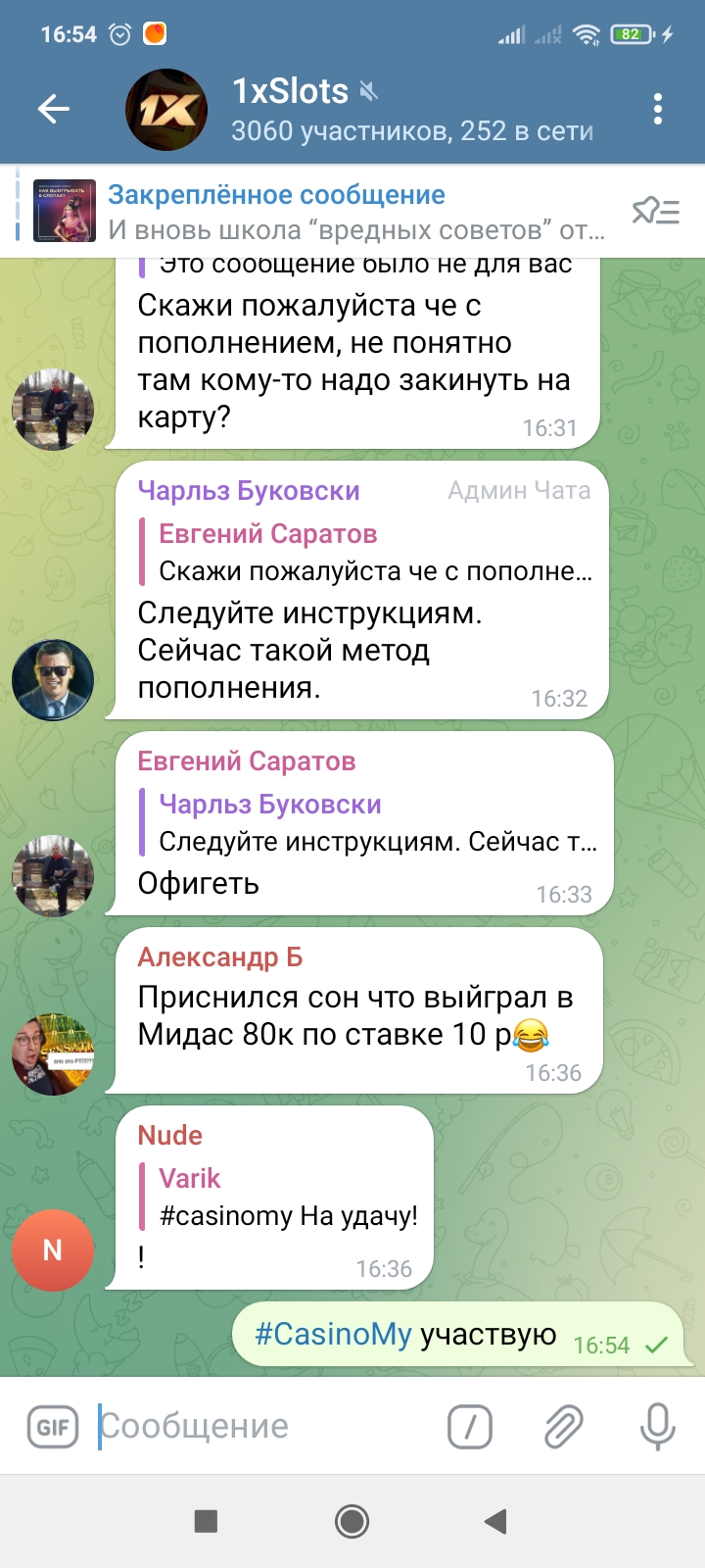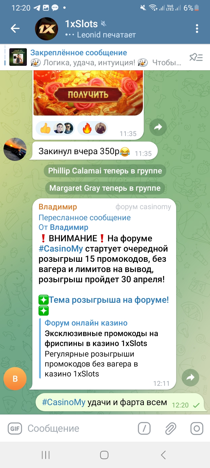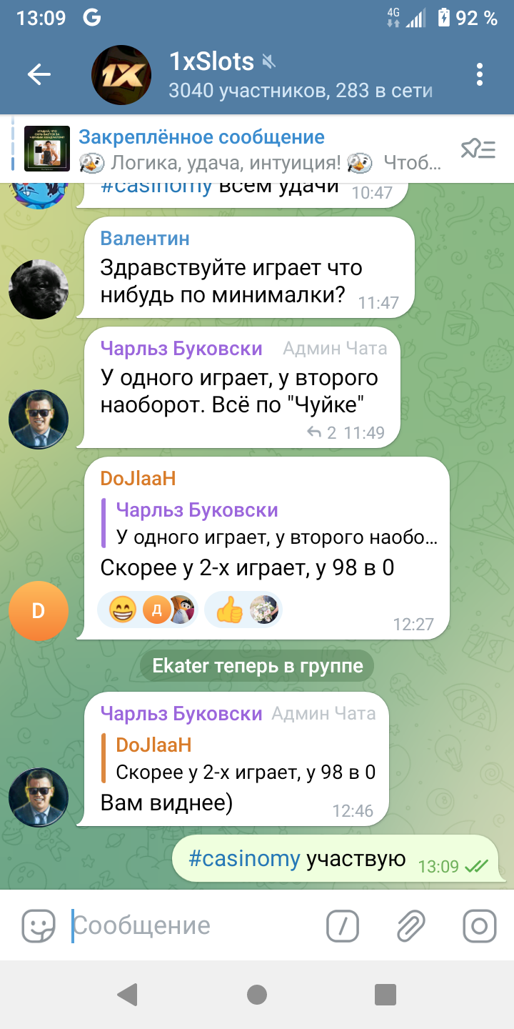 2) Быть подписанным на наш телеграмм канал https://t.me/casinomyforum и чат казино 1xSlots https://t.me/joinchat/TCG5aNJ_qCpI6SdO, в телеграмм чате 1xSlots https://t.me/joinchat/TCG5aNJ_qCpI6SdO написать любое сообщение с тегом #casinomy и разместить текст этого сообщения в этой теме вместе со скрином депозита.