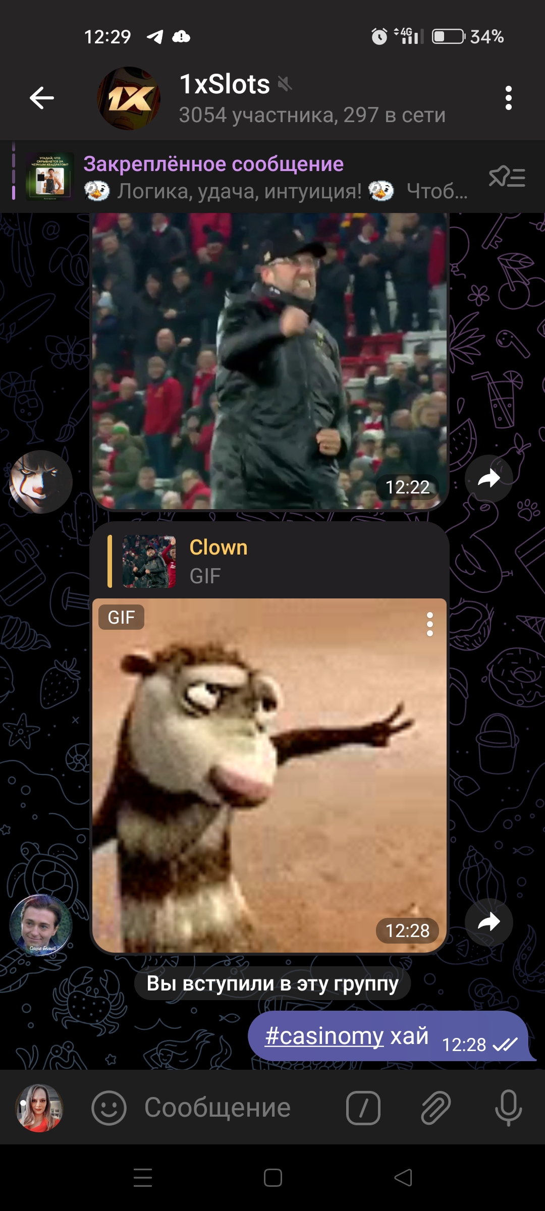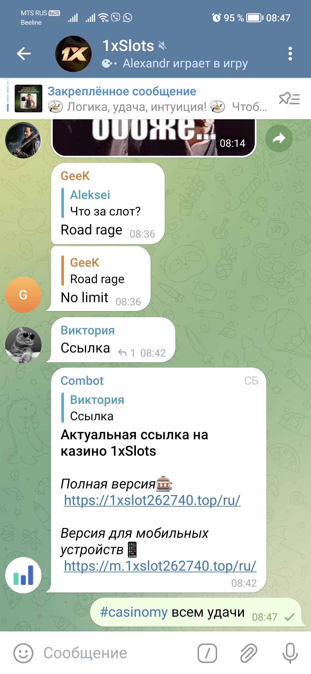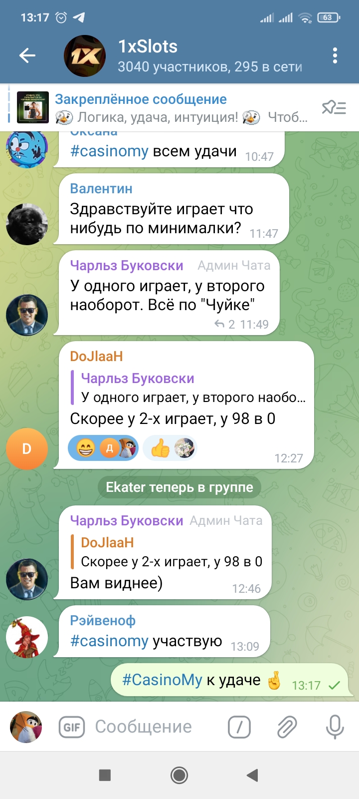 2) Быть подписанным на наш телеграмм канал https://t.me/casinomyforum и чат казино 1xSlots https://t.me/joinchat/TCG5aNJ_qCpI6SdO, в телеграмм чате 1xSlots https://t.me/joinchat/TCG5aNJ_qCpI6SdO написать любое сообщение с тегом #casinomy и разместить текст этого сообщения в этой теме вместе со скрином депозита.