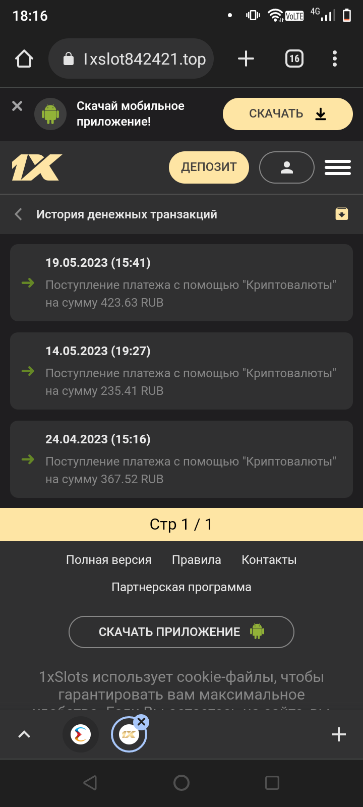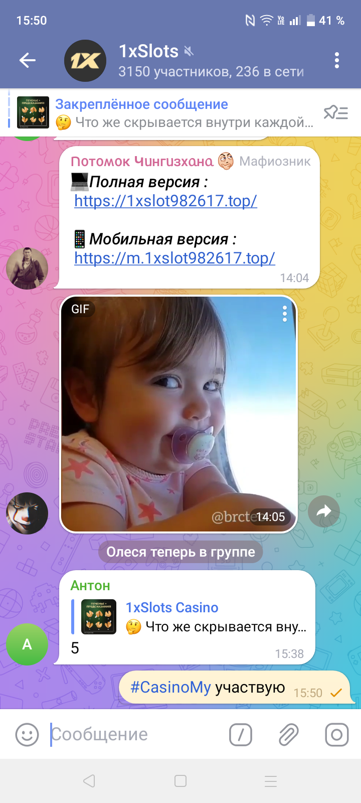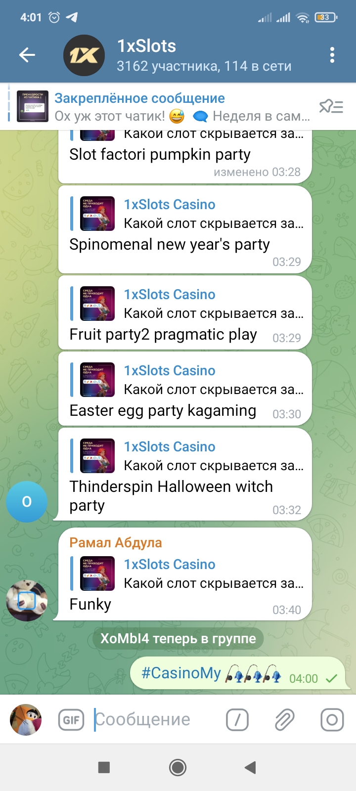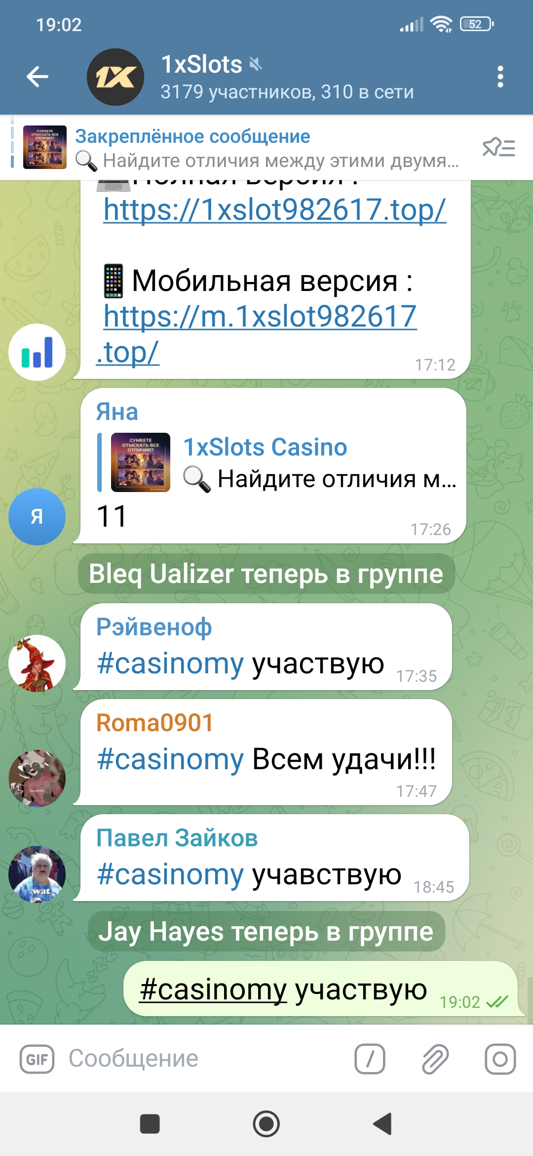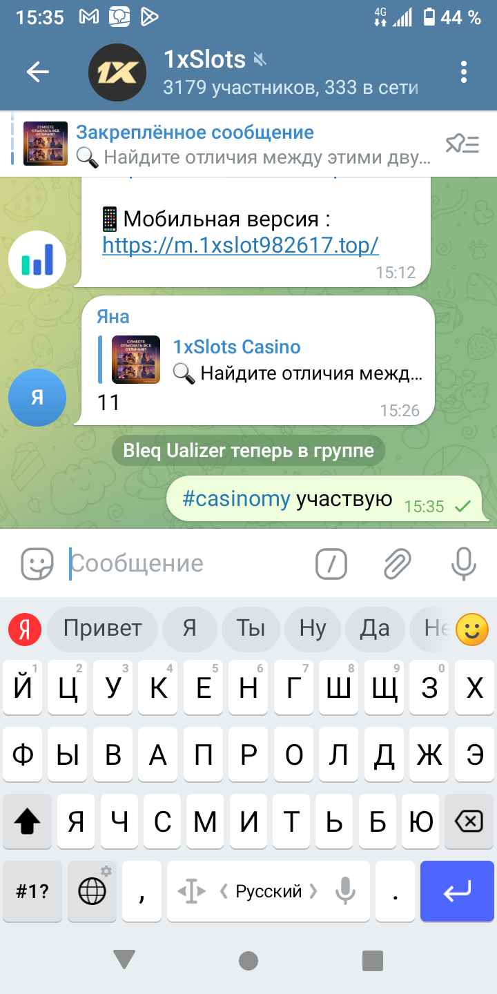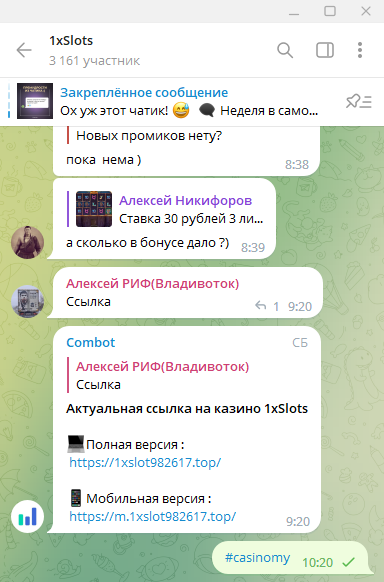 2) Быть подписанным на наш телеграмм канал https://t.me/casinomyforum и чат казино 1xSlots https://t.me/joinchat/TCG5aNJ_qCpI6SdO, в телеграмм чате 1xSlots https://t.me/joinchat/TCG5aNJ_qCpI6SdO написать любое сообщение с тегом #casinomy и разместить текст этого сообщения в этой теме вместе со скрином депозита.