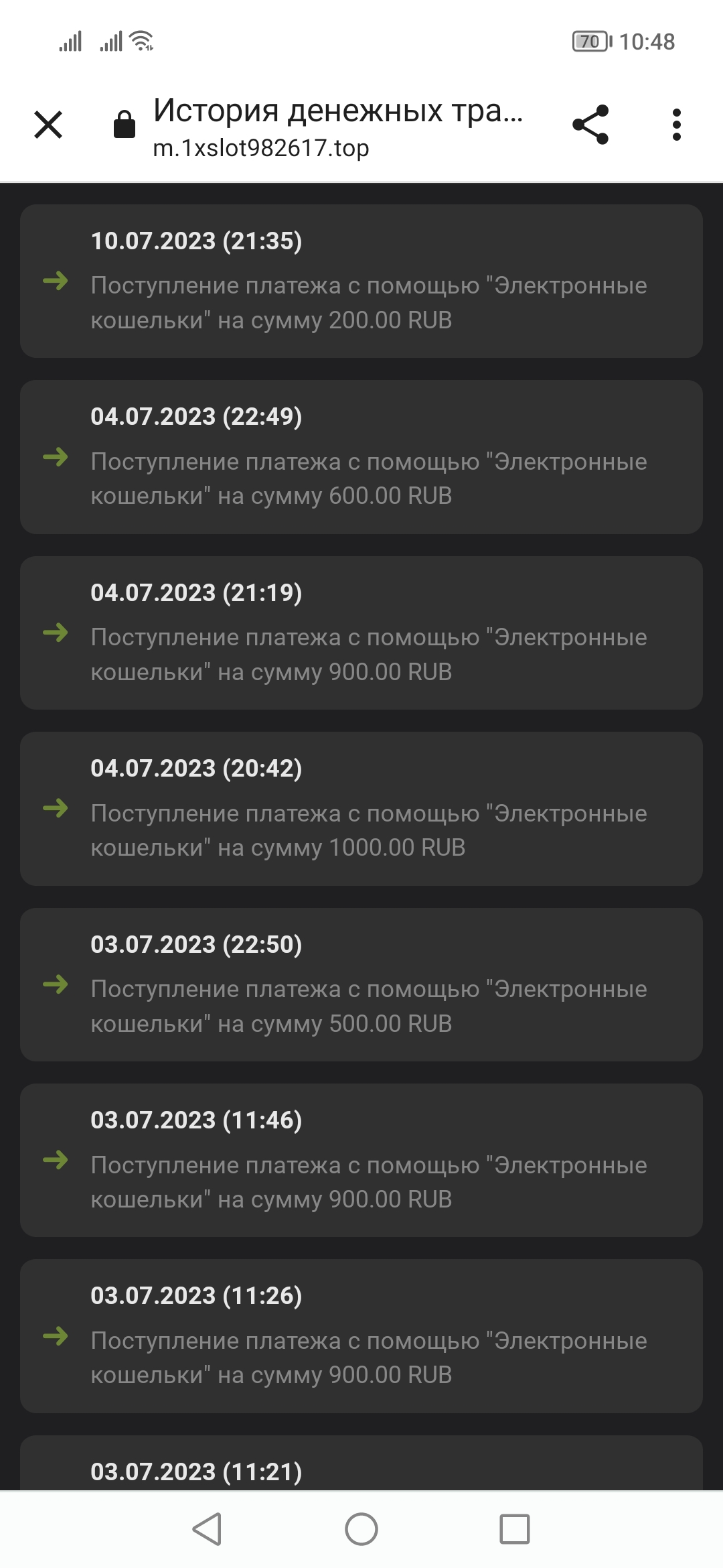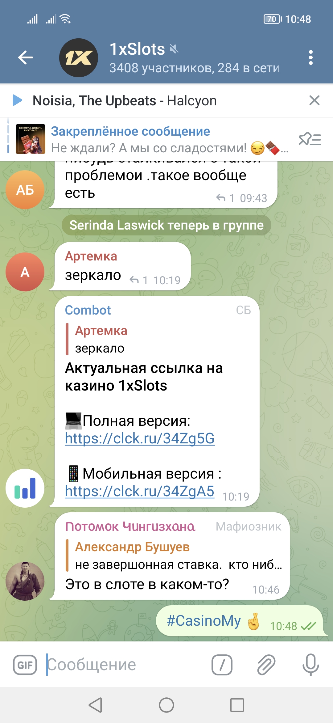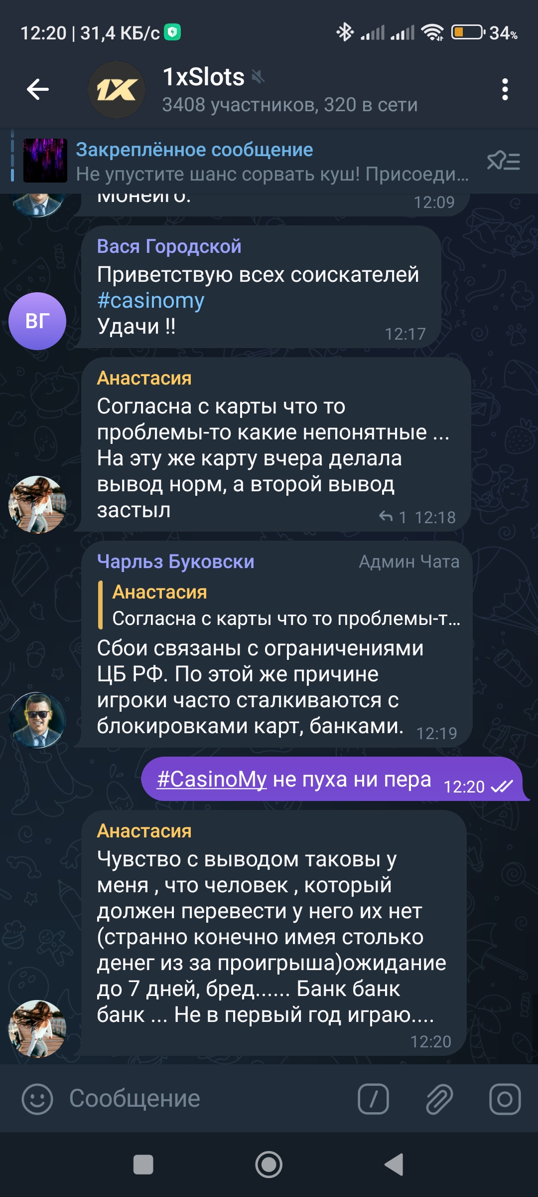 2) Быть подписанным на наш телеграмм канал https://t.me/casinomyforum и чат казино 1xSlots https://t.me/joinchat/TCG5aNJ_qCpI6SdO, в телеграмм чате 1xSlots https://t.me/joinchat/TCG5aNJ_qCpI6SdO написать любое сообщение с тегом #casinomy и разместить текст этого сообщения в этой теме вместе со скрином депозита.