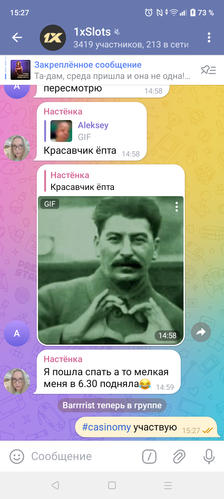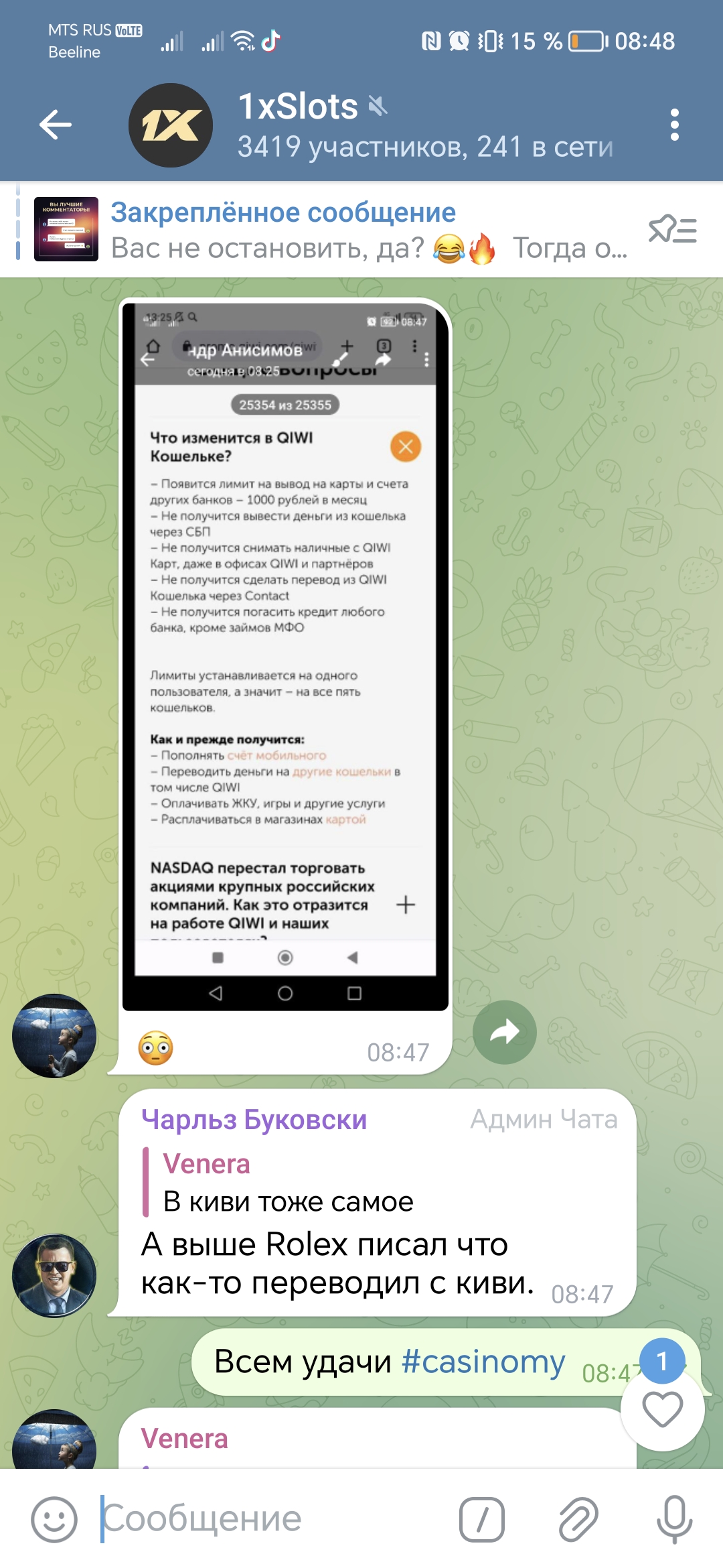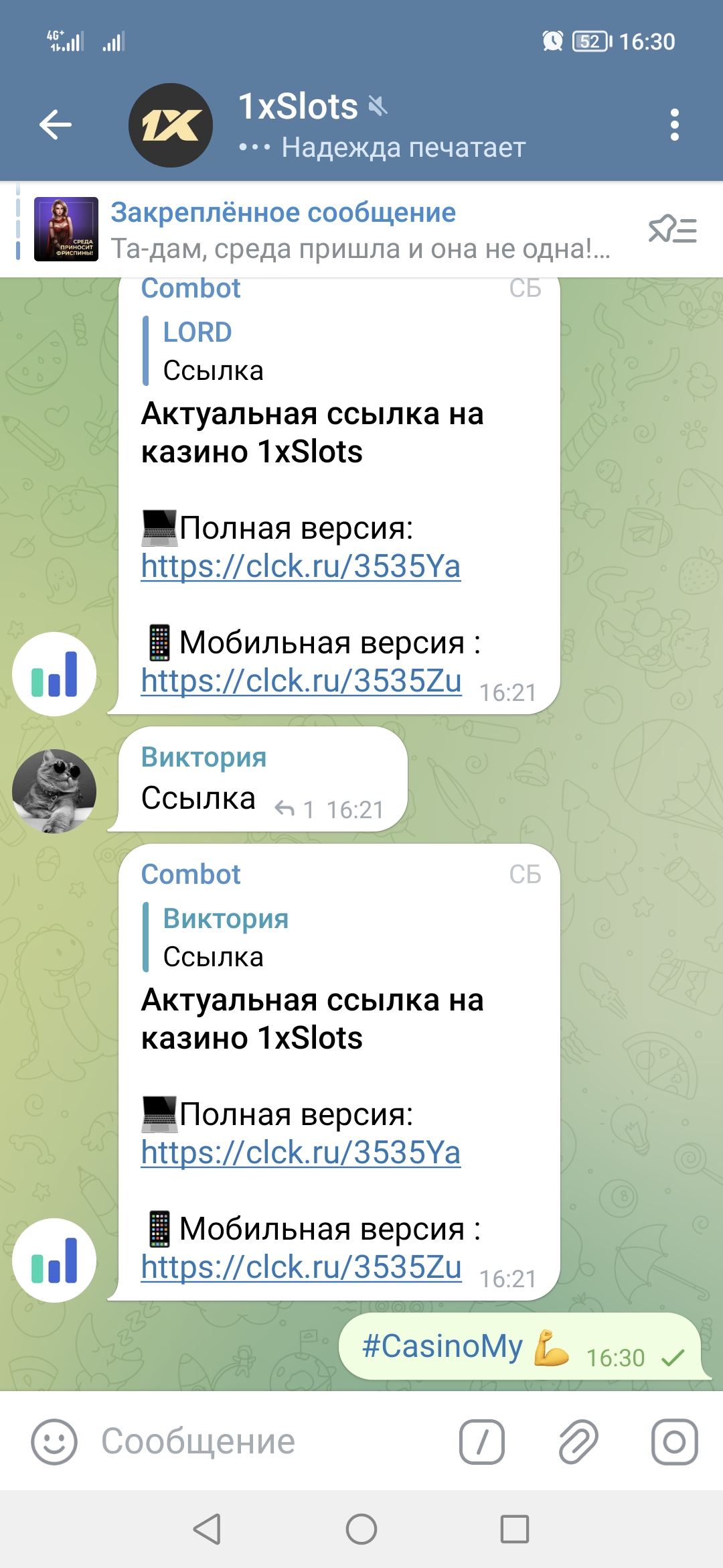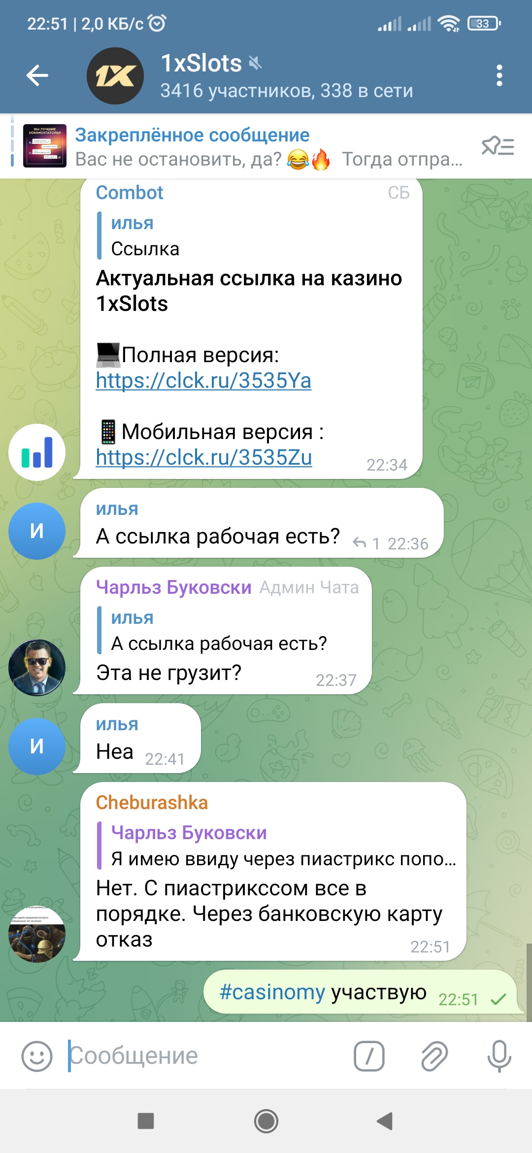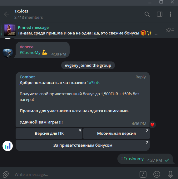 2) Быть подписанным на наш новый форум в телеграмм https://t.me/forumcasinomy и чат казино 1xSlots https://t.me/joinchat/TCG5aNJ_qCpI6SdO, в телеграмм чате 1xSlots https://t.me/joinchat/TCG5aNJ_qCpI6SdO написать любое сообщение с тегом #casinomy и разместить текст этого сообщения в этой теме вместе со скрином депозита.
