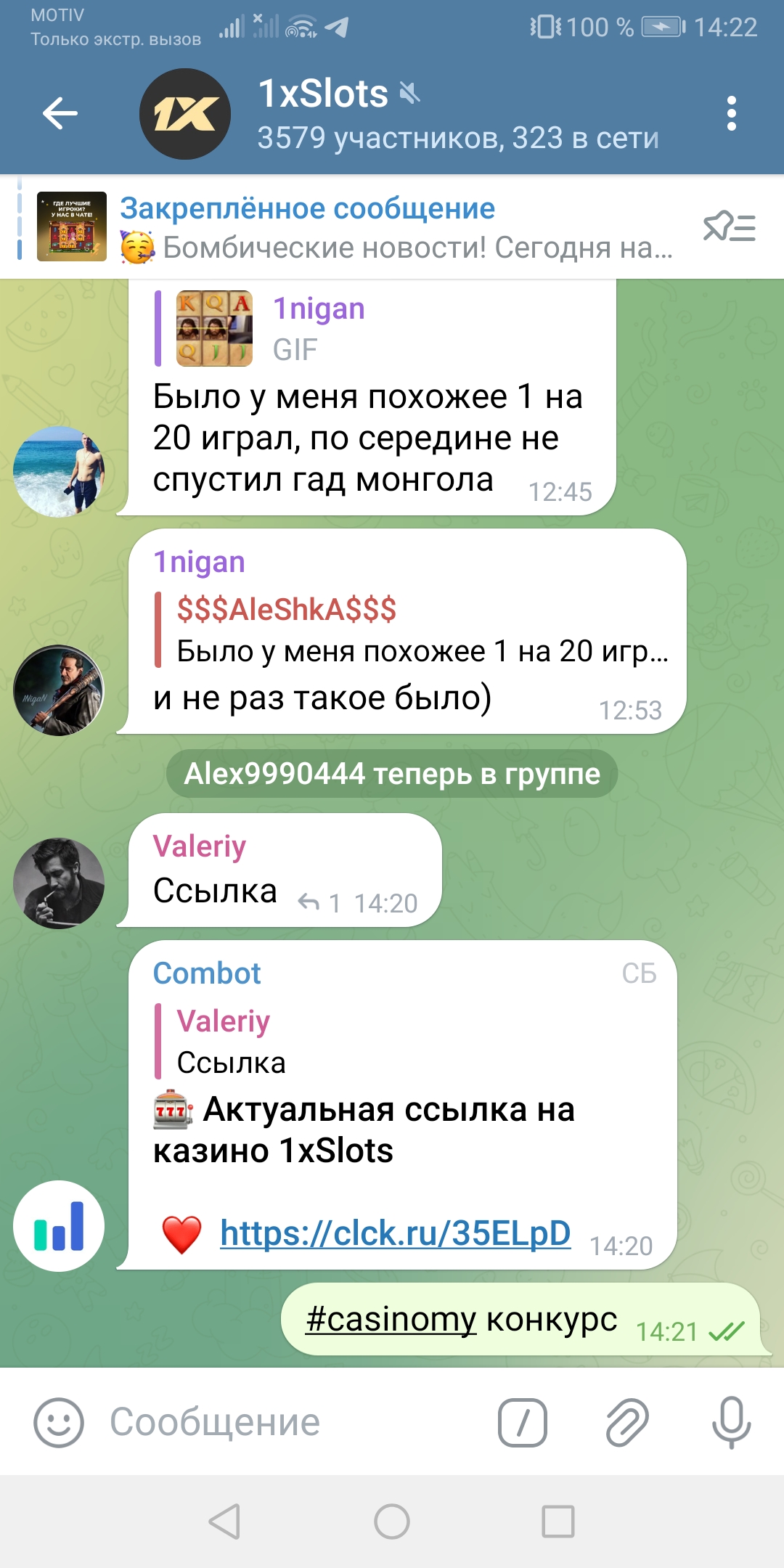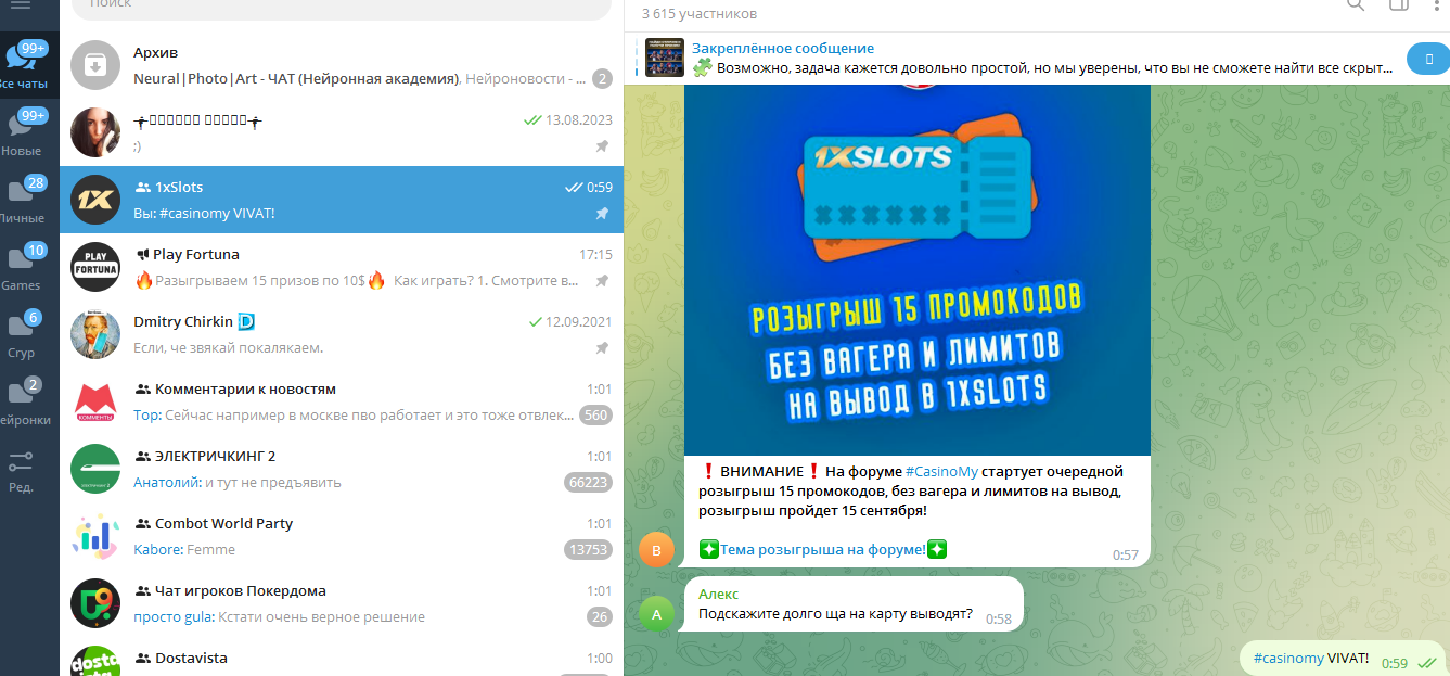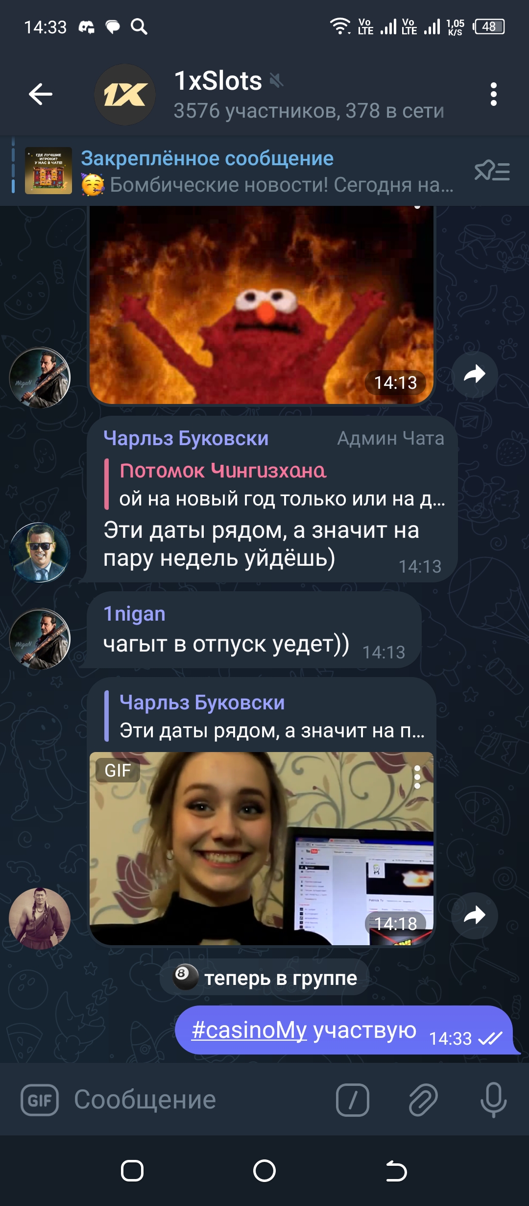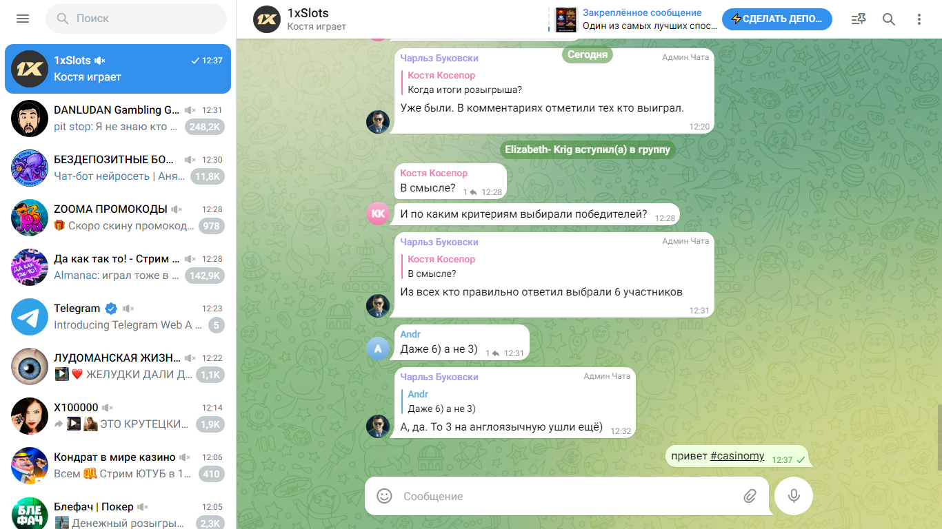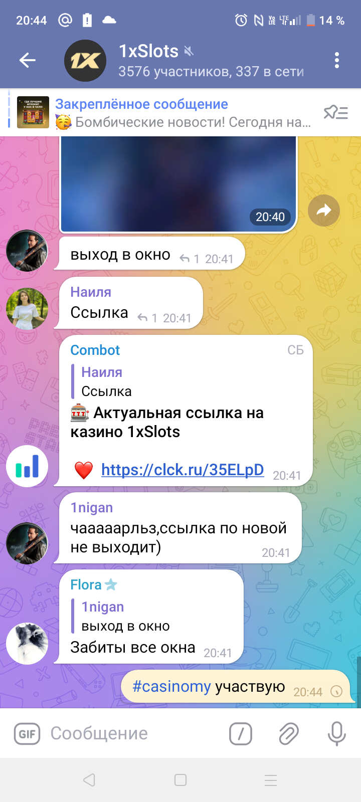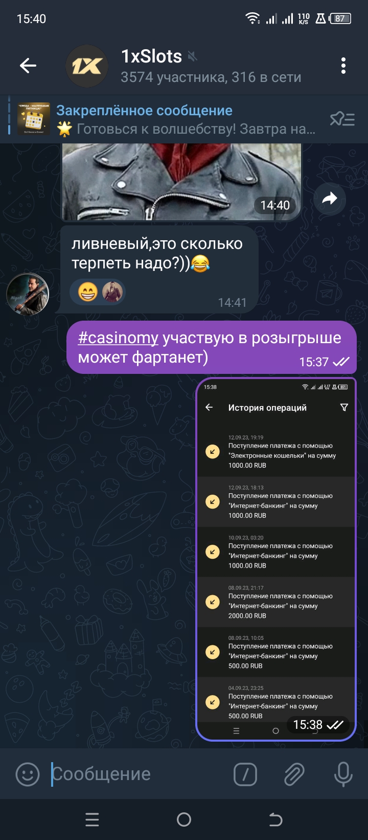 2) Быть подписанным на наш новый форум в телеграмм https://t.me/forumcasinomy и чат казино 1xSlots https://t.me/joinchat/TCG5aNJ_qCpI6SdO, в телеграмм чате 1xSlots https://t.me/joinchat/TCG5aNJ_qCpI6SdO написать любое сообщение с тегом #casinomy и разместить текст этого сообщения в этой теме вместе со скрином депозита.