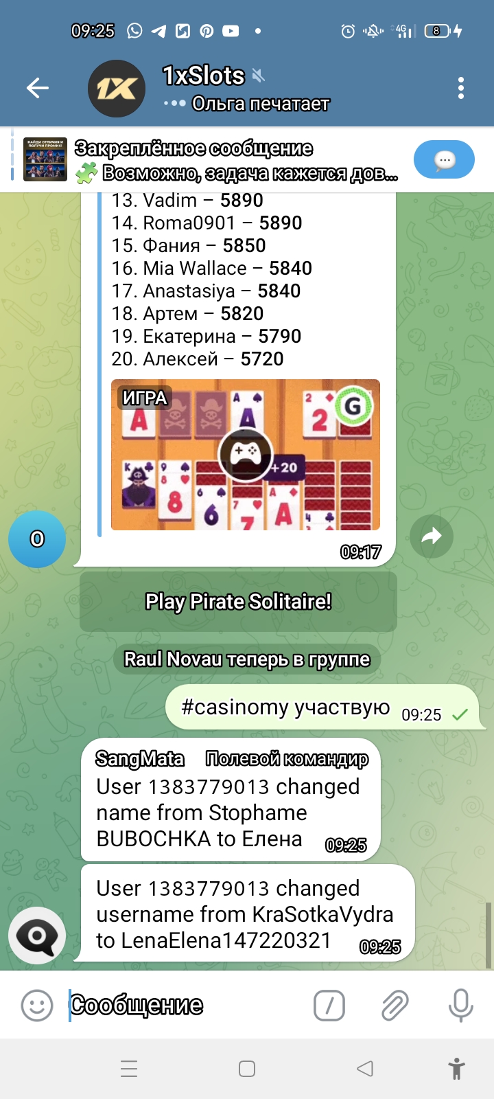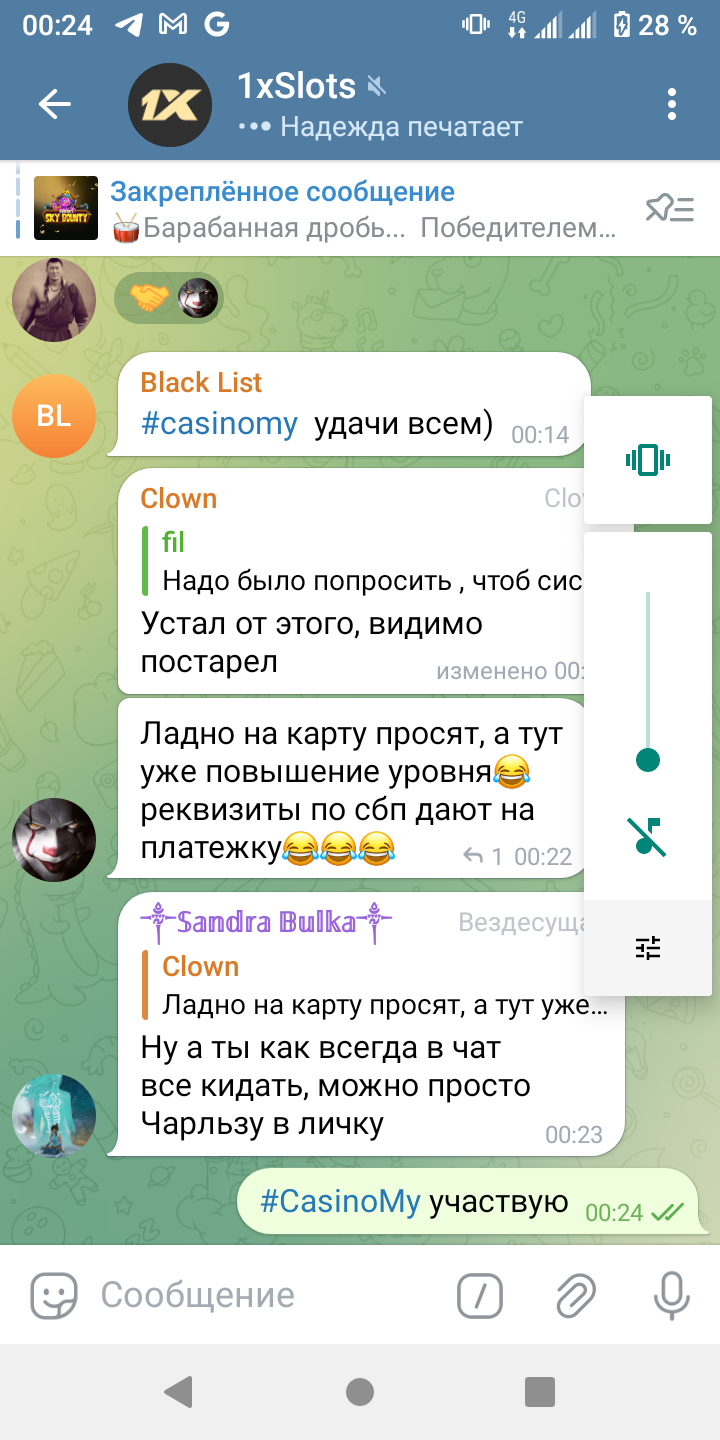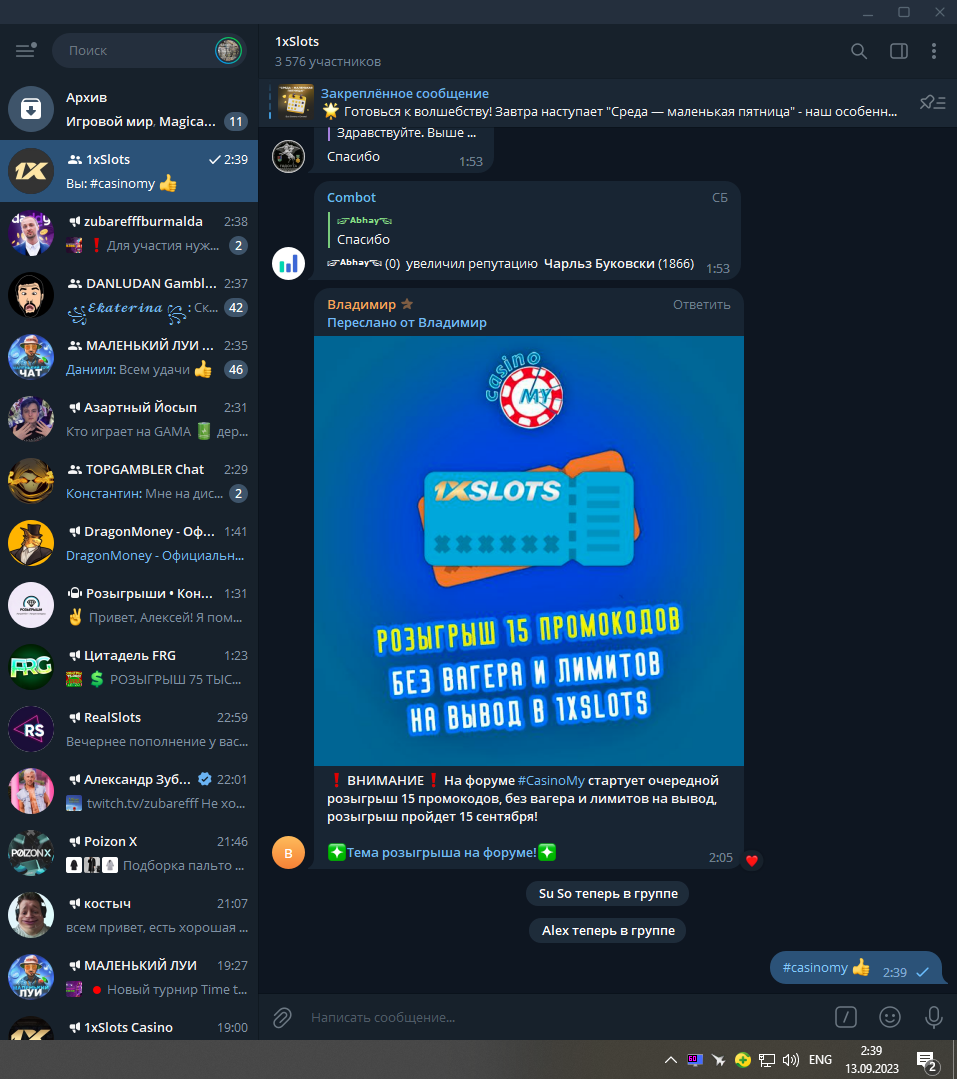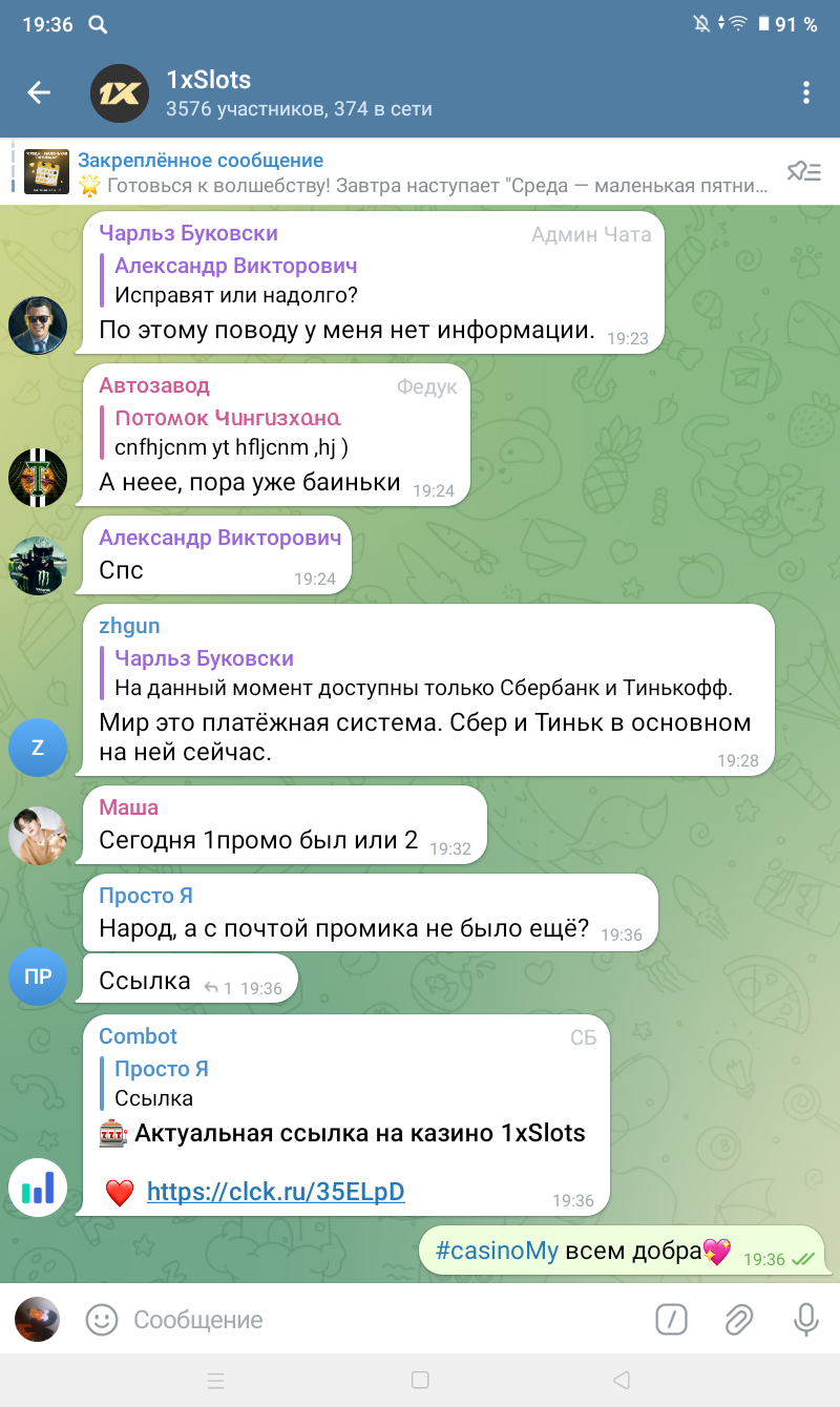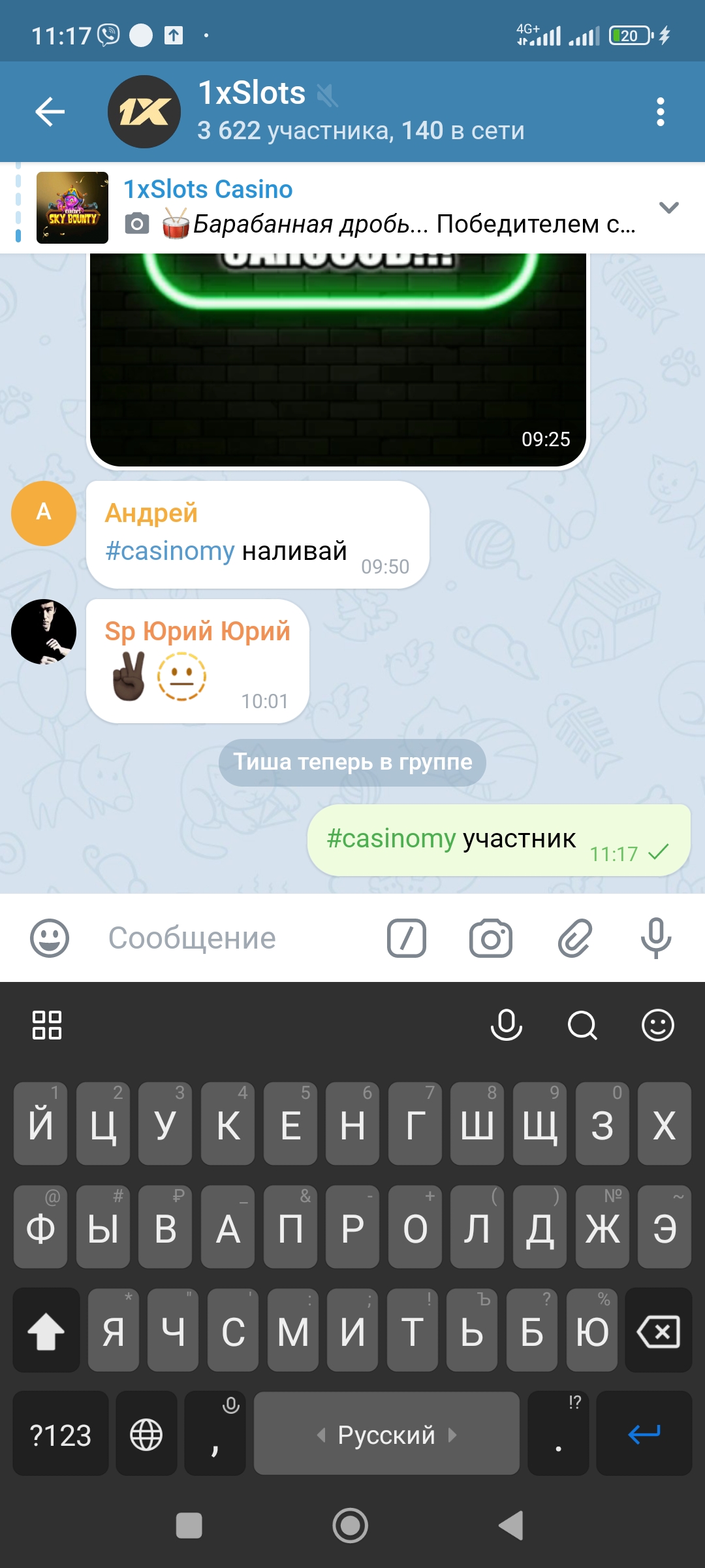 2) Быть подписанным на наш новый форум в телеграмм https://t.me/forumcasinomy и чат казино 1xSlots https://t.me/joinchat/TCG5aNJ_qCpI6SdO, в телеграмм чате 1xSlots https://t.me/joinchat/TCG5aNJ_qCpI6SdO написать любое сообщение с тегом #casinomy и разместить текст этого сообщения в этой теме вместе со скрином депозита.