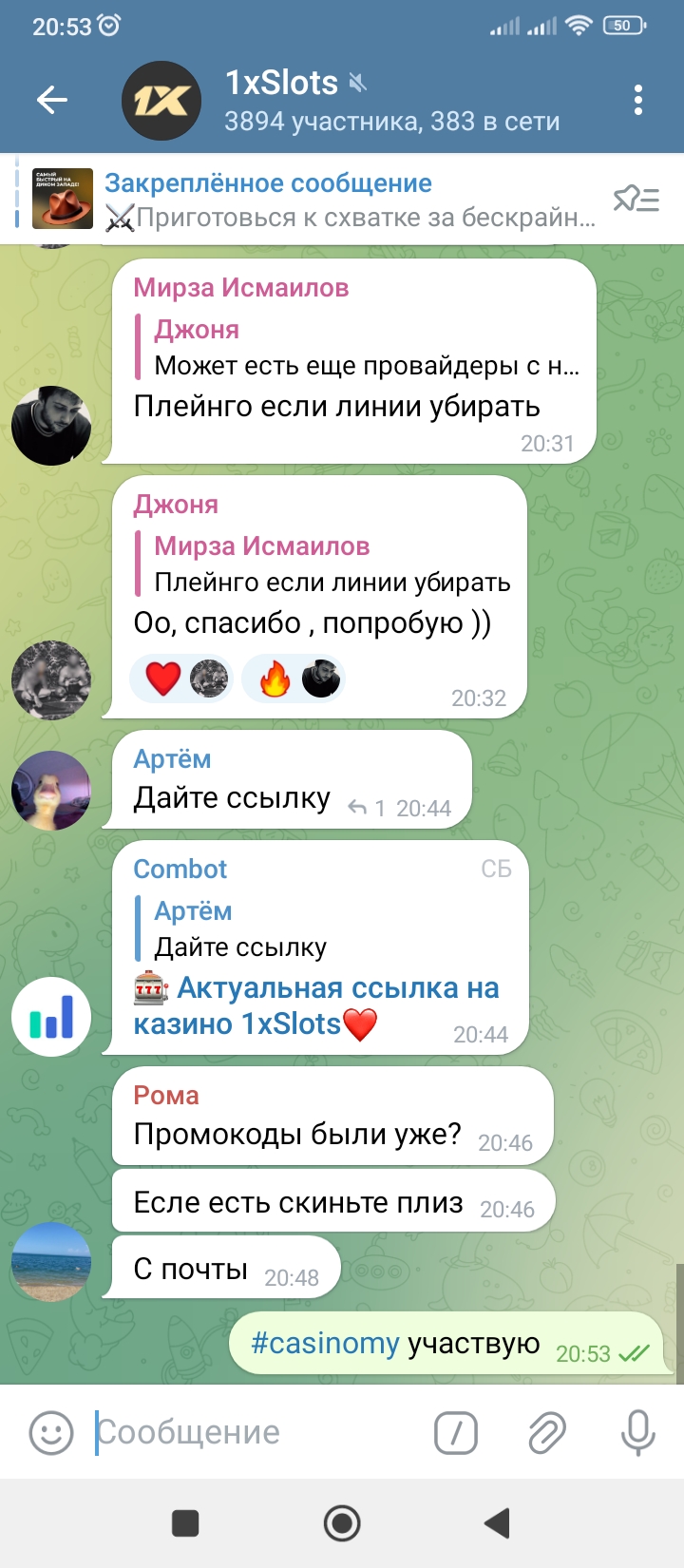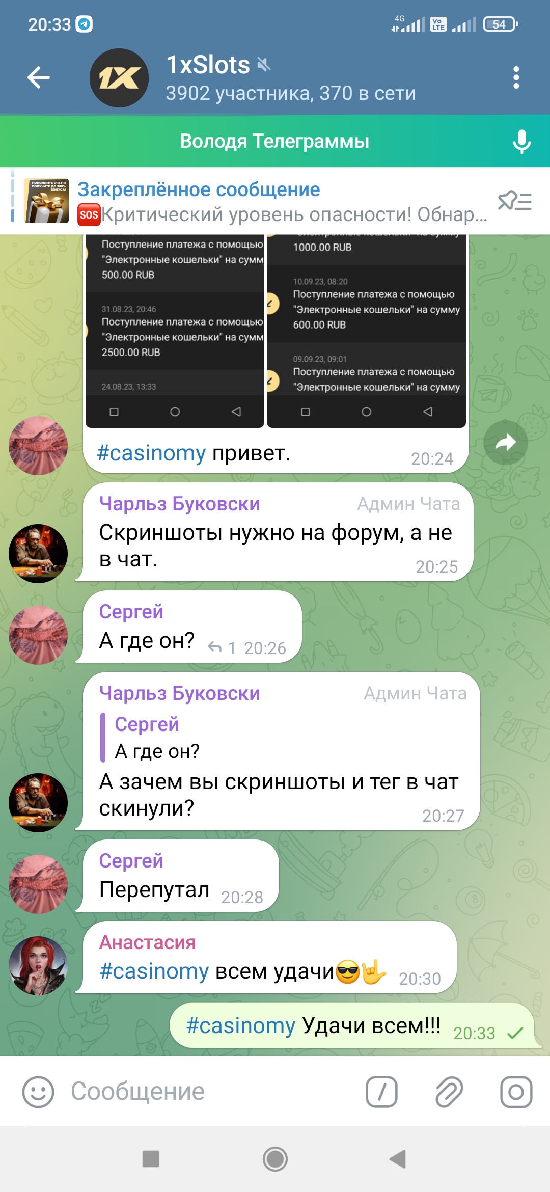 2) Быть подписанным на наш новый форум в телеграмм https://t.me/forumcasinomy и чат казино 1xSlots https://t.me/joinchat/TCG5aNJ_qCpI6SdO, в телеграмм чате 1xSlots https://t.me/joinchat/TCG5aNJ_qCpI6SdO написать любое сообщение с тегом #casinomy и разместить текст этого сообщения в этой теме вместе со скрином депозита.