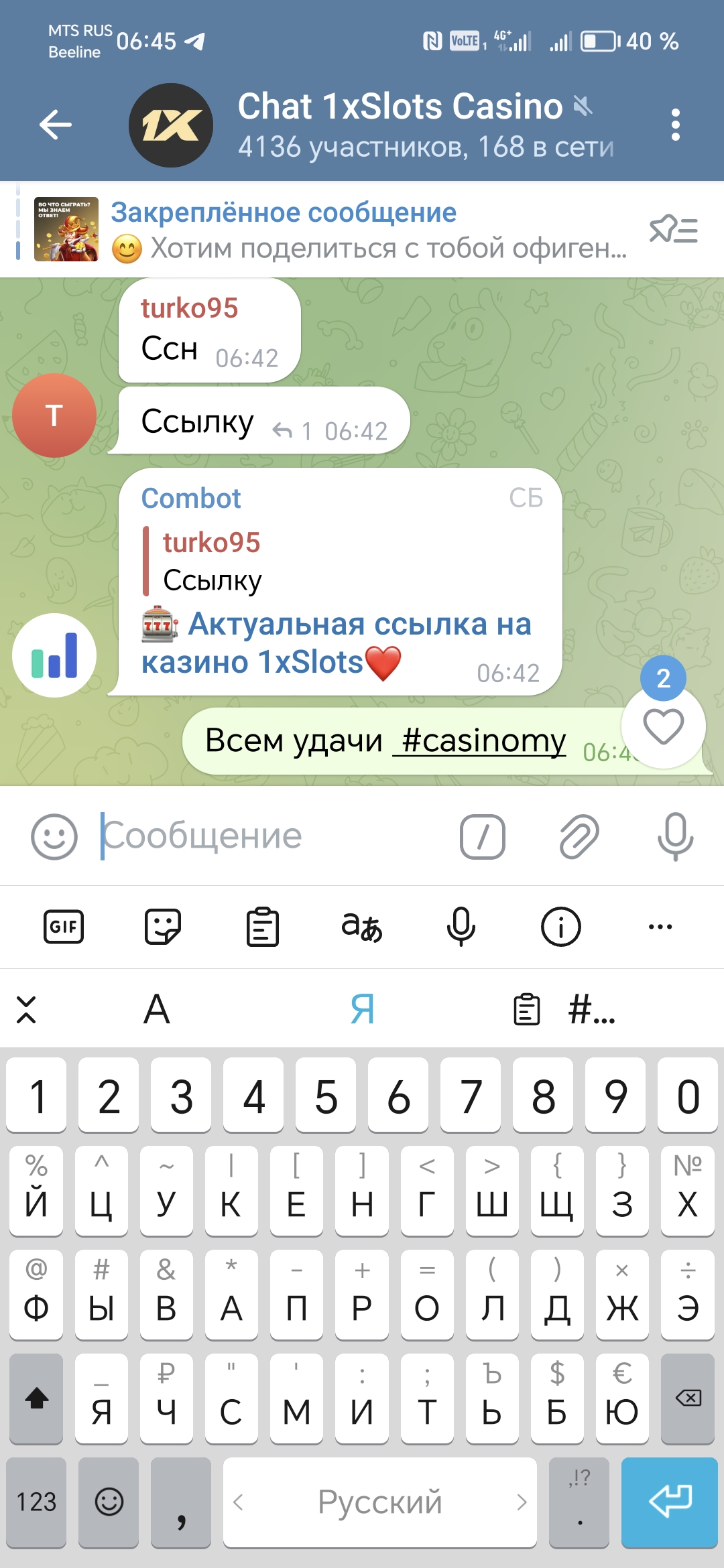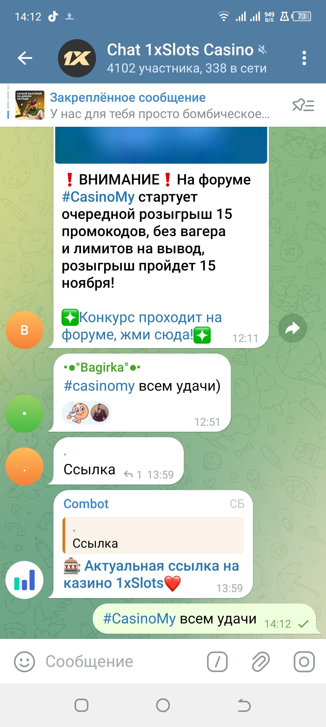 2) Быть подписанным на наш новый форум в телеграмм https://t.me/forumcasinomy и чат казино 1xSlots https://t.me/joinchat/TCG5aNJ_qCpI6SdO, в телеграмм чате 1xSlots https://t.me/joinchat/TCG5aNJ_qCpI6SdO написать любое сообщение с тегом #casinomy и разместить текст этого сообщения в этой теме вместе со скрином депозита.