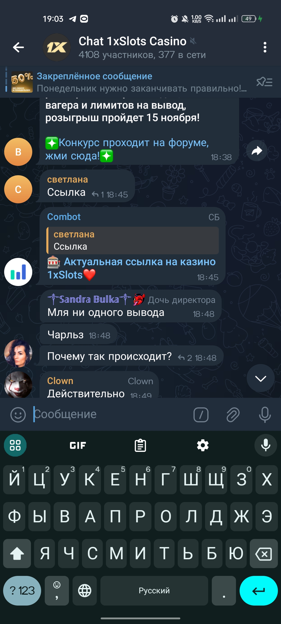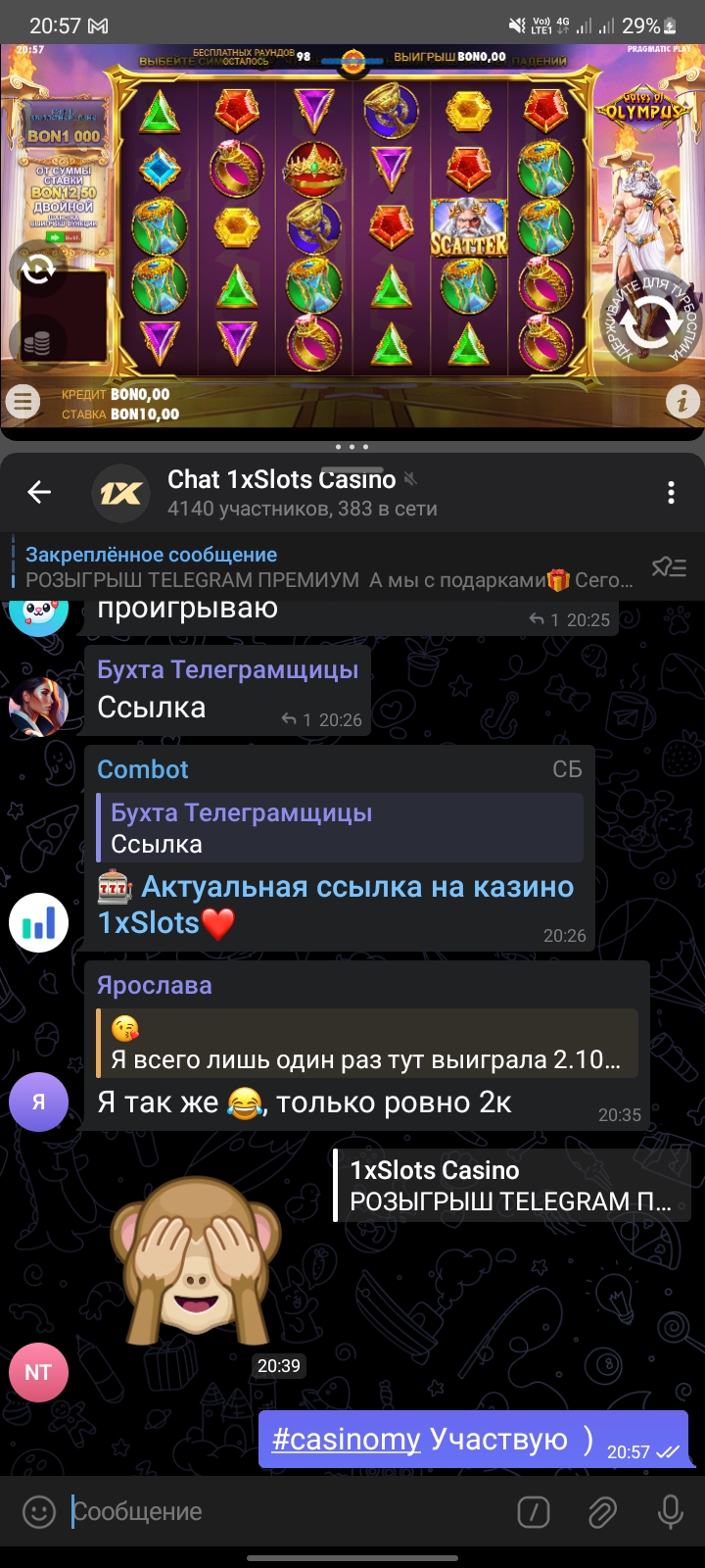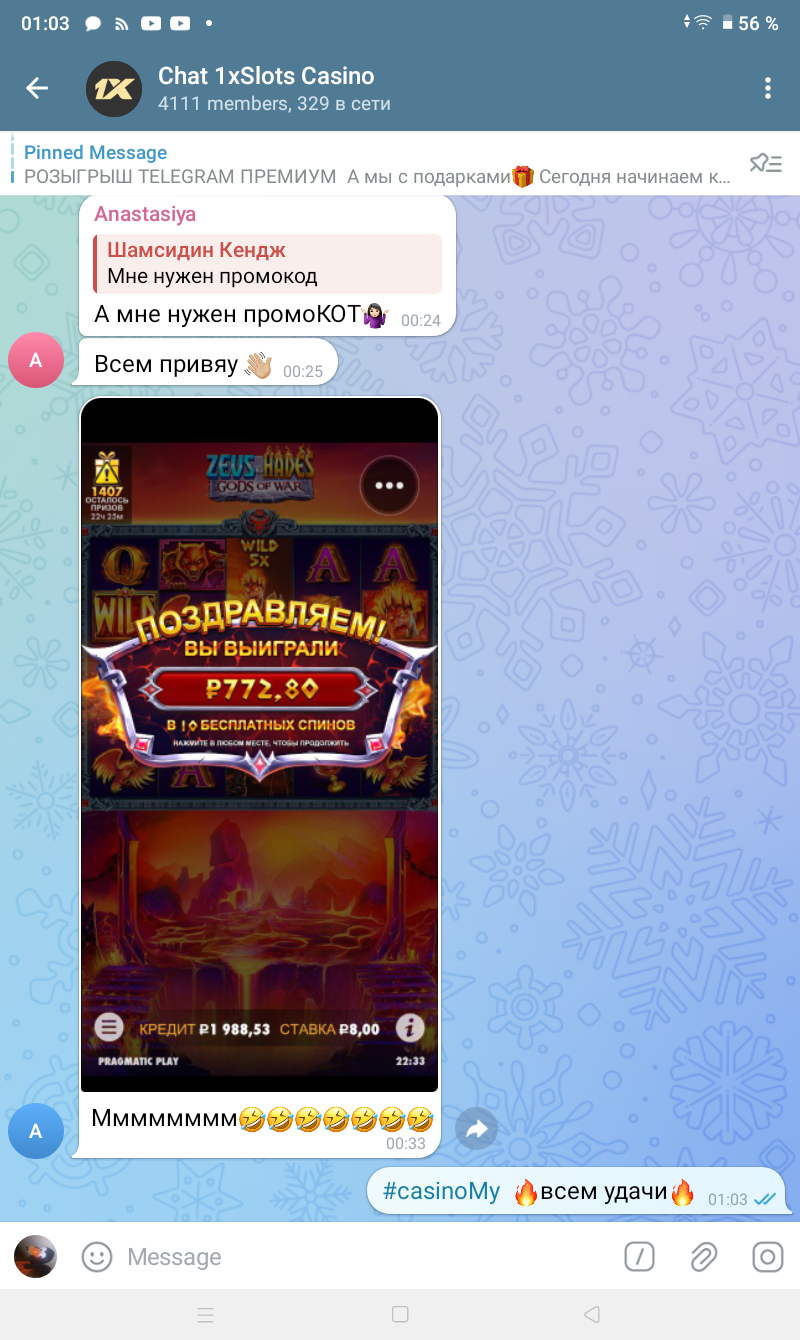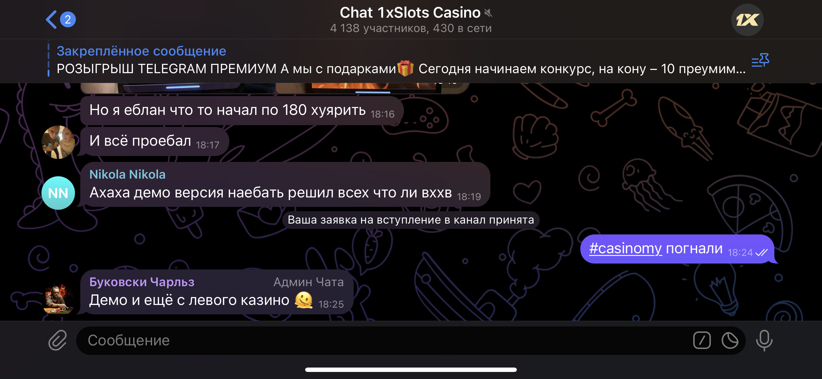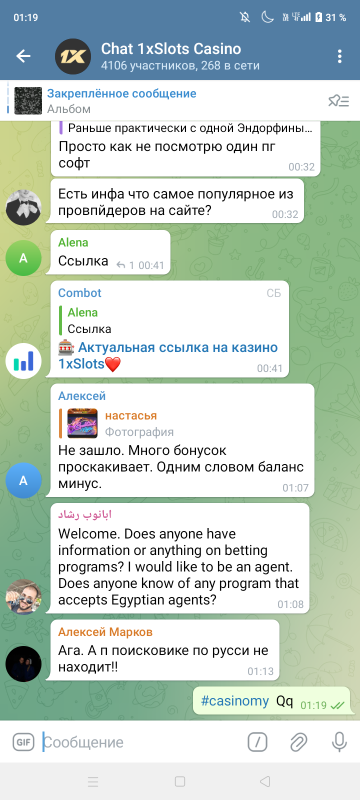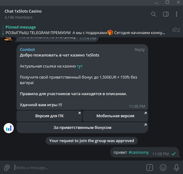2) Быть подписанным на наш новый форум в телеграмм https://t.me/forumcasinomy и чат казино 1xSlots https://t.me/joinchat/TCG5aNJ_qCpI6SdO, в телеграмм чате 1xSlots https://t.me/joinchat/TCG5aNJ_qCpI6SdO написать любое сообщение с тегом #casinomy и разместить текст этого сообщения в этой теме вместе со скрином депозита.