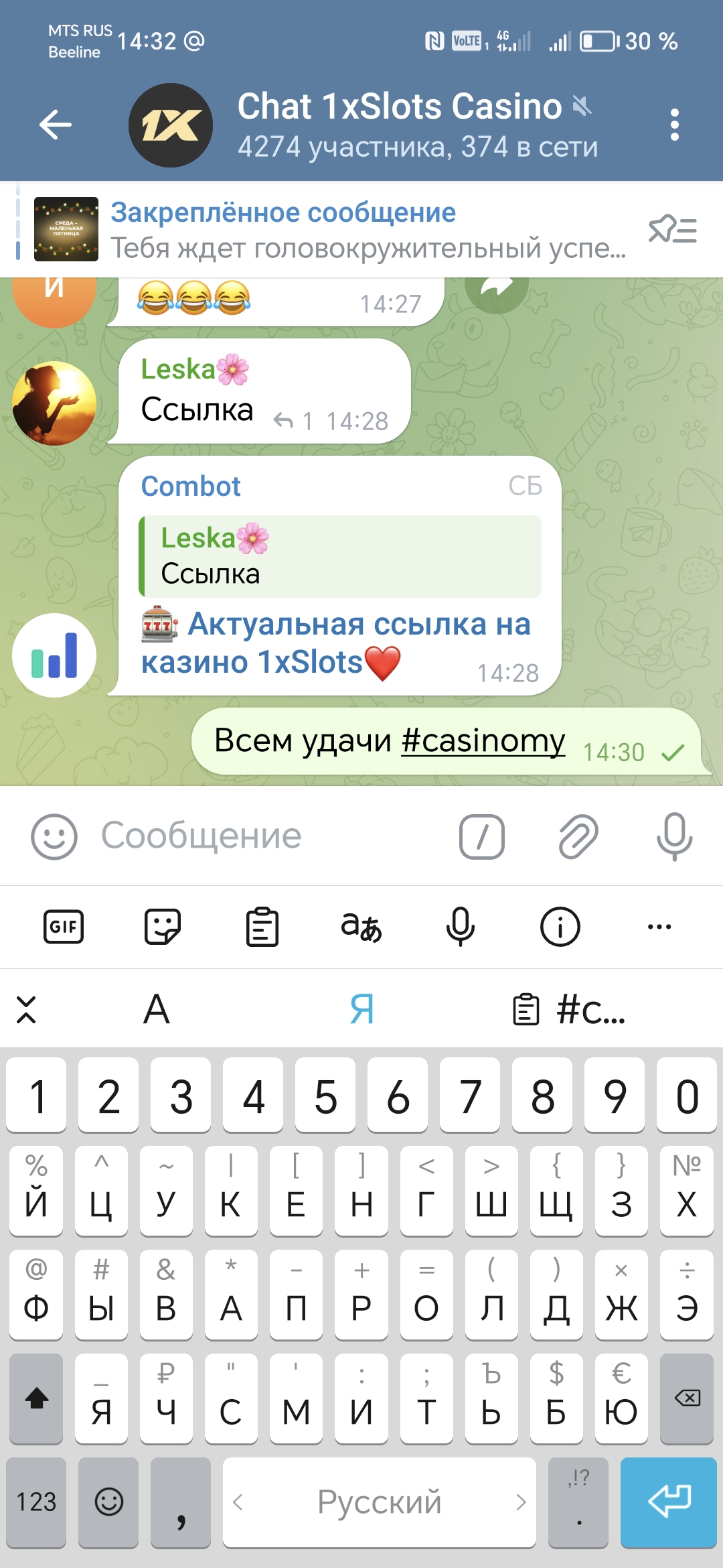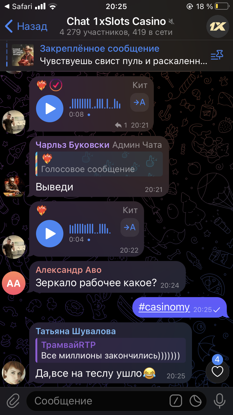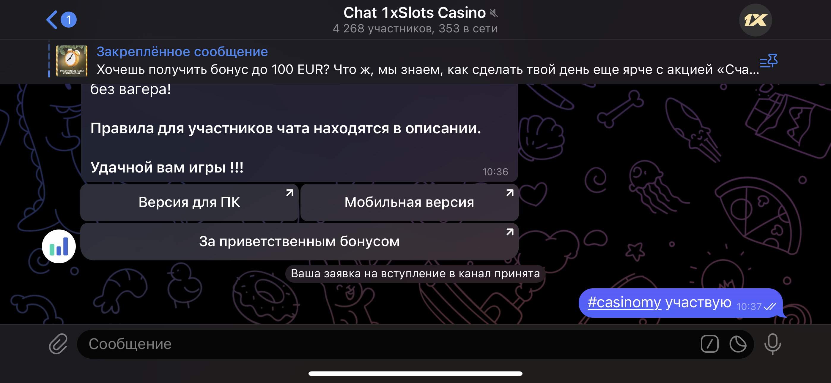 2) Быть подписанным на наш новый форум в телеграмм https://t.me/forumcasinomy и чат казино 1xSlots https://t.me/joinchat/TCG5aNJ_qCpI6SdO, в телеграмм чате 1xSlots https://t.me/joinchat/TCG5aNJ_qCpI6SdO написать любое сообщение с тегом #casinomy и разместить текст этого сообщения в этой теме вместе со скрином депозита.