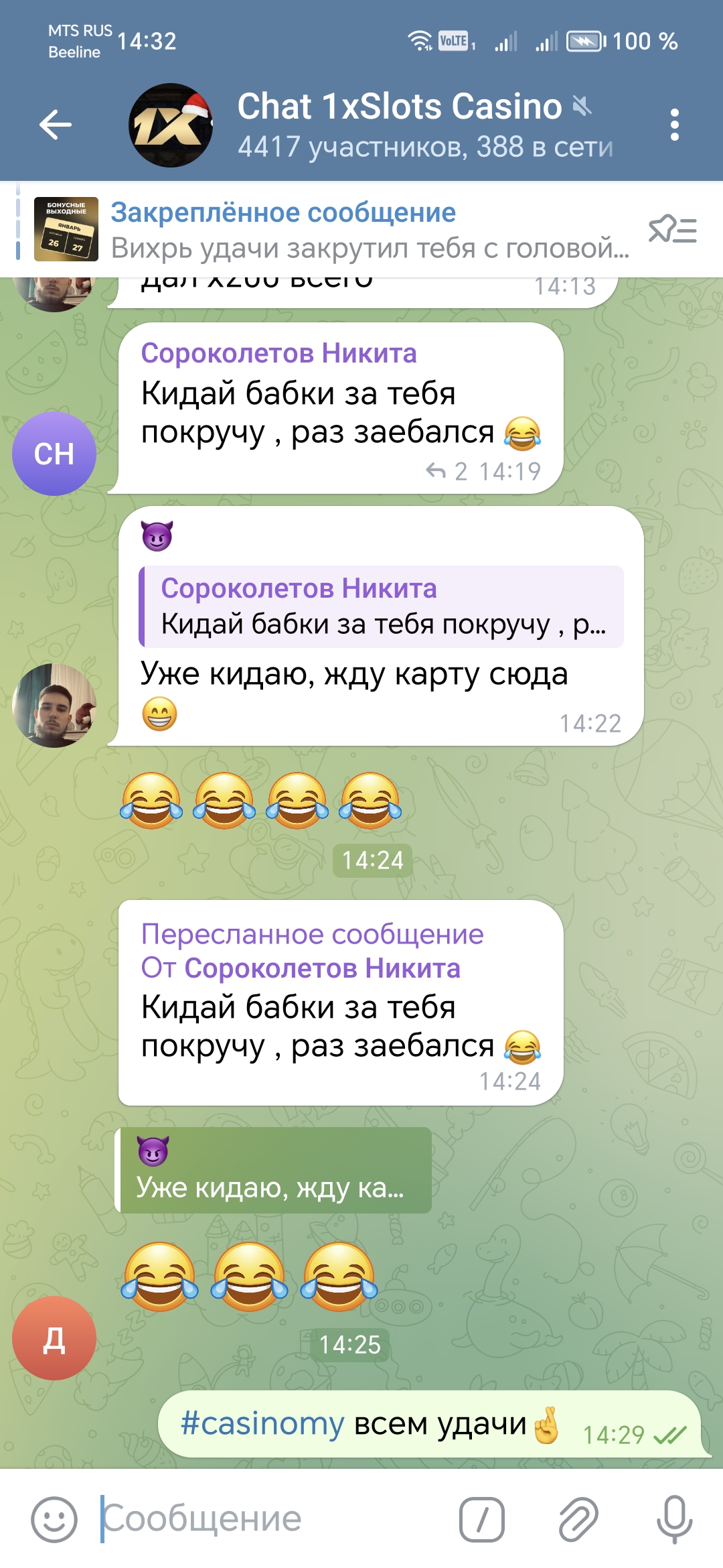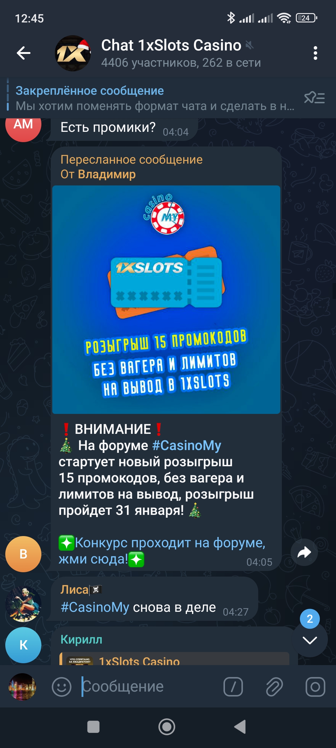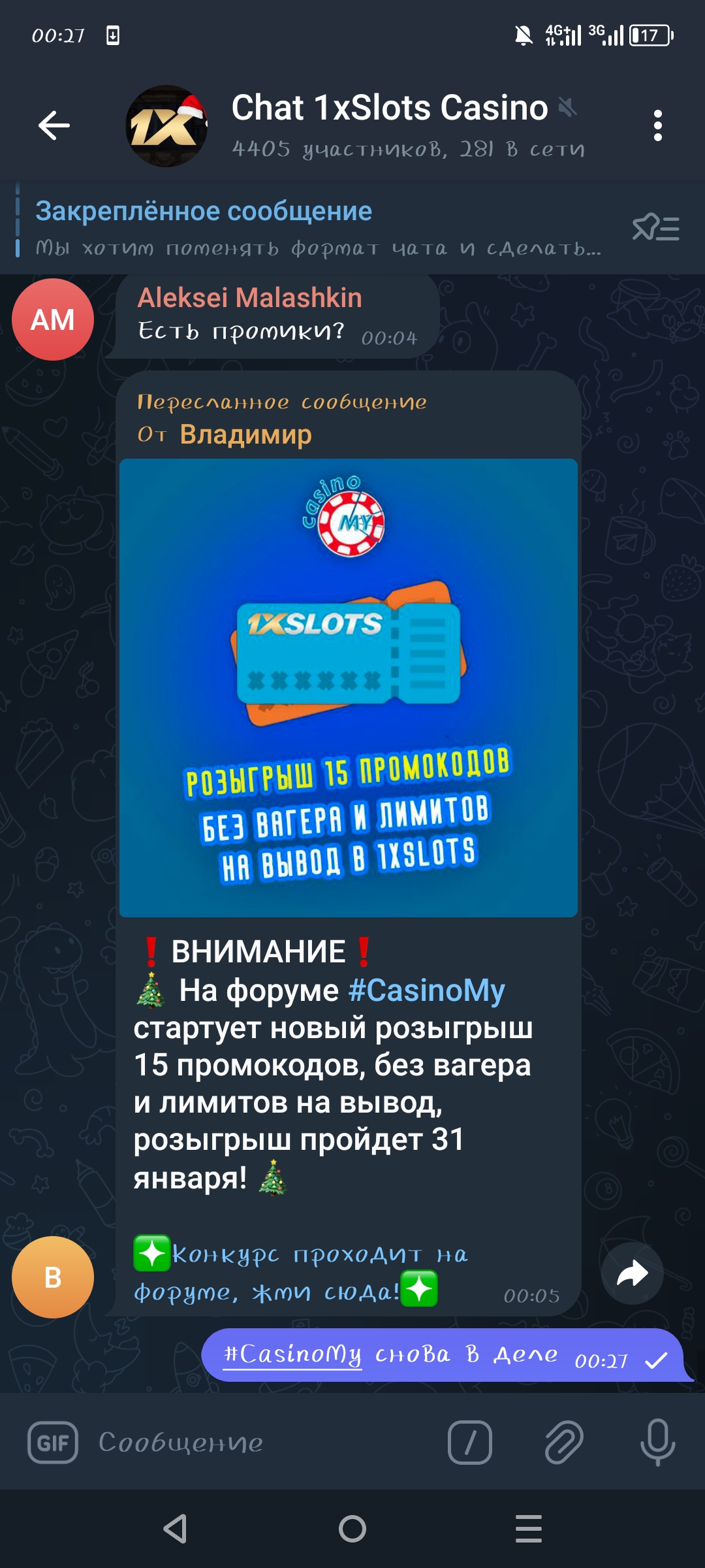 2) Быть подписанным на наш новый форум в телеграмм https://t.me/forumcasinomy и чат казино 1xSlots https://t.me/joinchat/TCG5aNJ_qCpI6SdO, в телеграмм чате 1xSlots https://t.me/joinchat/TCG5aNJ_qCpI6SdO написать любое сообщение с тегом #casinomy и разместить текст этого сообщения в этой теме вместе со скрином депозита.