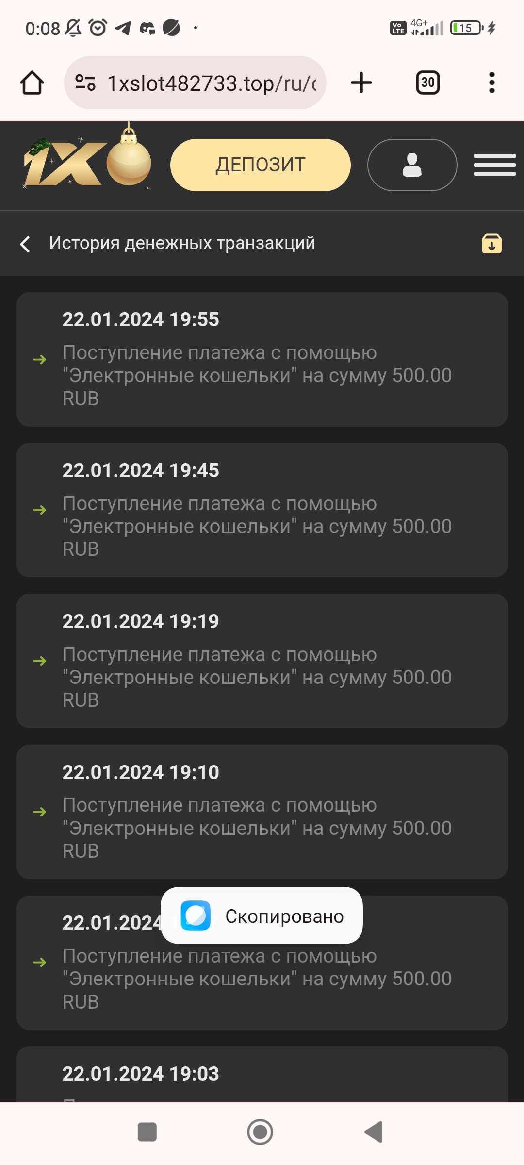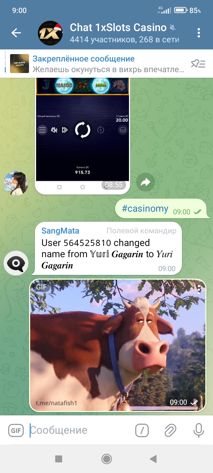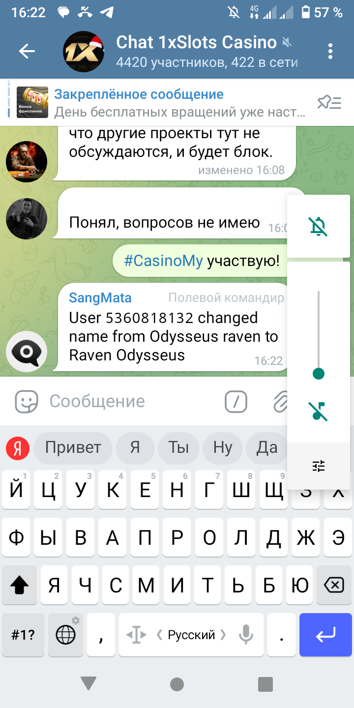2) Быть подписанным на наш новый форум в телеграмм https://t.me/forumcasinomy и чат казино 1xSlots https://t.me/joinchat/TCG5aNJ_qCpI6SdO, в телеграмм чате 1xSlots https://t.me/joinchat/TCG5aNJ_qCpI6SdO написать любое сообщение с тегом #casinomy и разместить текст этого сообщения в этой теме вместе со скрином депозита.
