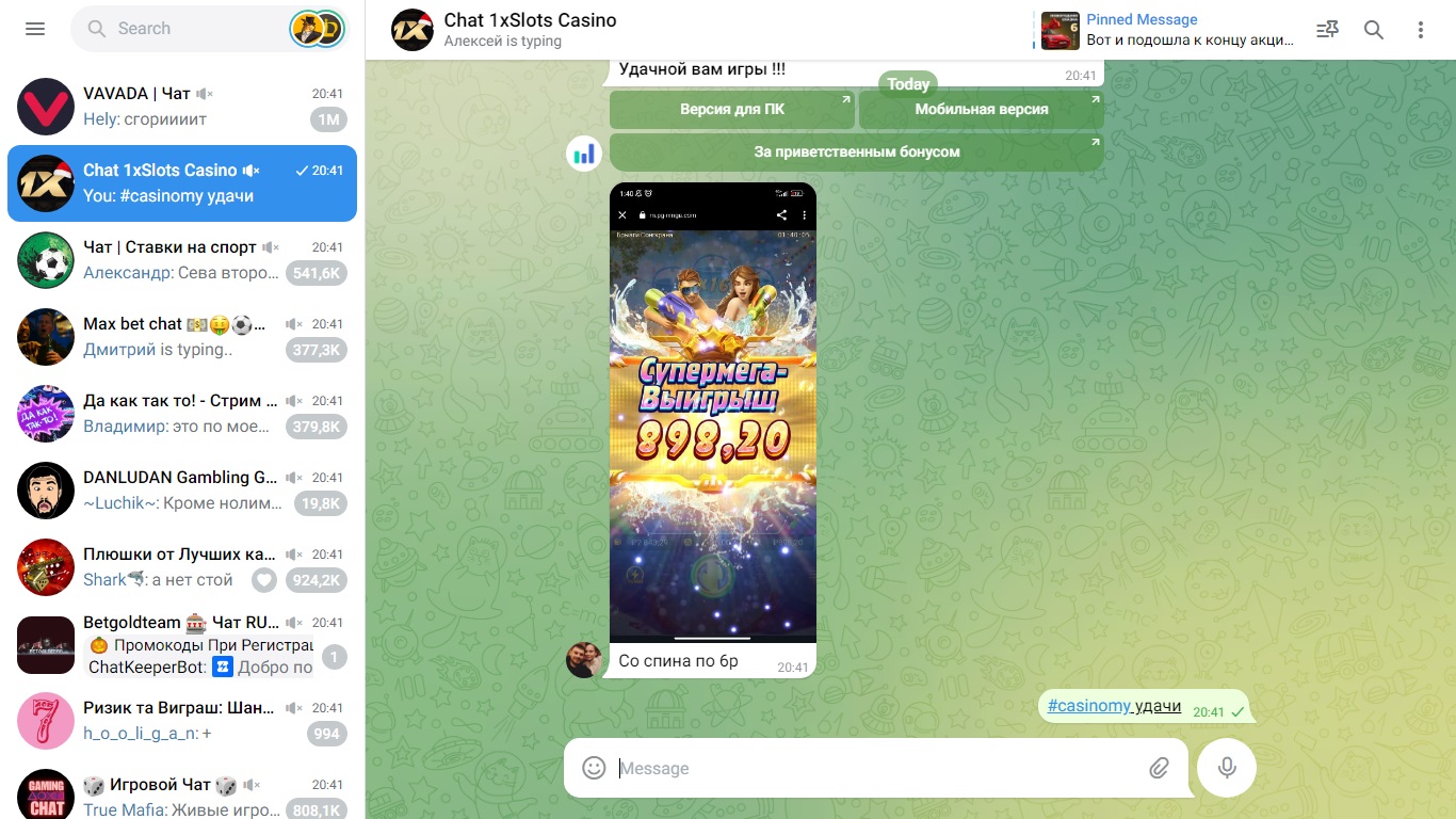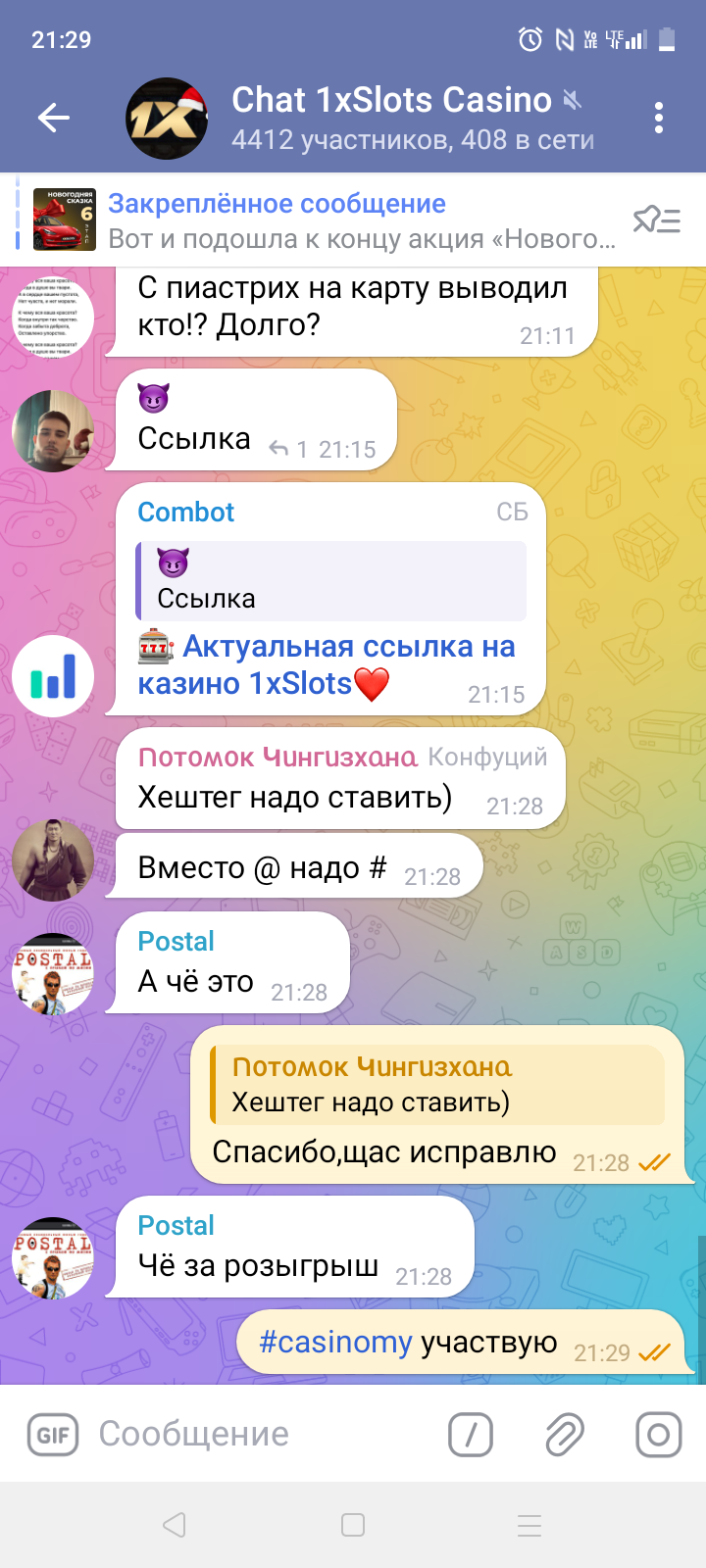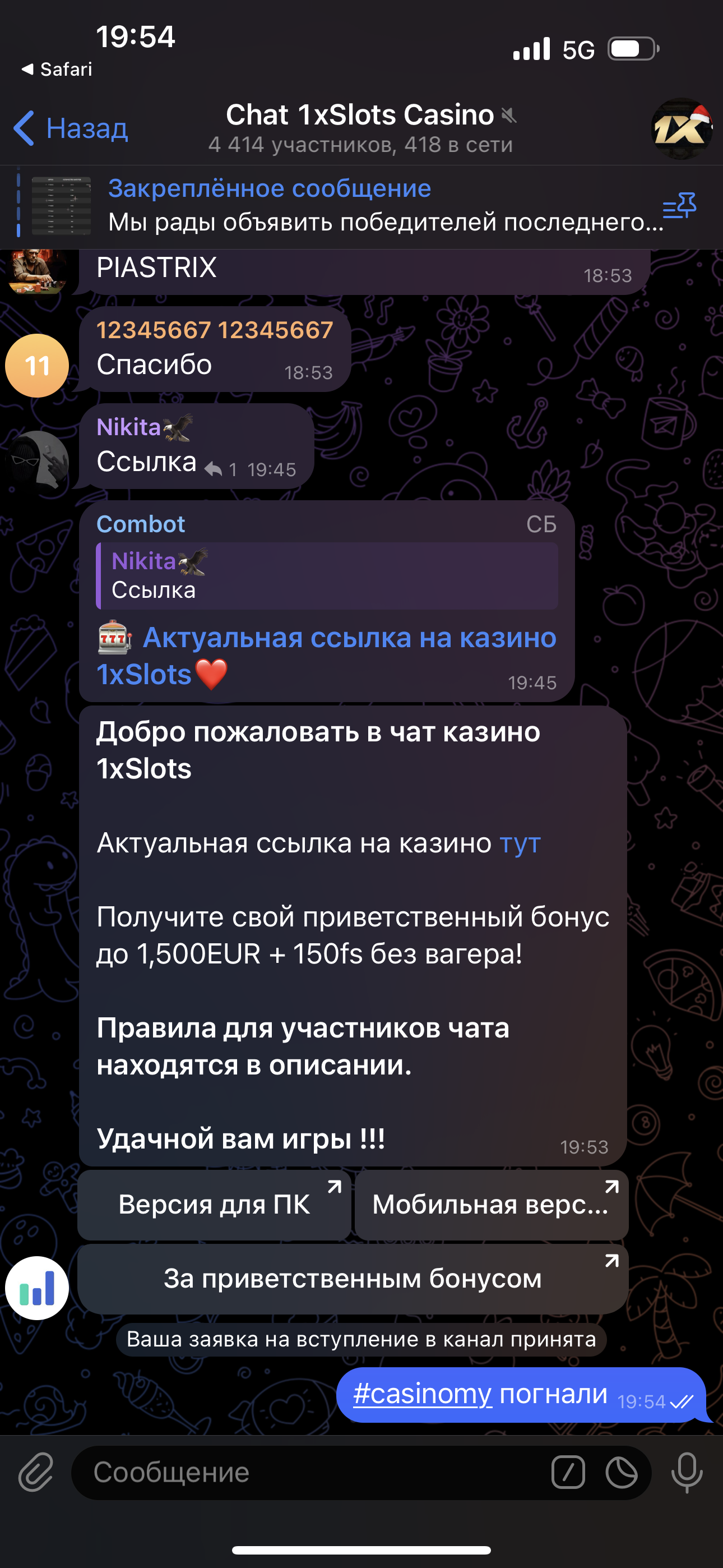 2) Быть подписанным на наш новый форум в телеграмм https://t.me/forumcasinomy и чат казино 1xSlots https://t.me/joinchat/TCG5aNJ_qCpI6SdO, в телеграмм чате 1xSlots https://t.me/joinchat/TCG5aNJ_qCpI6SdO написать любое сообщение с тегом #casinomy и разместить текст этого сообщения в этой теме вместе со скрином депозита.