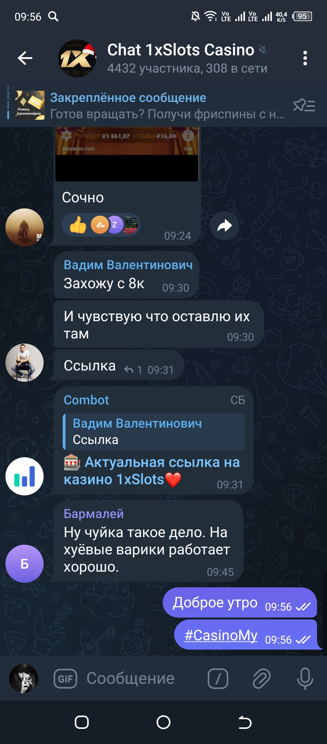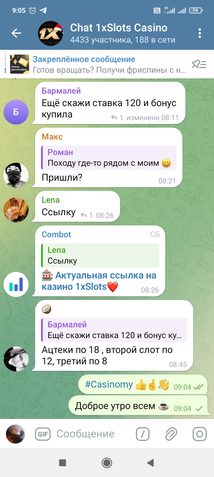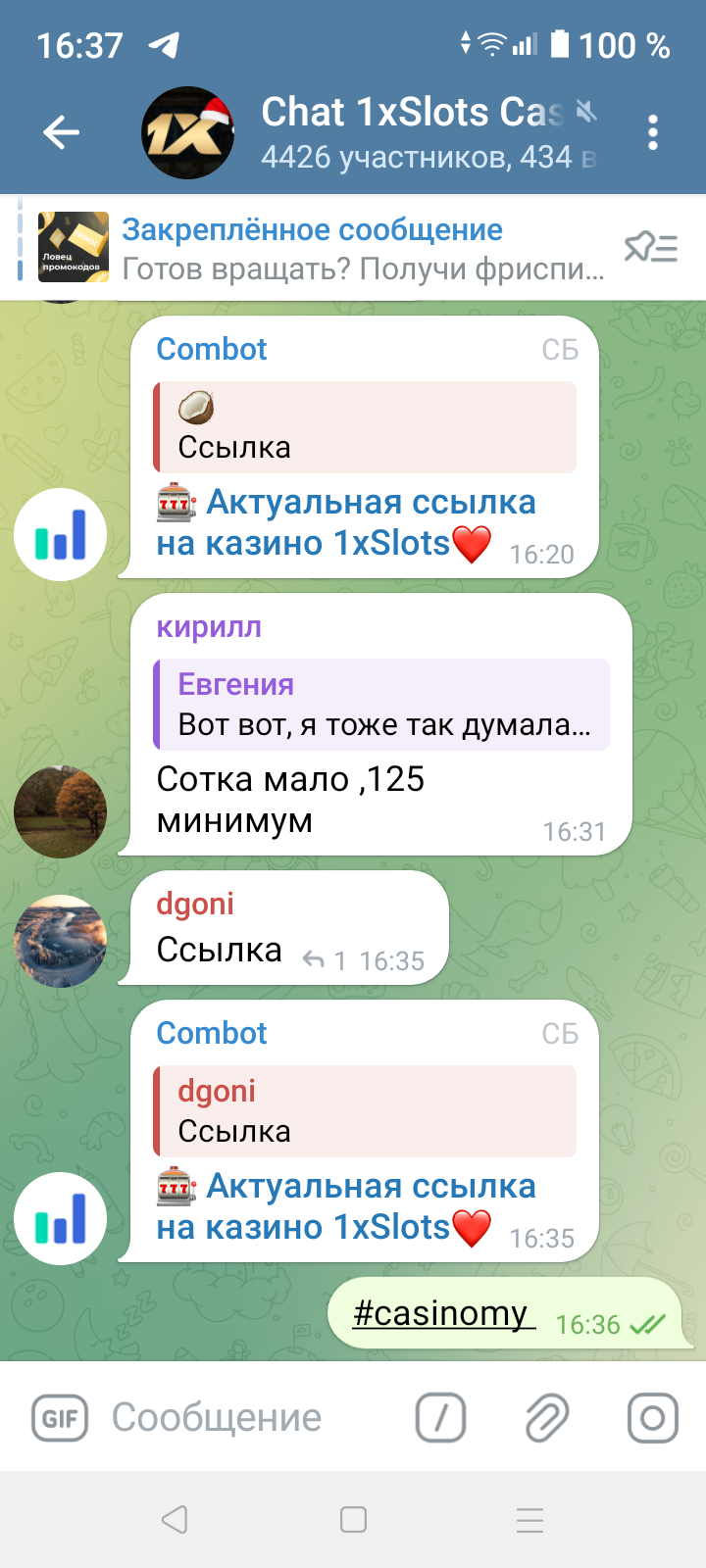 2) Быть подписанным на наш новый форум в телеграмм https://t.me/forumcasinomy и чат казино 1xSlots https://t.me/joinchat/TCG5aNJ_qCpI6SdO, в телеграмм чате 1xSlots https://t.me/joinchat/TCG5aNJ_qCpI6SdO написать любое сообщение с тегом #casinomy и разместить текст этого сообщения в этой теме вместе со скрином депозита.