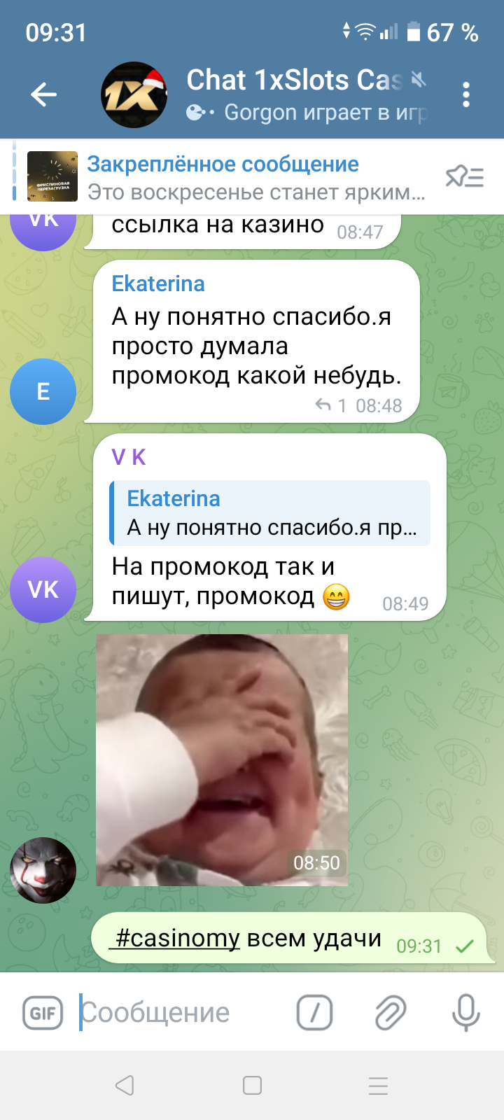 2) Быть подписанным на наш новый форум в телеграмм https://t.me/forumcasinomy и чат казино 1xSlots https://t.me/joinchat/TCG5aNJ_qCpI6SdO, в телеграмм чате 1xSlots https://t.me/joinchat/TCG5aNJ_qCpI6SdO написать любое сообщение с тегом #casinomy и разместить текст этого сообщения в этой теме вместе со скрином депозита.