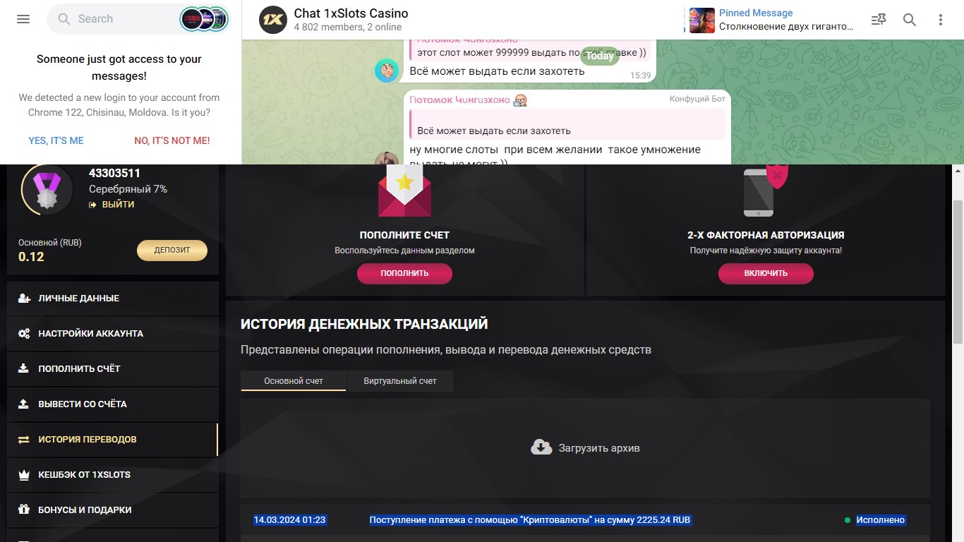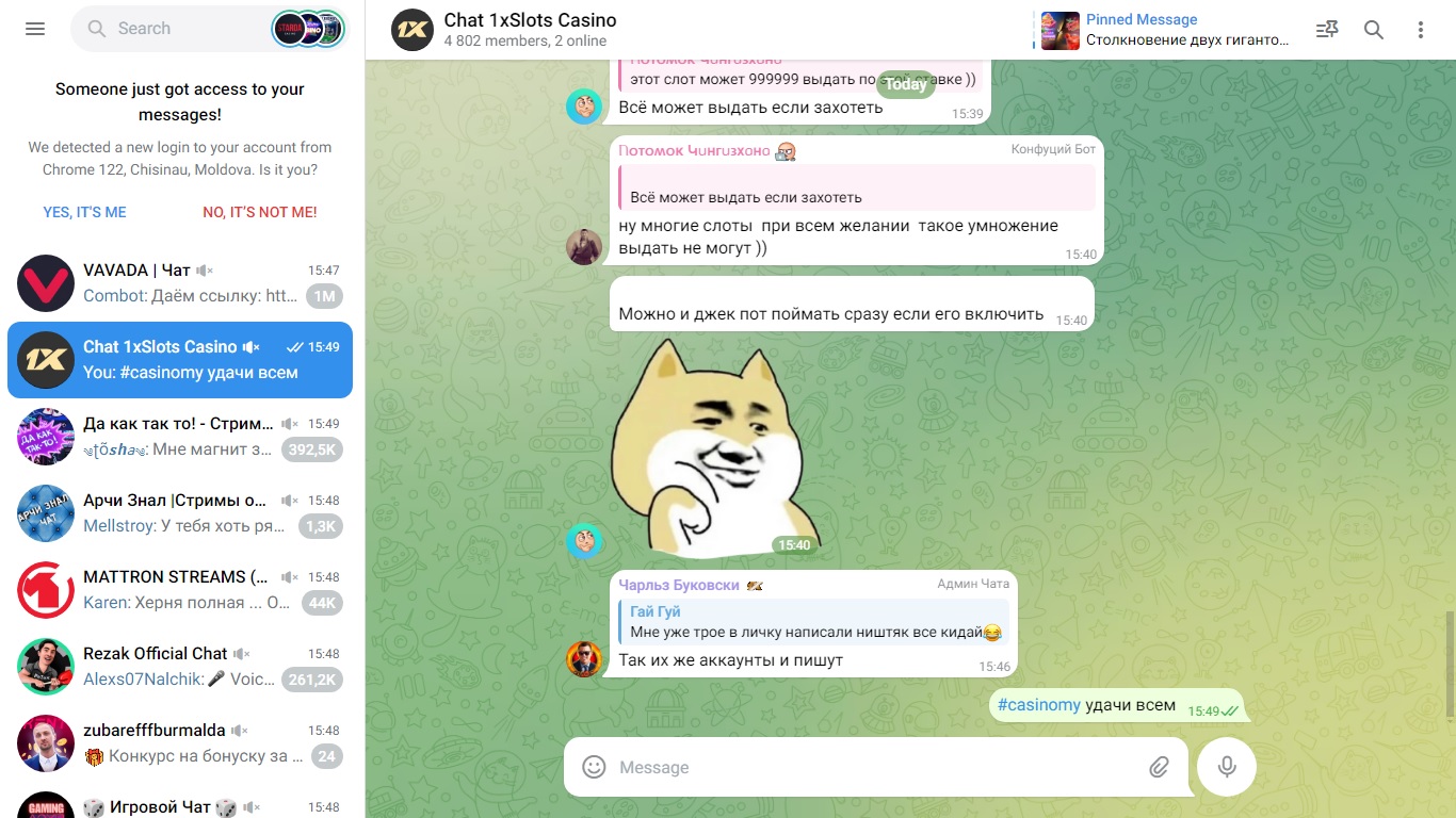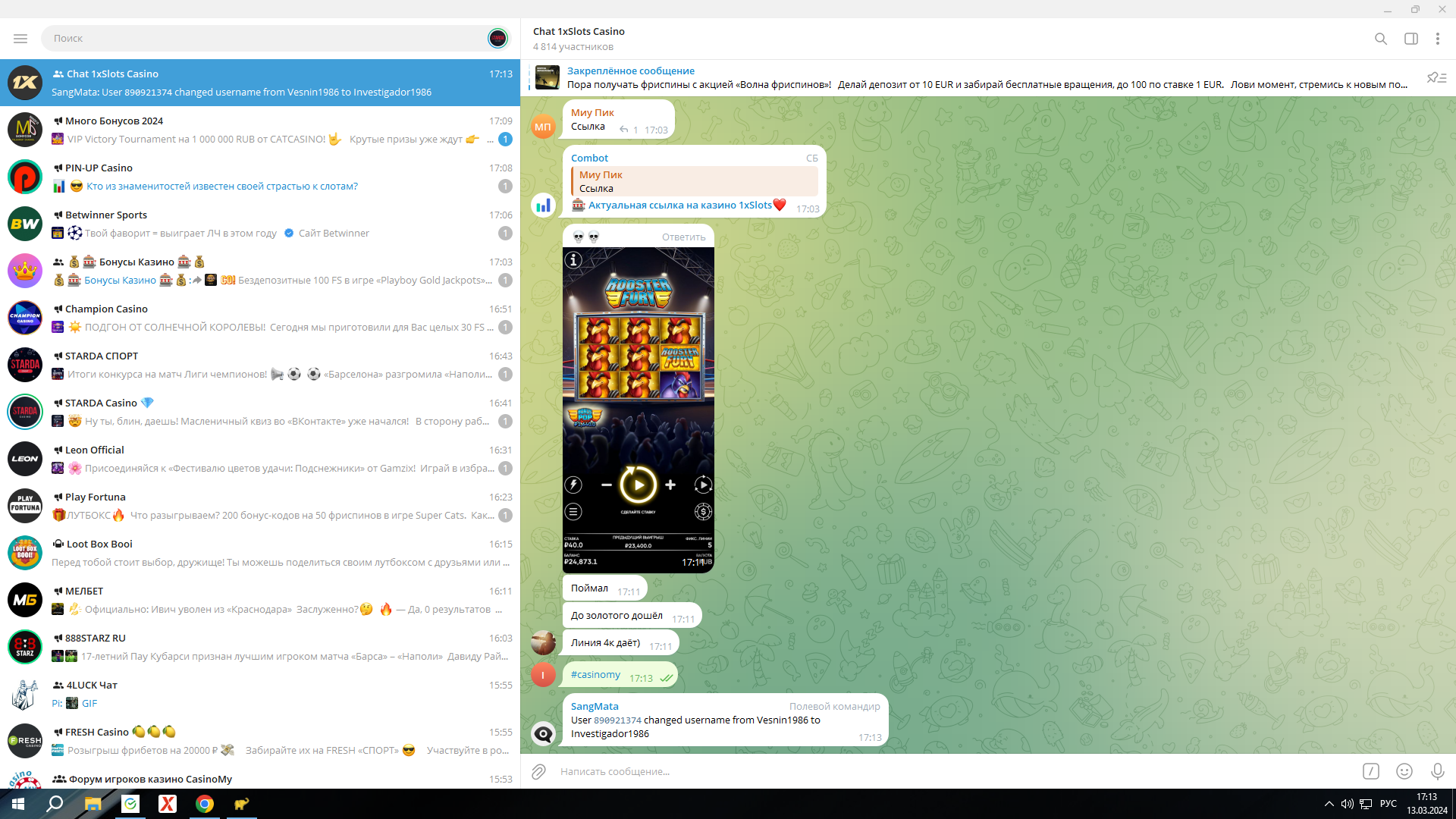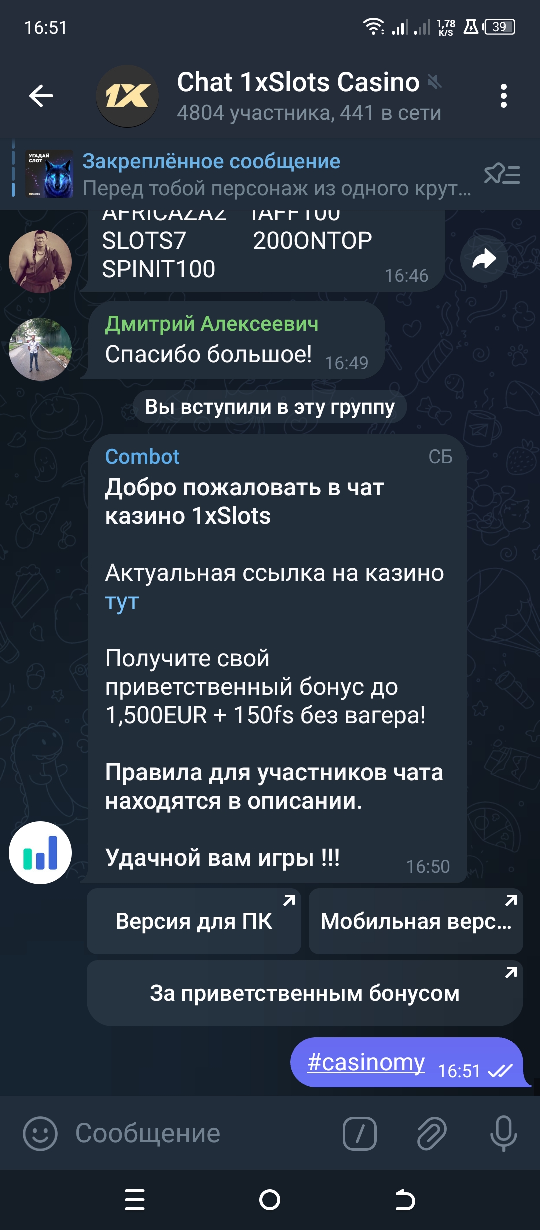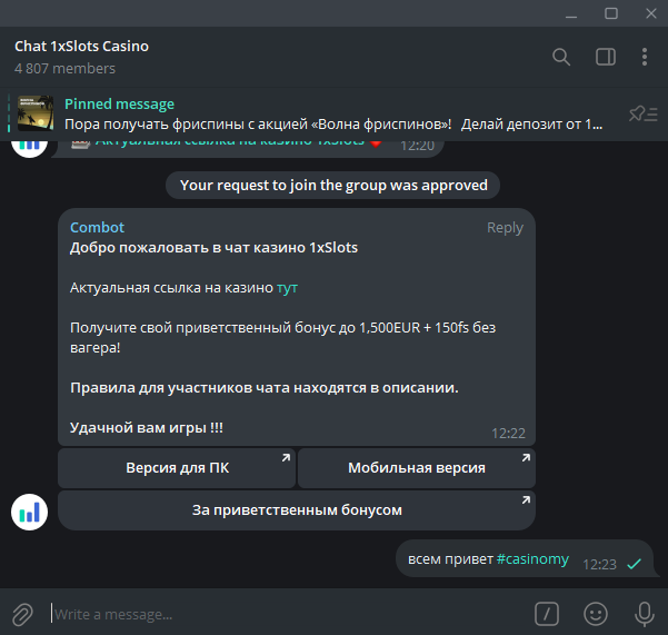 2) Быть подписанным на наш новый форум в телеграмм https://t.me/forumcasinomy и чат казино 1xSlots https://t.me/joinchat/TCG5aNJ_qCpI6SdO, в телеграмм чате 1xSlots https://t.me/joinchat/TCG5aNJ_qCpI6SdO написать любое сообщение с тегом #casinomy и разместить текст этого сообщения в этой теме вместе со скрином депозита.