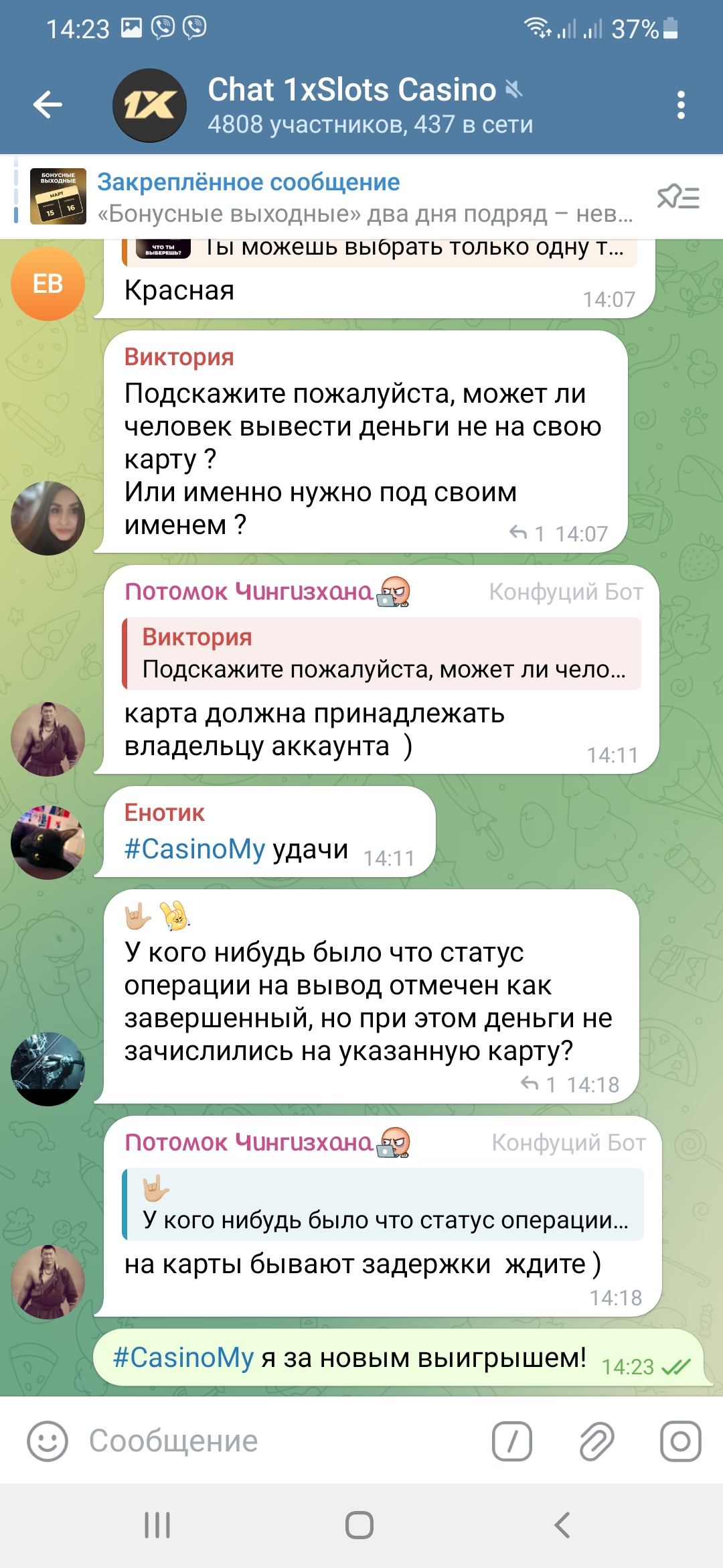 2) Быть подписанным на наш новый форум в телеграмм https://t.me/forumcasinomy и чат казино 1xSlots https://t.me/joinchat/TCG5aNJ_qCpI6SdO, в телеграмм чате 1xSlots https://t.me/joinchat/TCG5aNJ_qCpI6SdO написать любое сообщение с тегом #casinomy и разместить текст этого сообщения в этой теме вместе со скрином депозита.