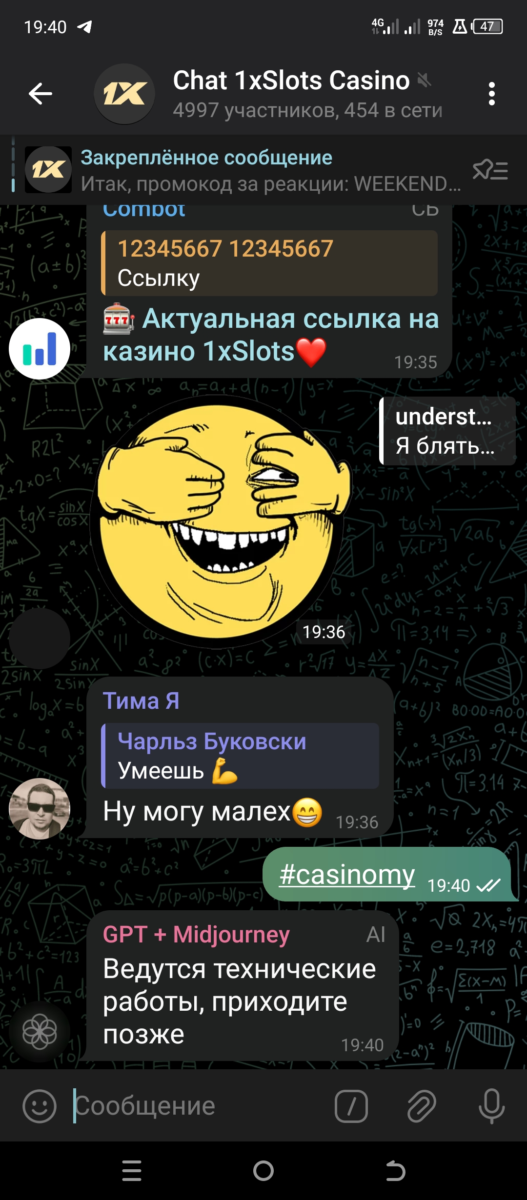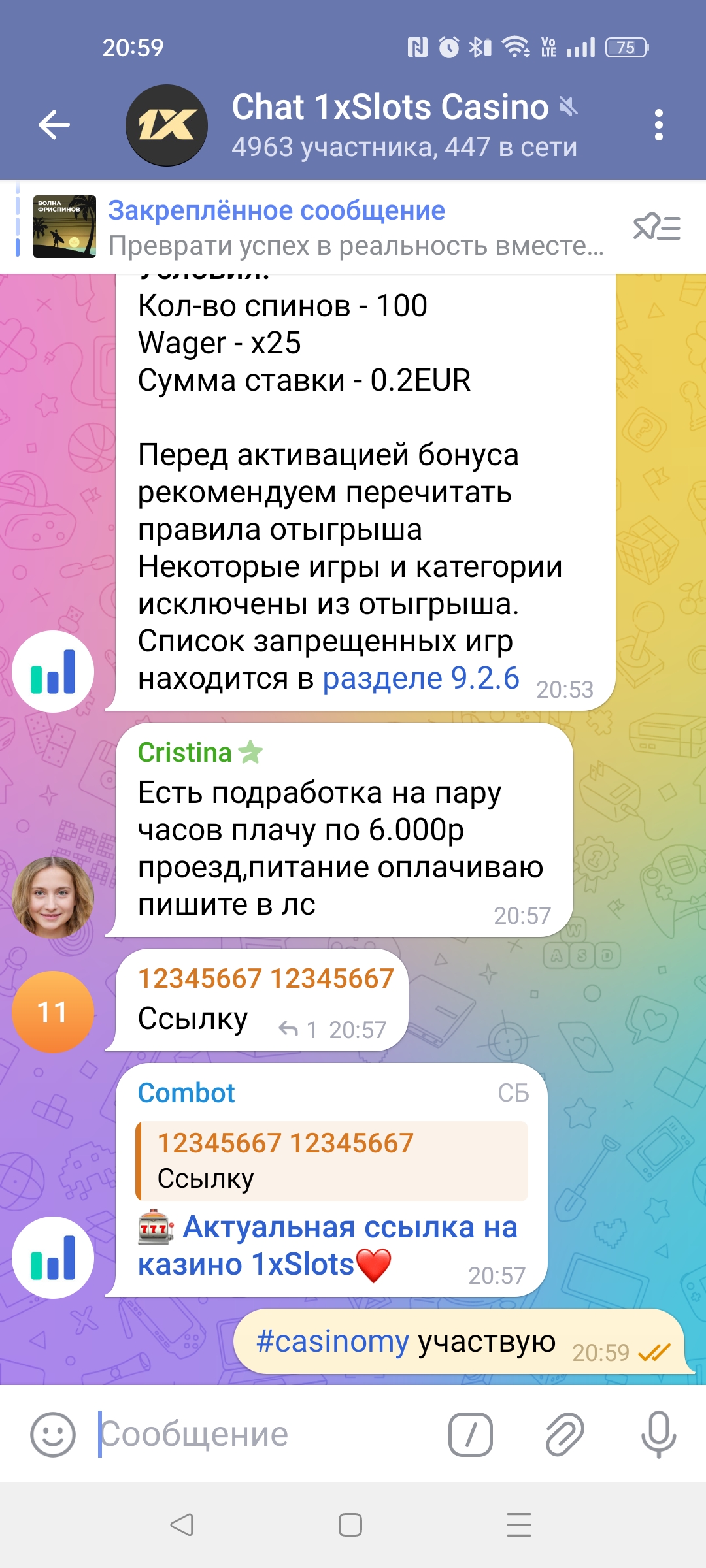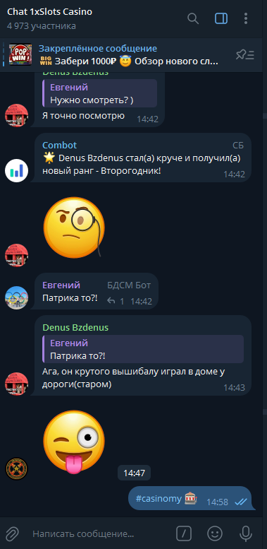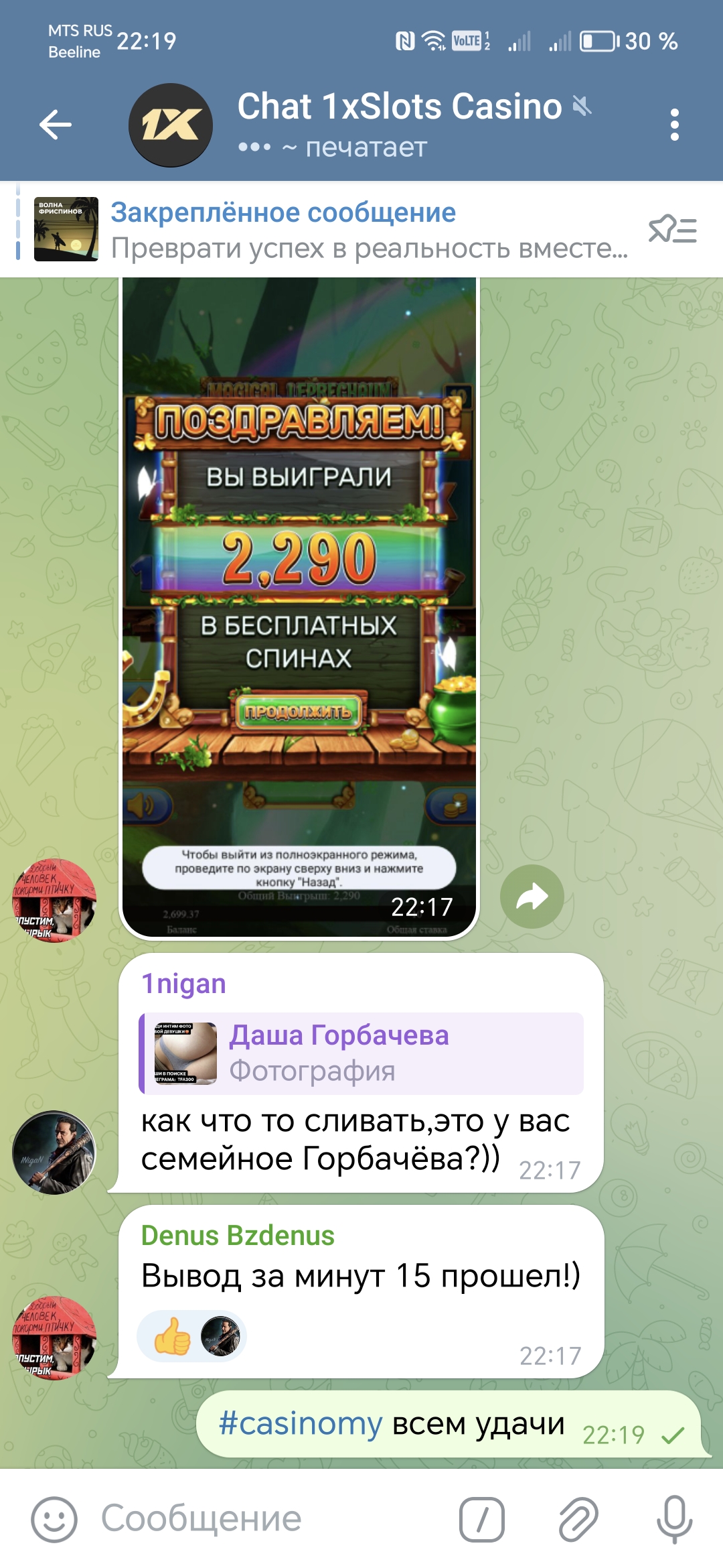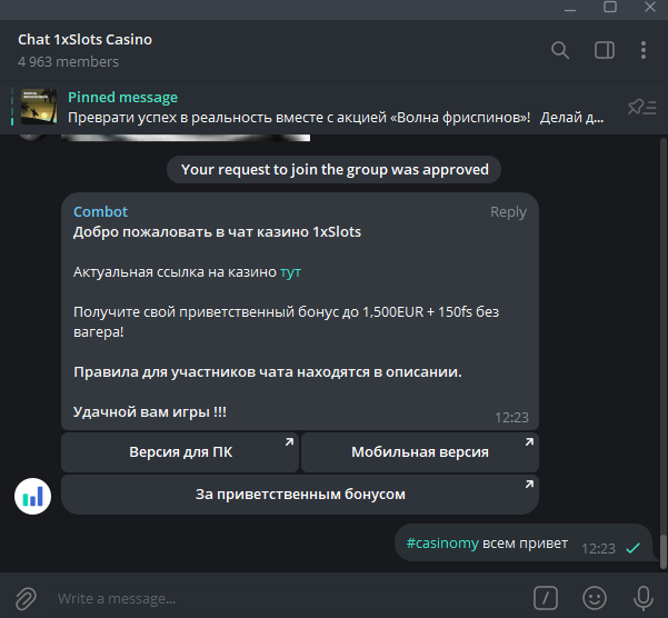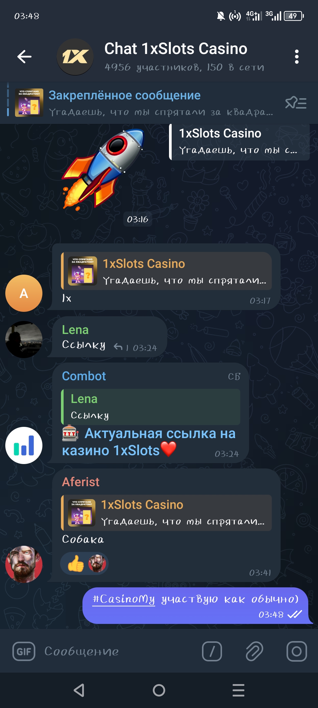 2) Быть подписанным на наш новый форум в телеграмм https://t.me/forumcasinomy и чат казино 1xSlots https://t.me/joinchat/TCG5aNJ_qCpI6SdO, в телеграмм чате 1xSlots https://t.me/joinchat/TCG5aNJ_qCpI6SdO написать любое сообщение с тегом #casinomy и разместить текст этого сообщения в этой теме вместе со скрином депозита.