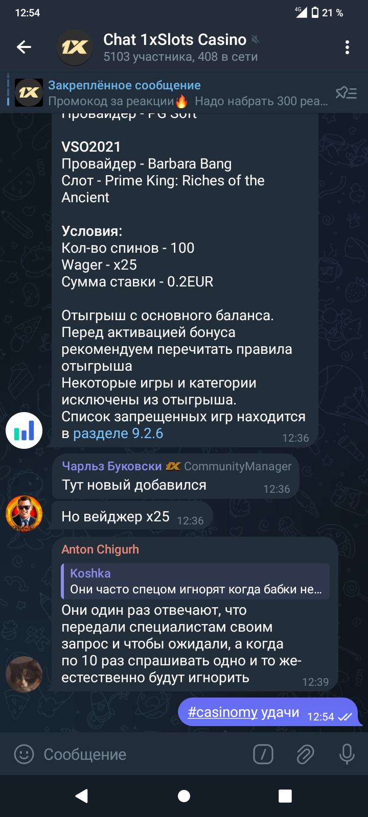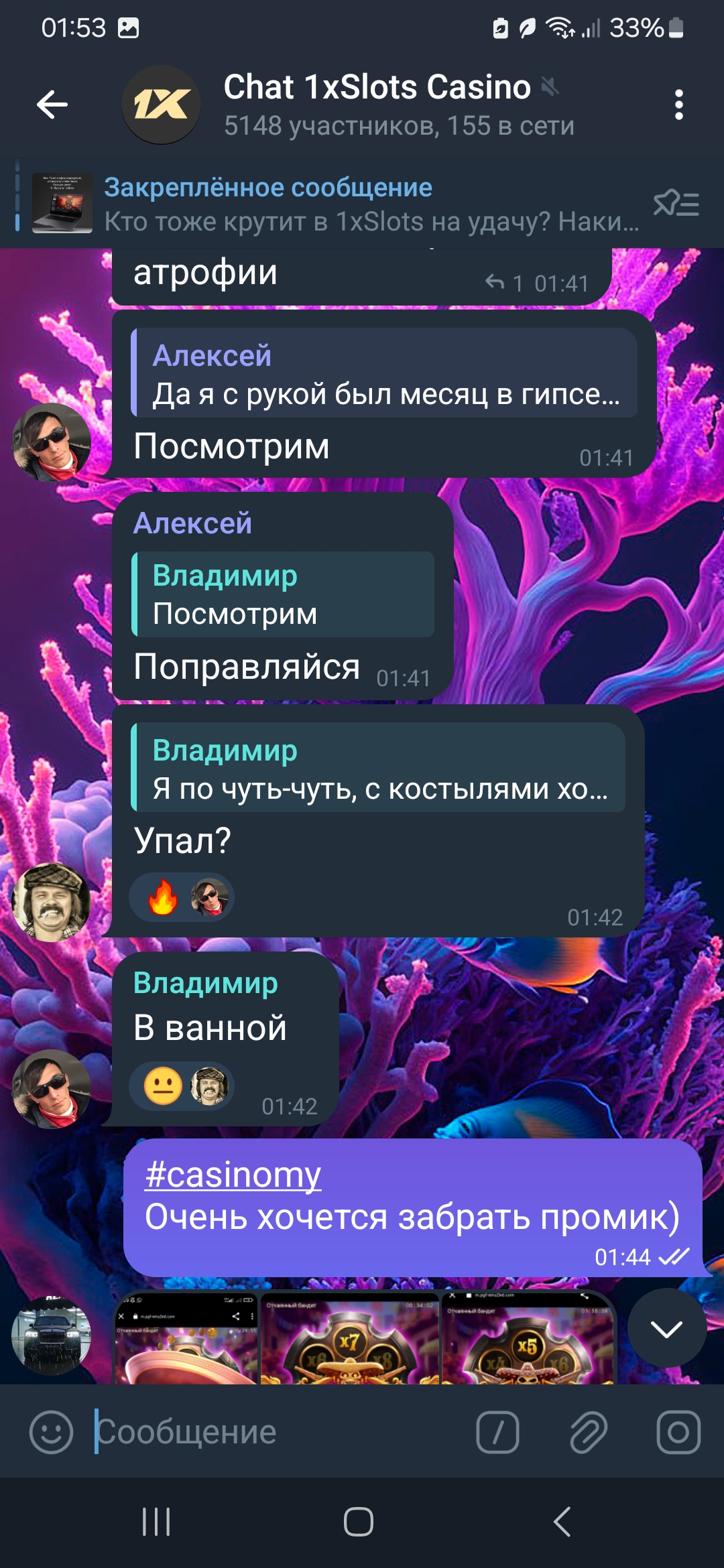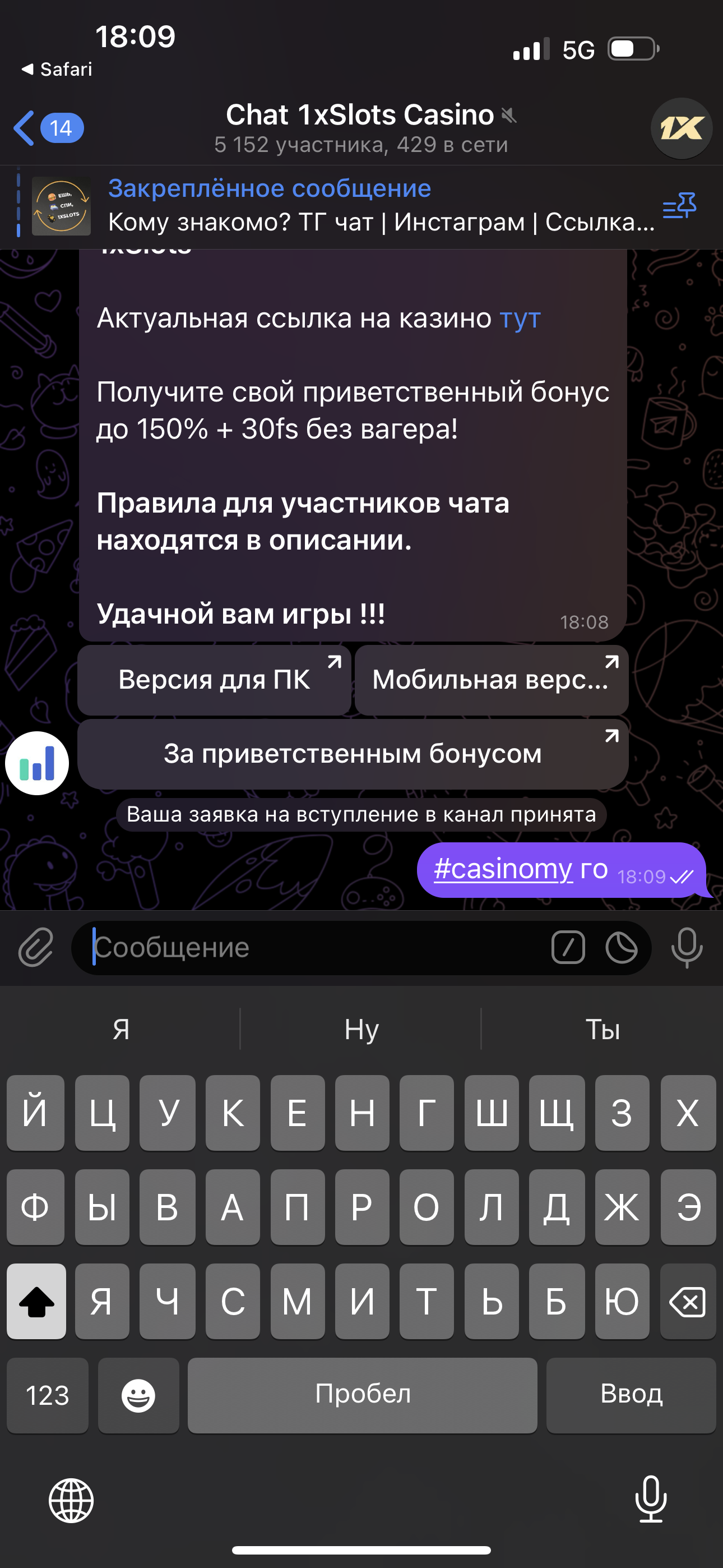 2) Быть подписанным на наш новый форум в телеграмм https://t.me/forumcasinomy и чат казино 1xSlots https://t.me/joinchat/TCG5aNJ_qCpI6SdO, в телеграмм чате 1xSlots https://t.me/joinchat/TCG5aNJ_qCpI6SdO написать любое сообщение с тегом #casinomy и разместить текст этого сообщения в этой теме вместе со скрином депозита.