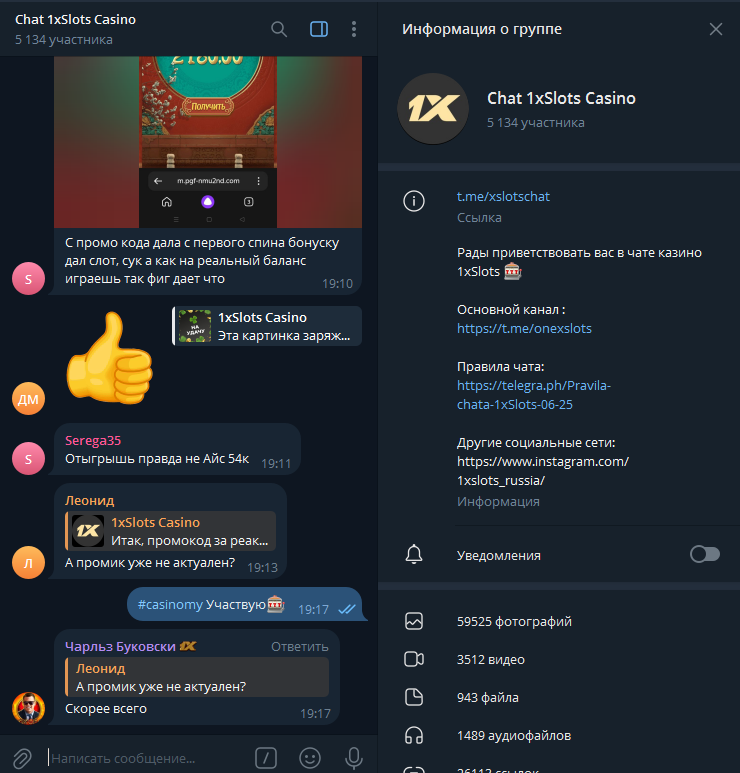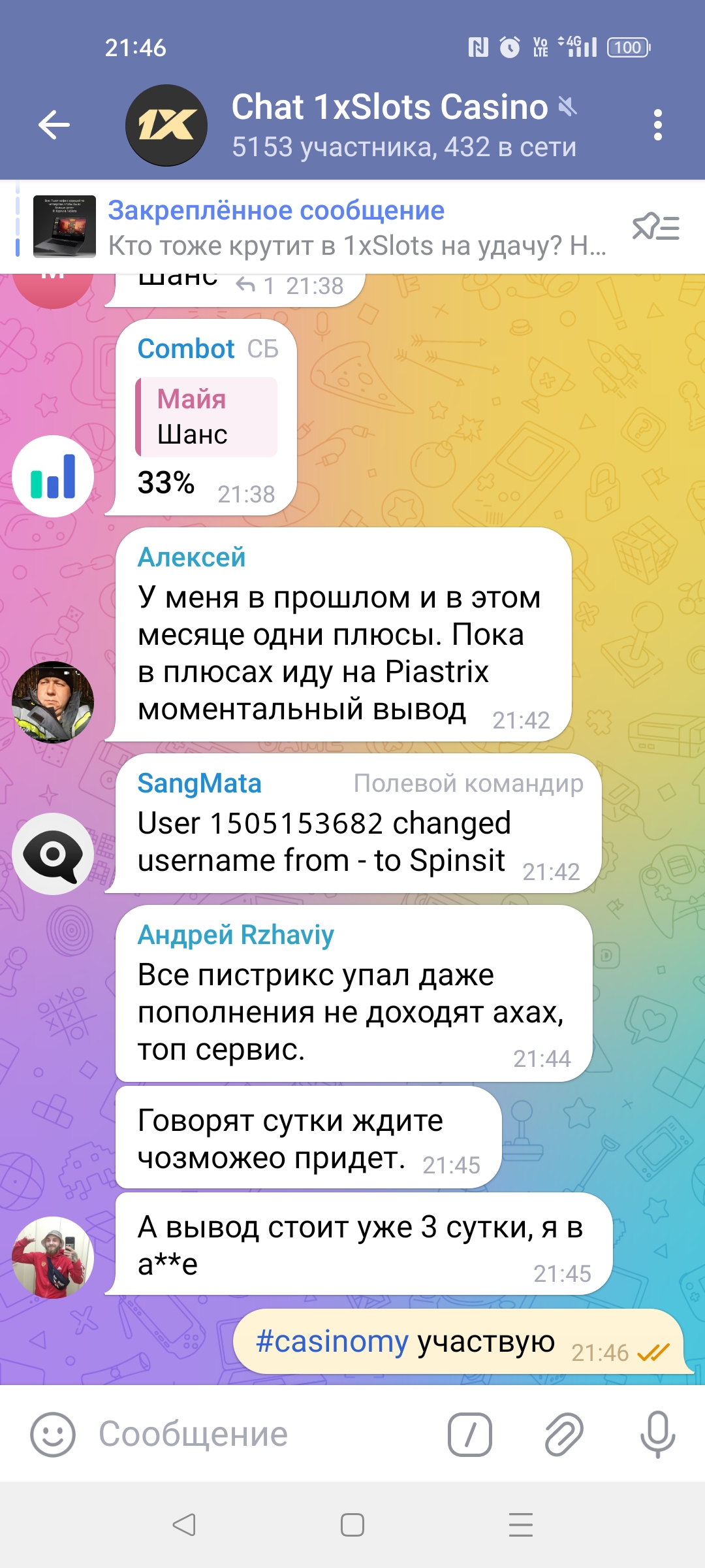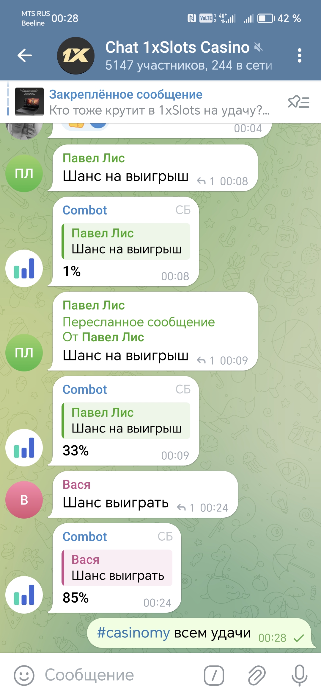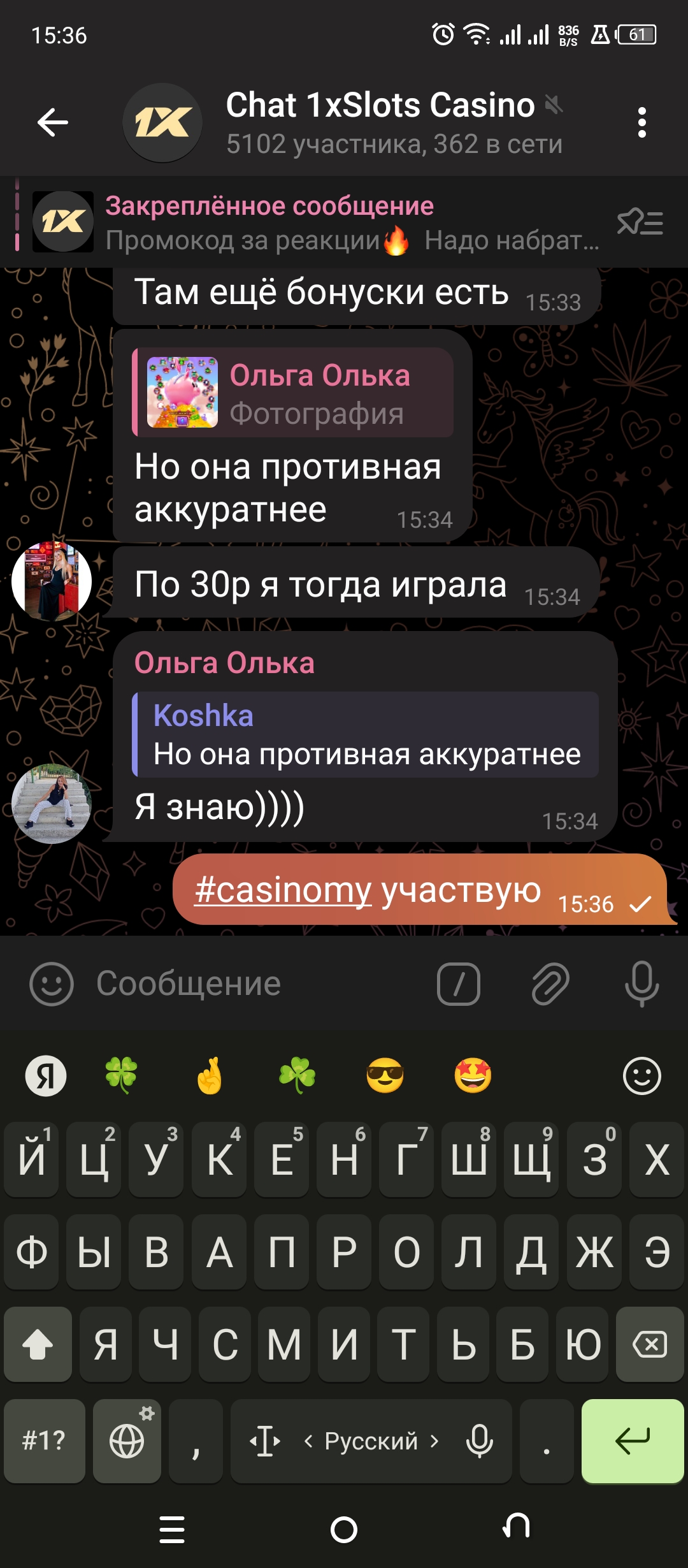 2) Быть подписанным на наш новый форум в телеграмм https://t.me/forumcasinomy и чат казино 1xSlots https://t.me/joinchat/TCG5aNJ_qCpI6SdO, в телеграмм чате 1xSlots https://t.me/joinchat/TCG5aNJ_qCpI6SdO написать любое сообщение с тегом #casinomy и разместить текст этого сообщения в этой теме вместе со скрином депозита.