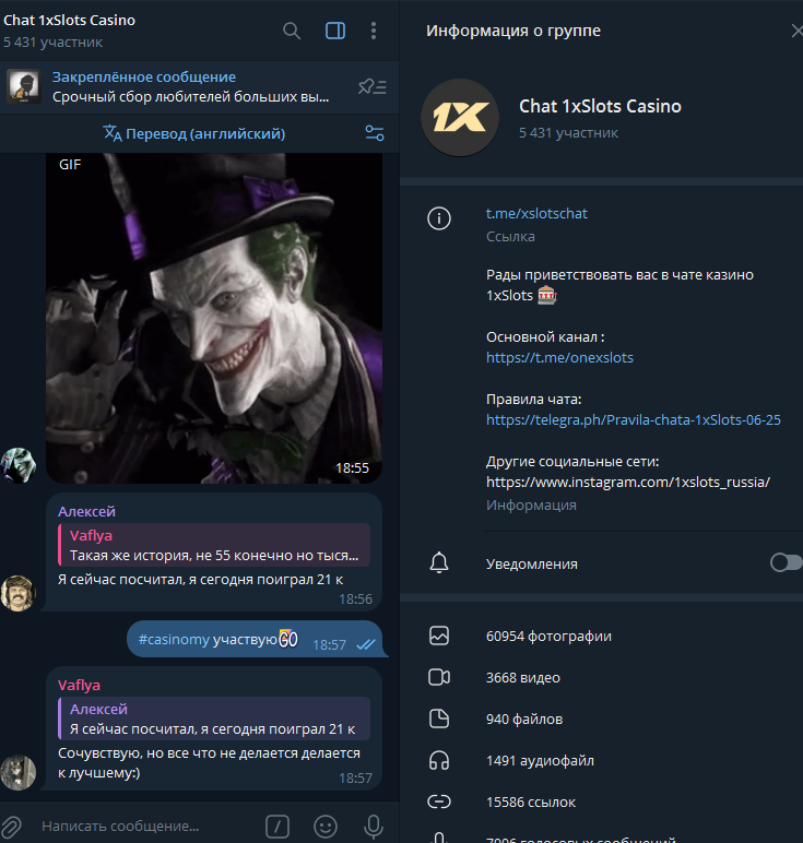 2) Быть подписанным на наш новый форум в телеграмм https://t.me/forumcasinomy и чат казино 1xSlots https://t.me/joinchat/TCG5aNJ_qCpI6SdO, в телеграмм чате 1xSlots https://t.me/joinchat/TCG5aNJ_qCpI6SdO написать любое сообщение с тегом #casinomy и разместить текст этого сообщения в этой теме вместе со скрином депозита.