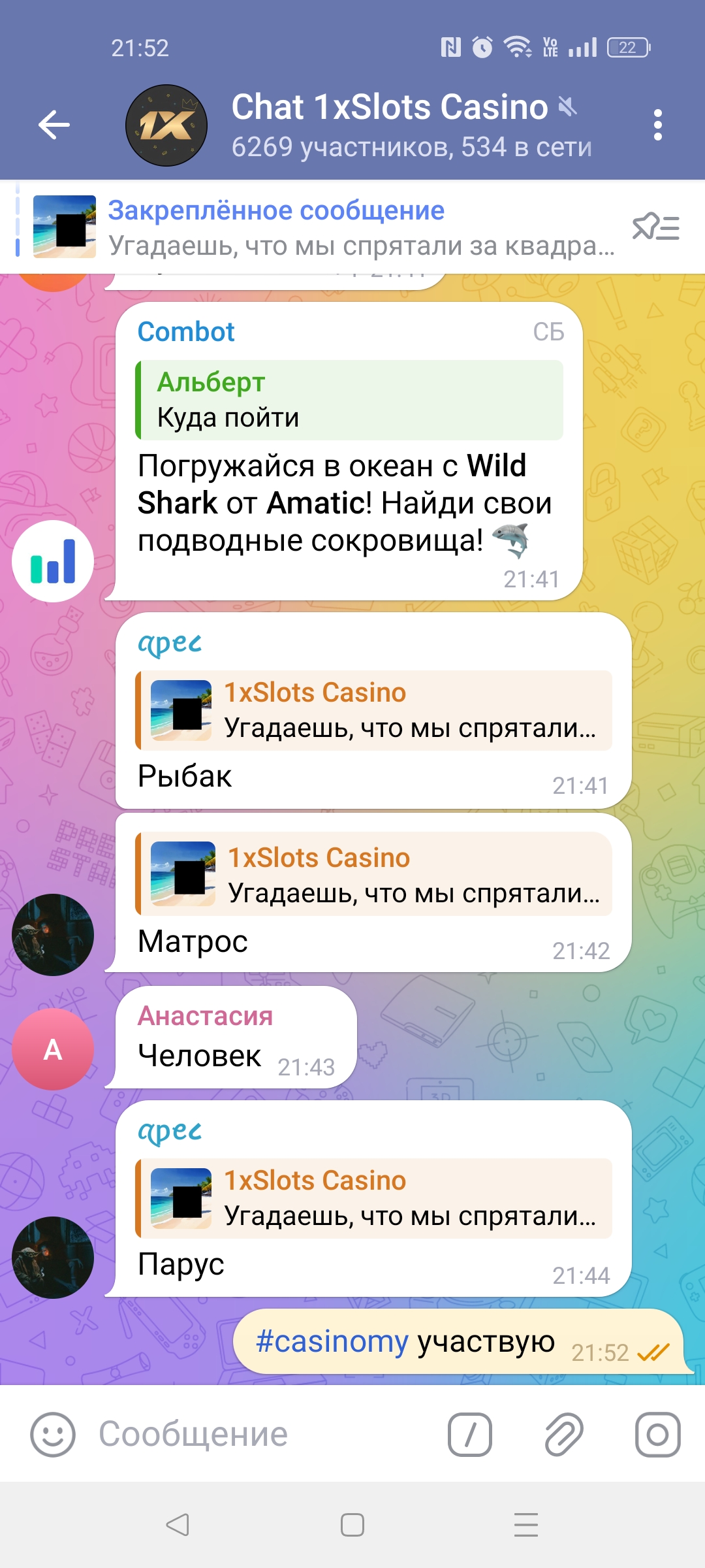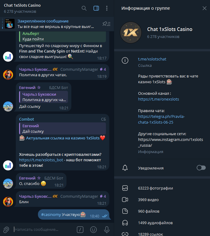 2) Быть подписанным на наш новый форум в телеграмм https://t.me/forumcasinomy, чат https://t.me/casinomyforum и чат казино 1xSlots https://t.me/joinchat/TCG5aNJ_qCpI6SdO, в телеграмм чате 1xSlots https://t.me/joinchat/TCG5aNJ_qCpI6SdO написать любое сообщение с тегом #casinomy и разместить текст этого сообщения в этой теме вместе со скрином депозита.