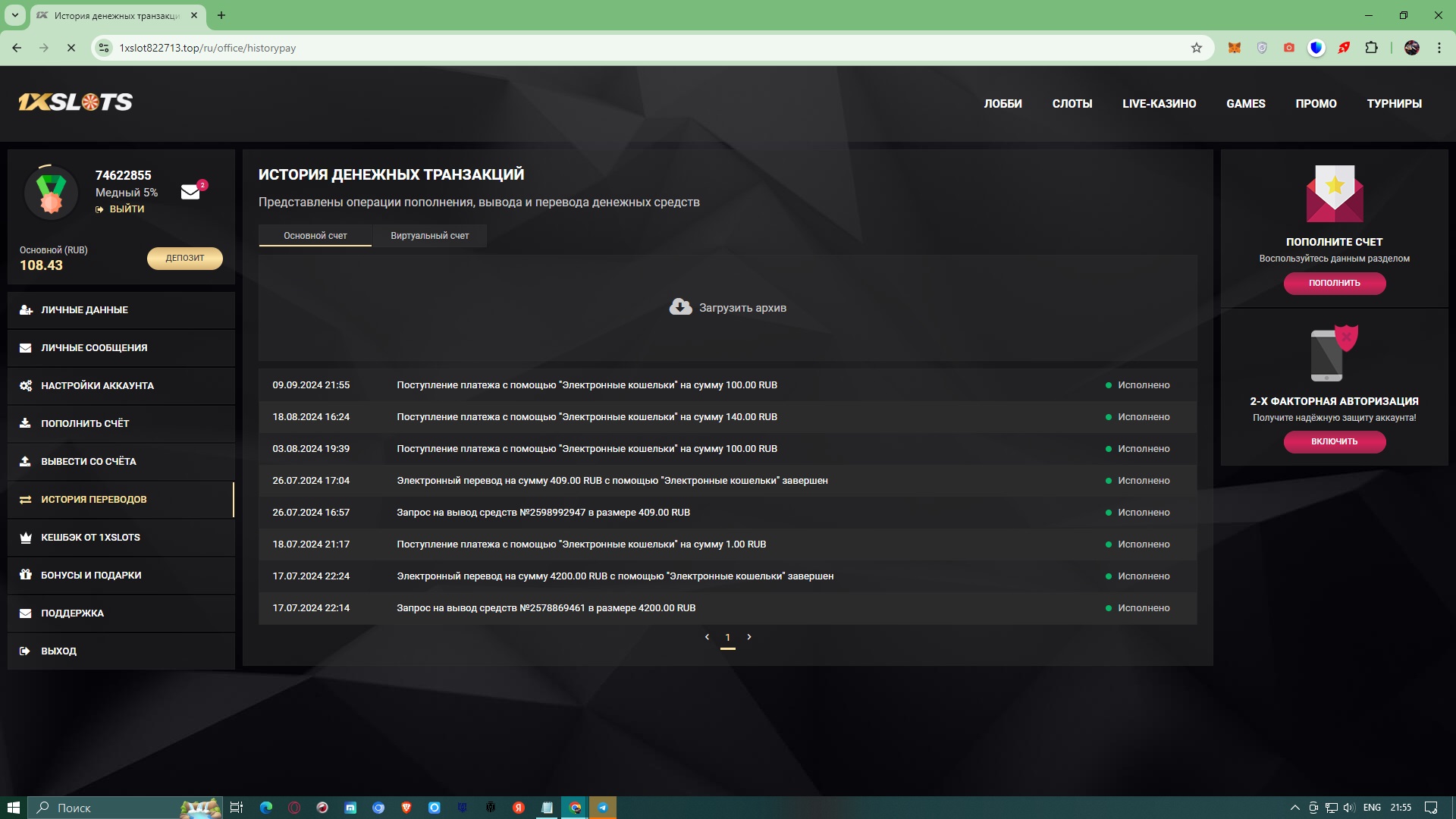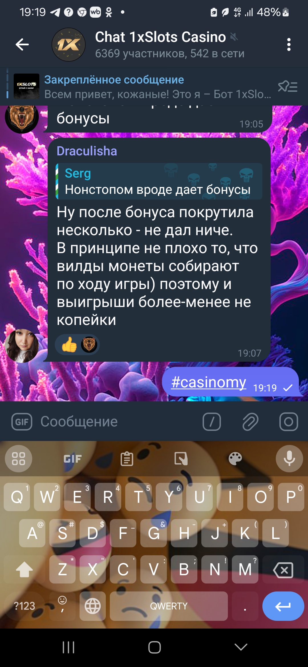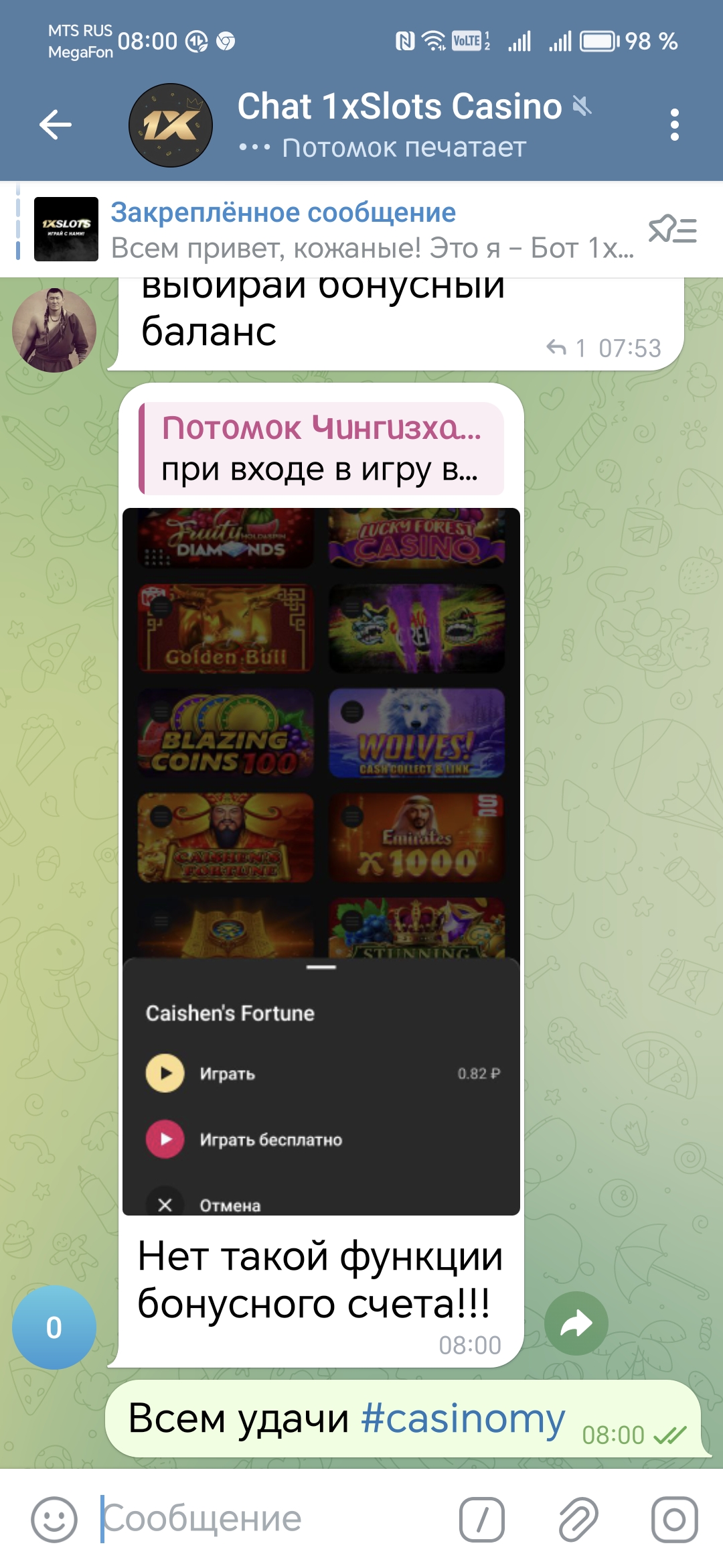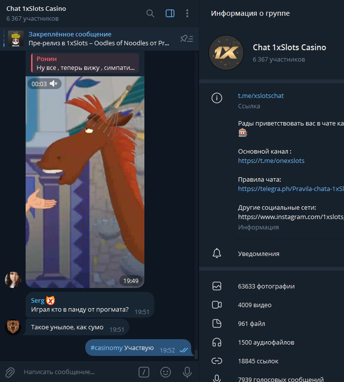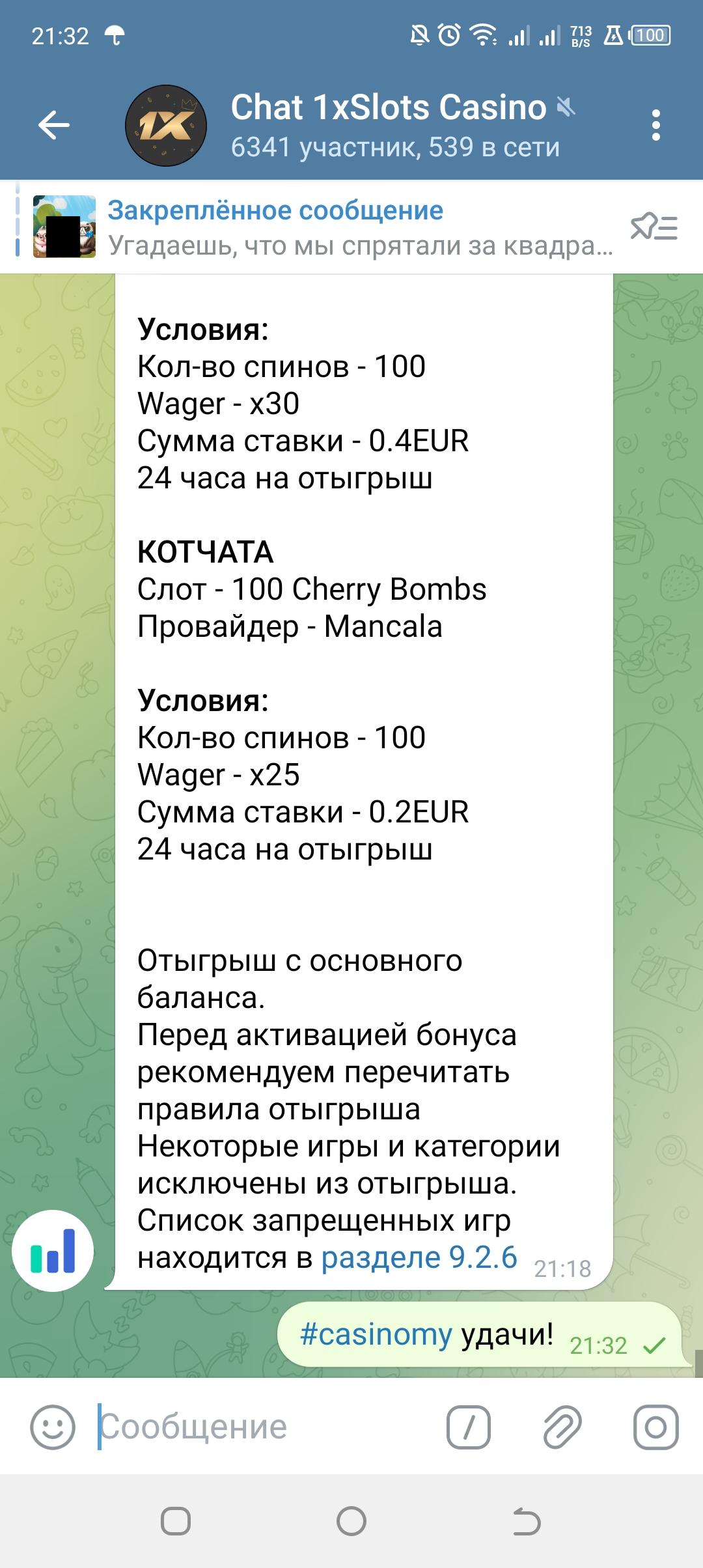 2) Быть подписанным на наш новый форум в телеграмм https://t.me/forumcasinomy, чат https://t.me/casinomyforum и чат казино 1xSlots https://t.me/joinchat/TCG5aNJ_qCpI6SdO, в телеграмм чате 1xSlots https://t.me/joinchat/TCG5aNJ_qCpI6SdO написать любое сообщение с тегом #casinomy и разместить текст этого сообщения в этой теме вместе со скрином депозита.