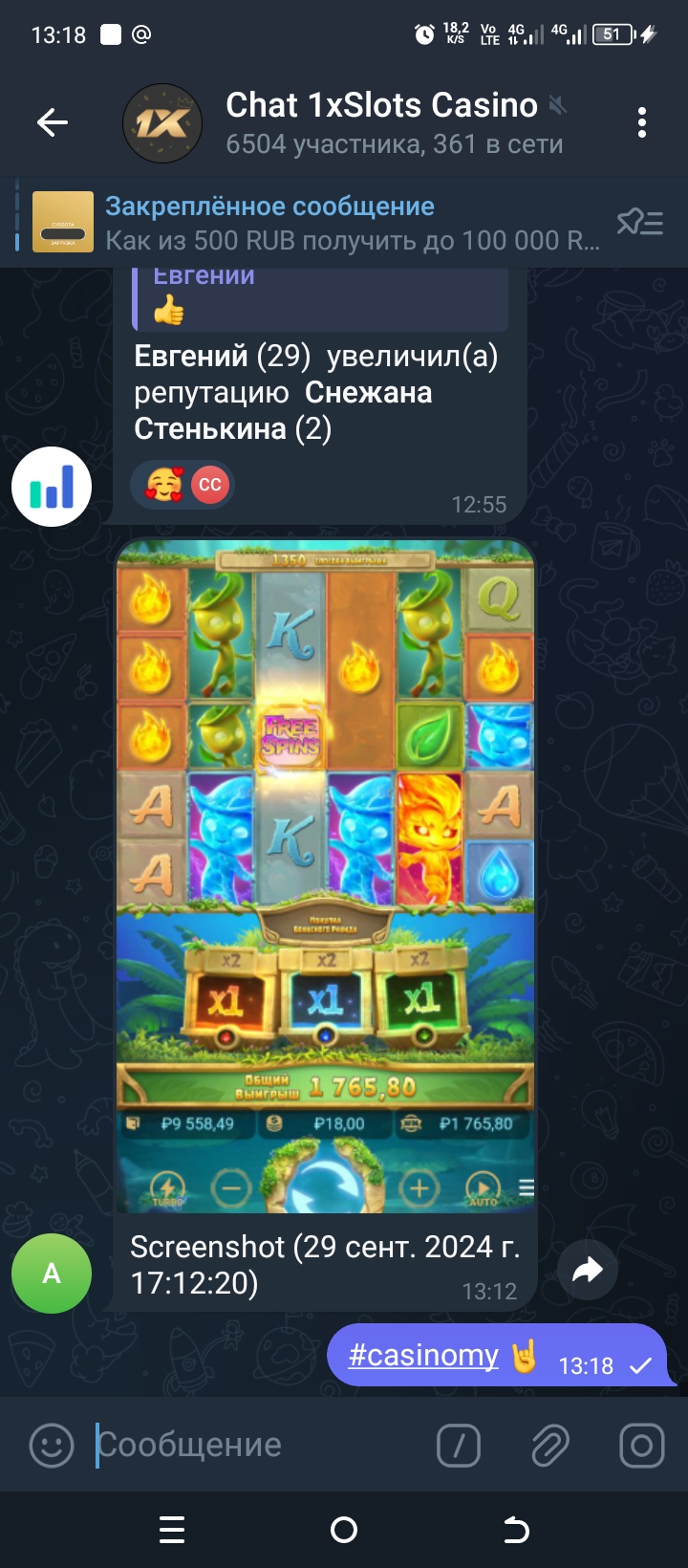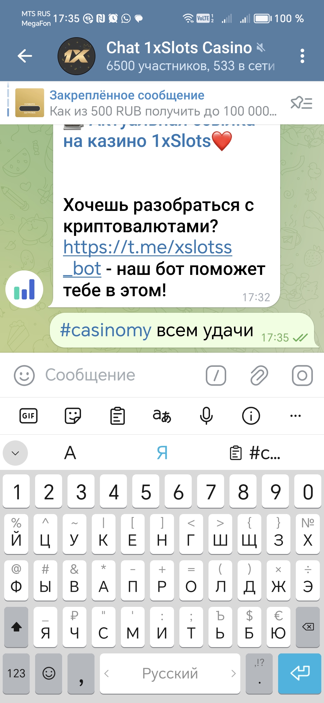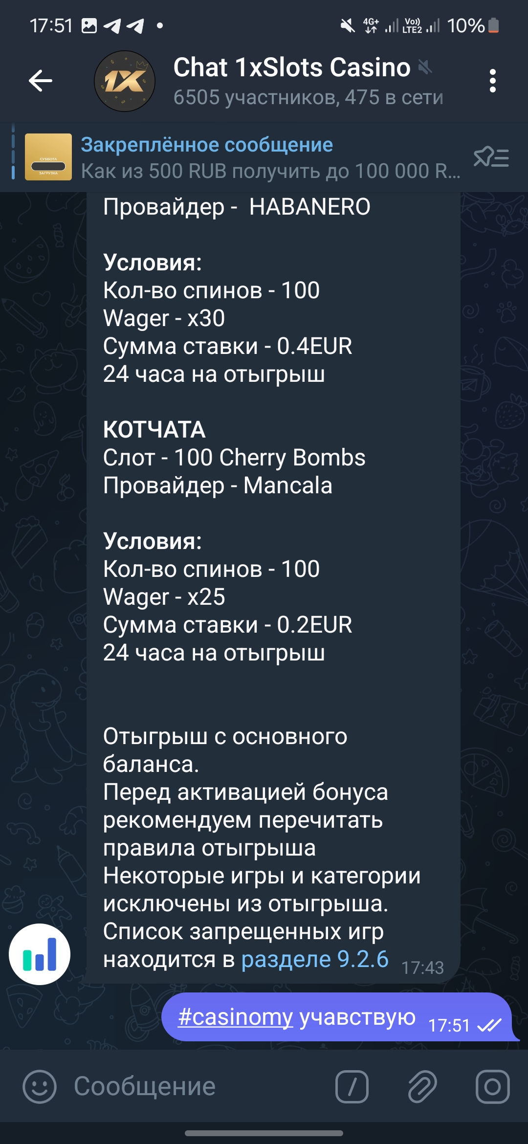 2) Быть подписанным на наш новый форум в телеграмм https://t.me/forumcasinomy, чат https://t.me/casinomyforum и чат казино 1xSlots https://t.me/joinchat/TCG5aNJ_qCpI6SdO, в телеграмм чате 1xSlots https://t.me/joinchat/TCG5aNJ_qCpI6SdO написать любое сообщение с тегом #casinomy и разместить текст этого сообщения в этой теме вместе со скрином депозита.