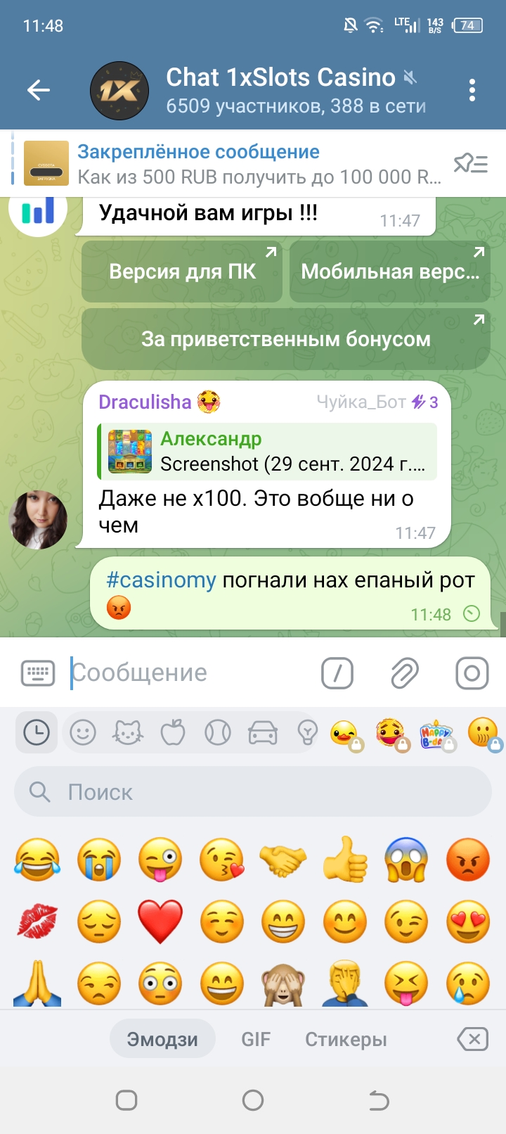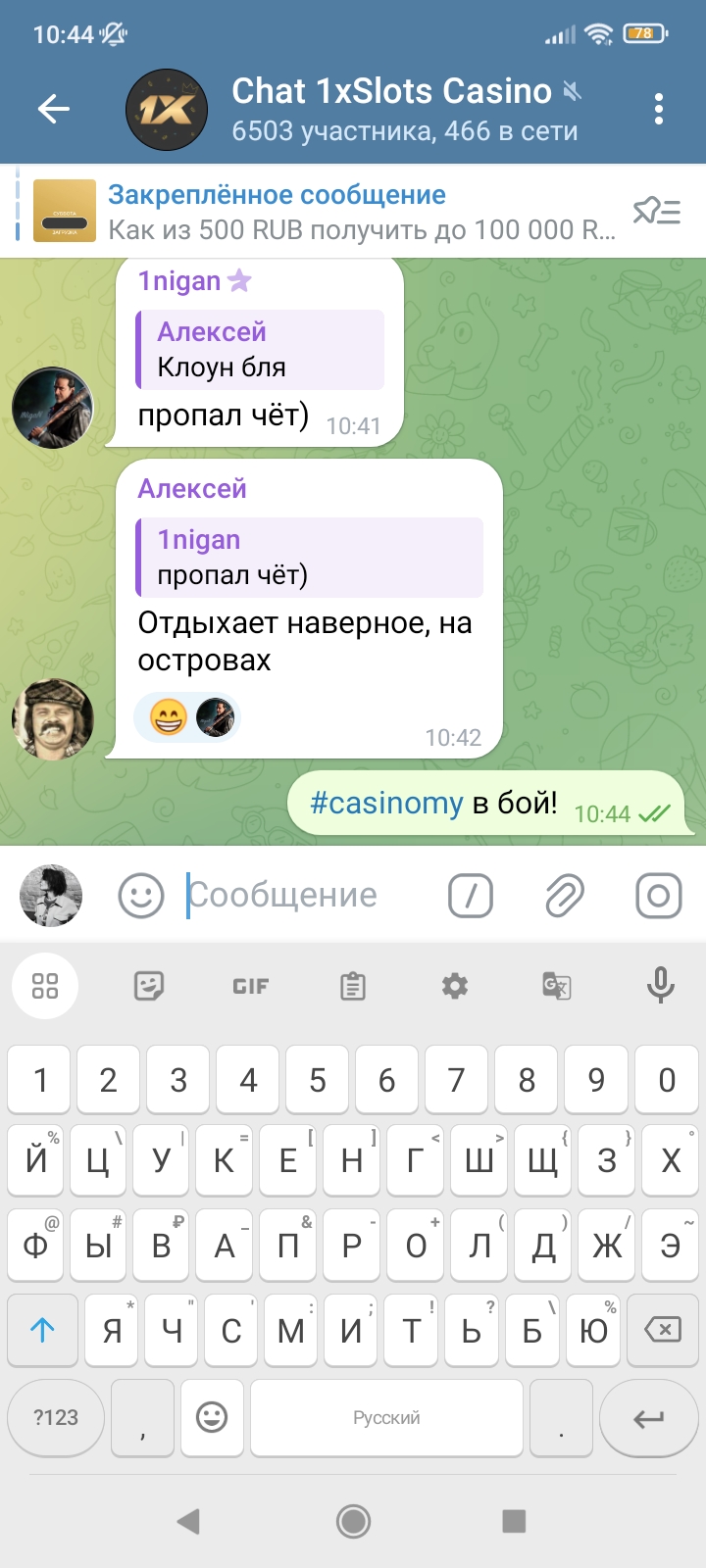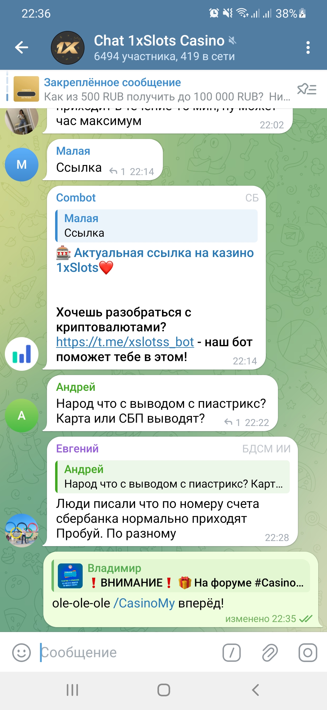 2) Быть подписанным на наш новый форум в телеграмм https://t.me/forumcasinomy, чат https://t.me/casinomyforum и чат казино 1xSlots https://t.me/joinchat/TCG5aNJ_qCpI6SdO, в телеграмм чате 1xSlots https://t.me/joinchat/TCG5aNJ_qCpI6SdO написать любое сообщение с тегом #casinomy и разместить текст этого сообщения в этой теме вместе со скрином депозита.